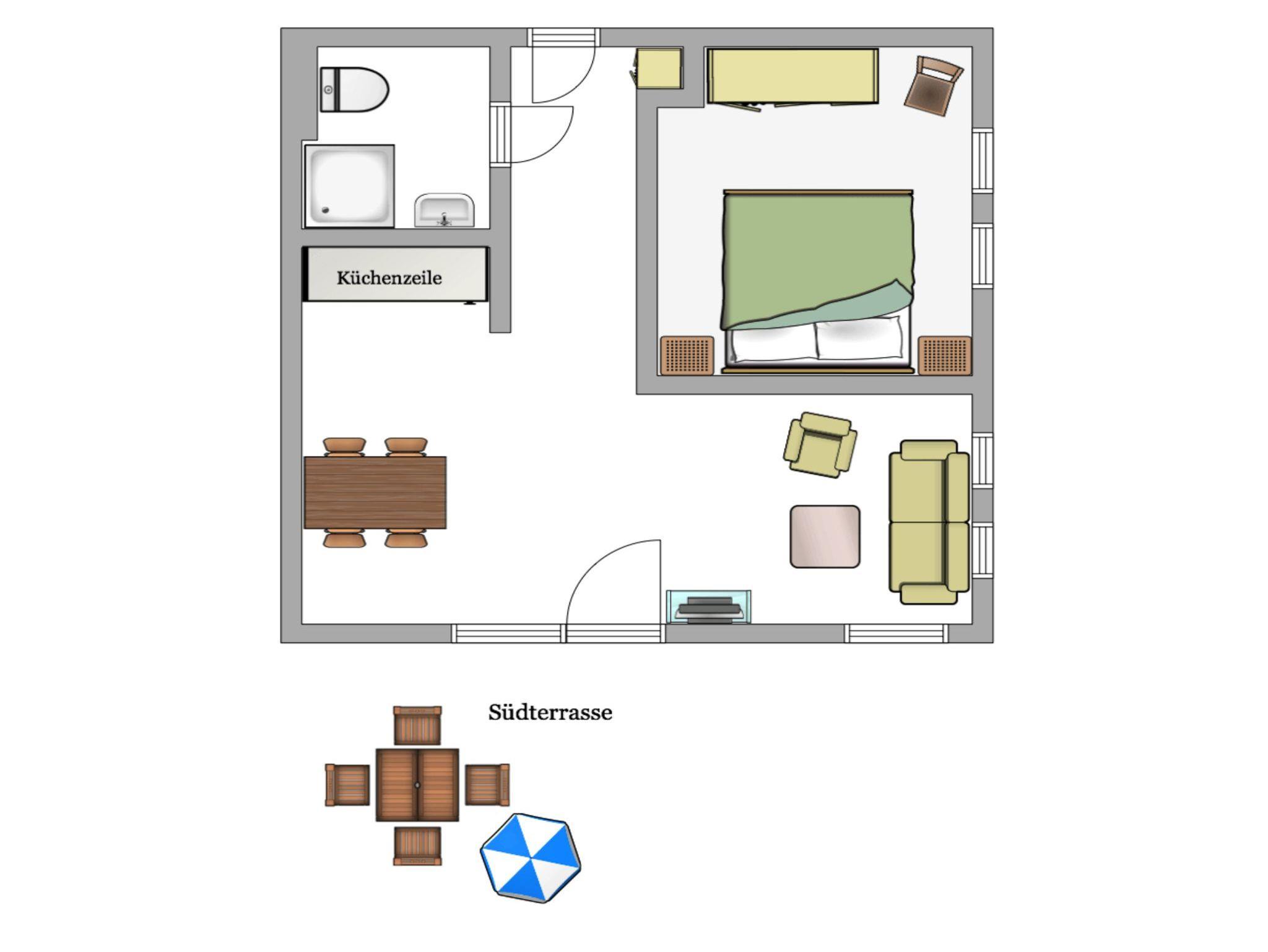 • Eine möblierte Südterrasse, an sonnigen Tagen haben Sie von morgens bis abends Sonne und natürlich einen Sonnenschirm.