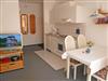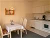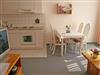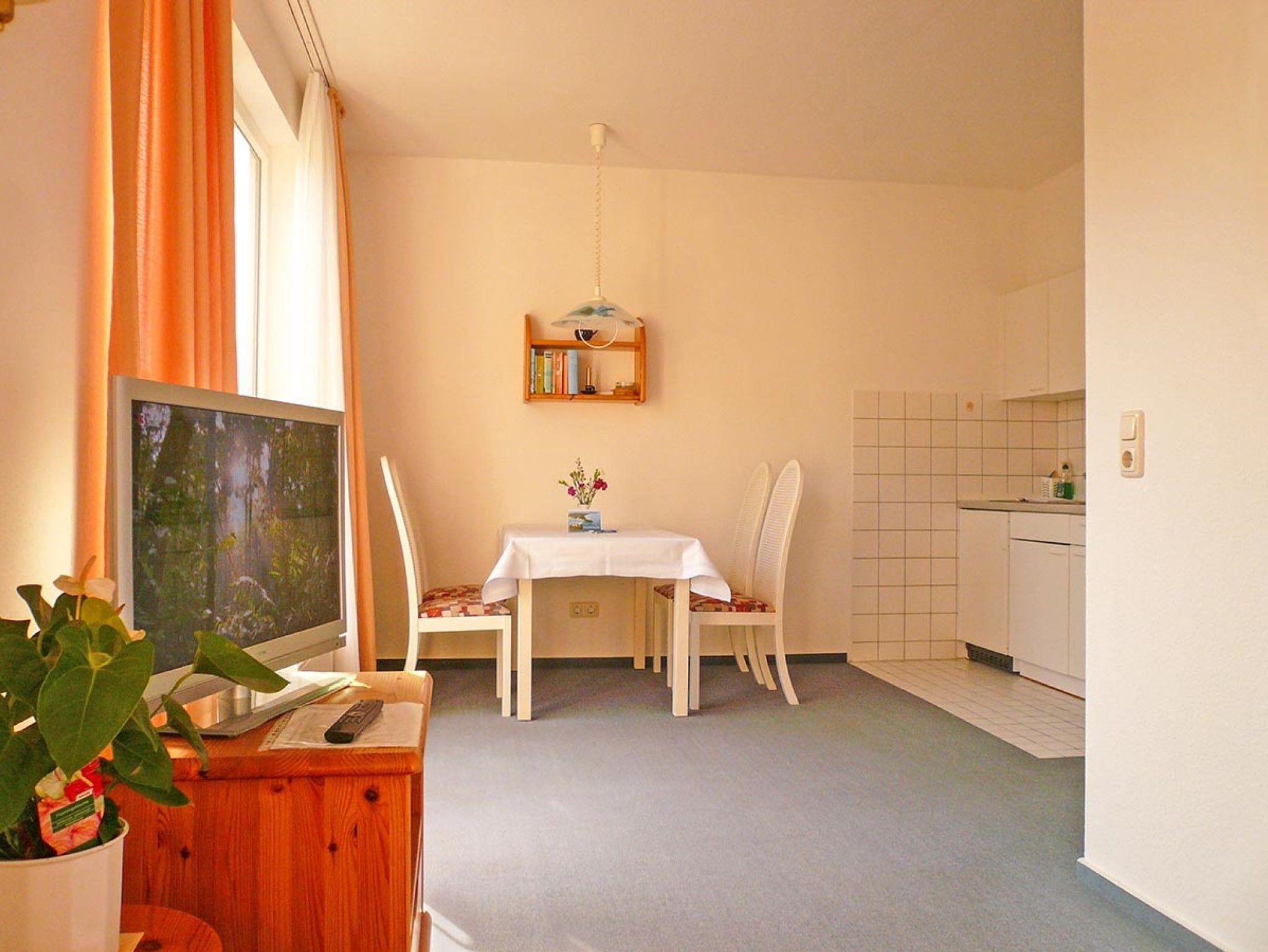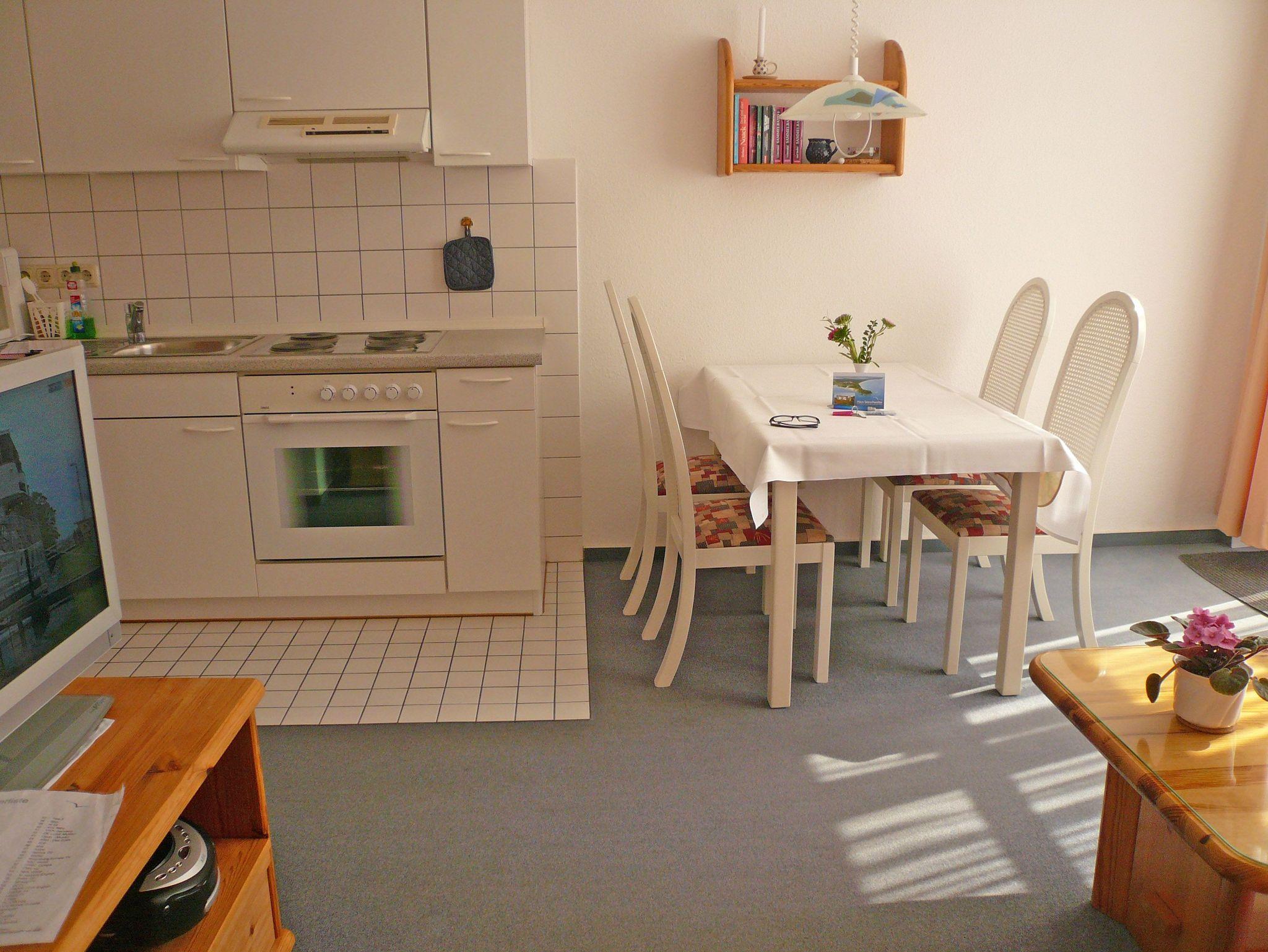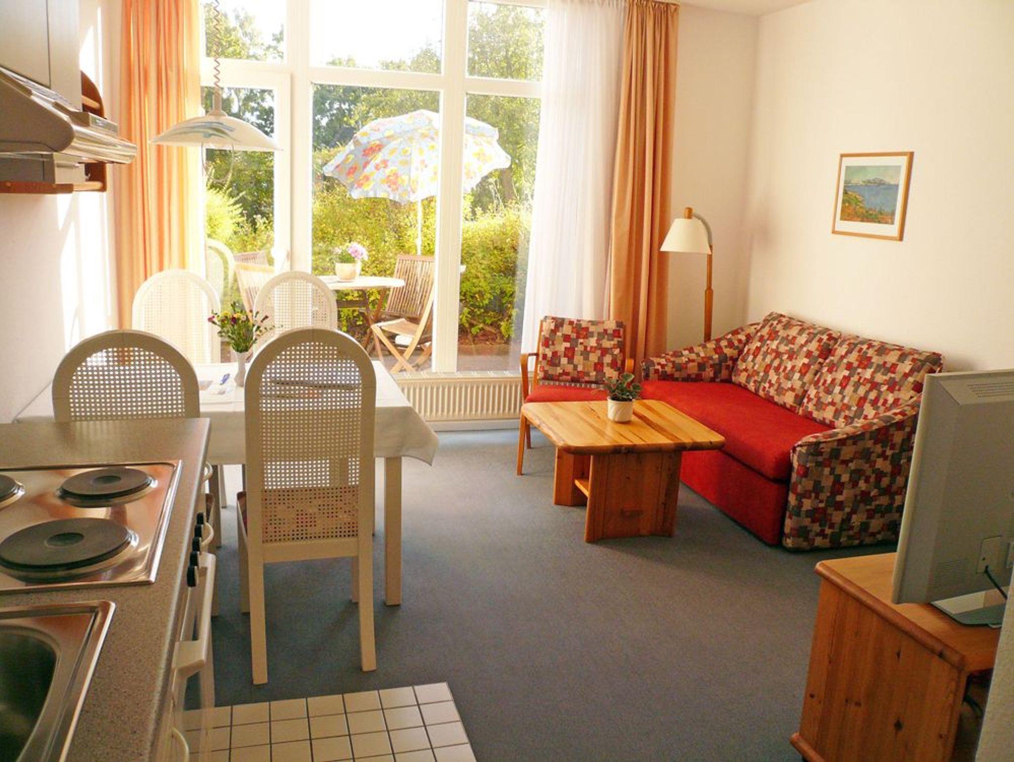 • Ein Wohnzimmer mit Couchecke und Flachbild TV (Sat TV). Integriert ist die gut ausgestattete Küchenzeile mit Herd, Backofen, Kühlschrank mit Gefrierfach, Kaffeemaschine, Wasserkocher, Toaster sowie eine Sitzecke.