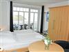 kombinierter Wohn-/Schlafraum mit Doppelbett (180 x 200 cm), Nachttischen, großem Kleiderschrank, Tisch mit 2 Ledersesseln, Anrichte mit TV, Kofferablage