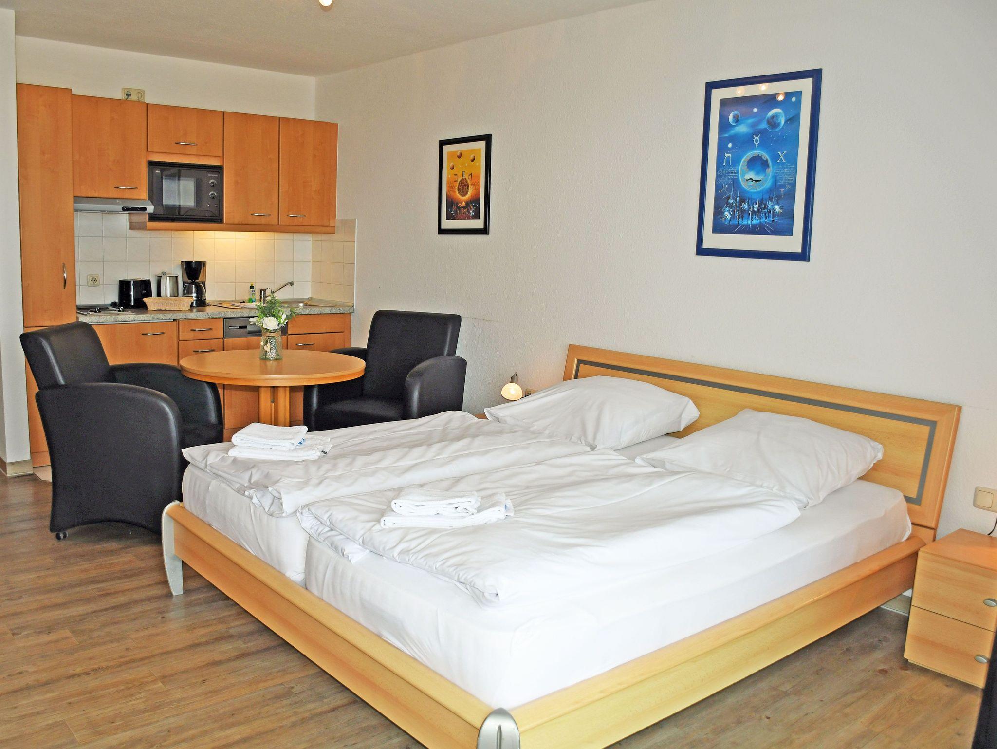 Unsere ruhig gelegenen, hellen und lichtdurchfluteten 1-Raum-Ferienwohnungen mit Balkon oder Terrasse sind wie folgt ausgestattet: