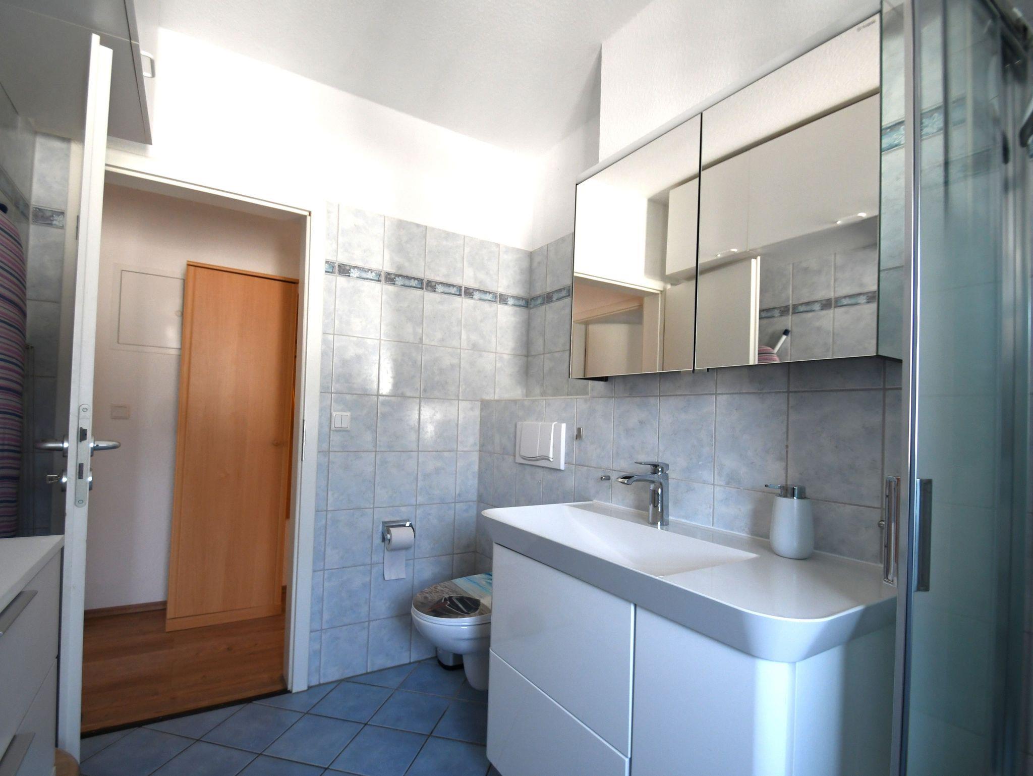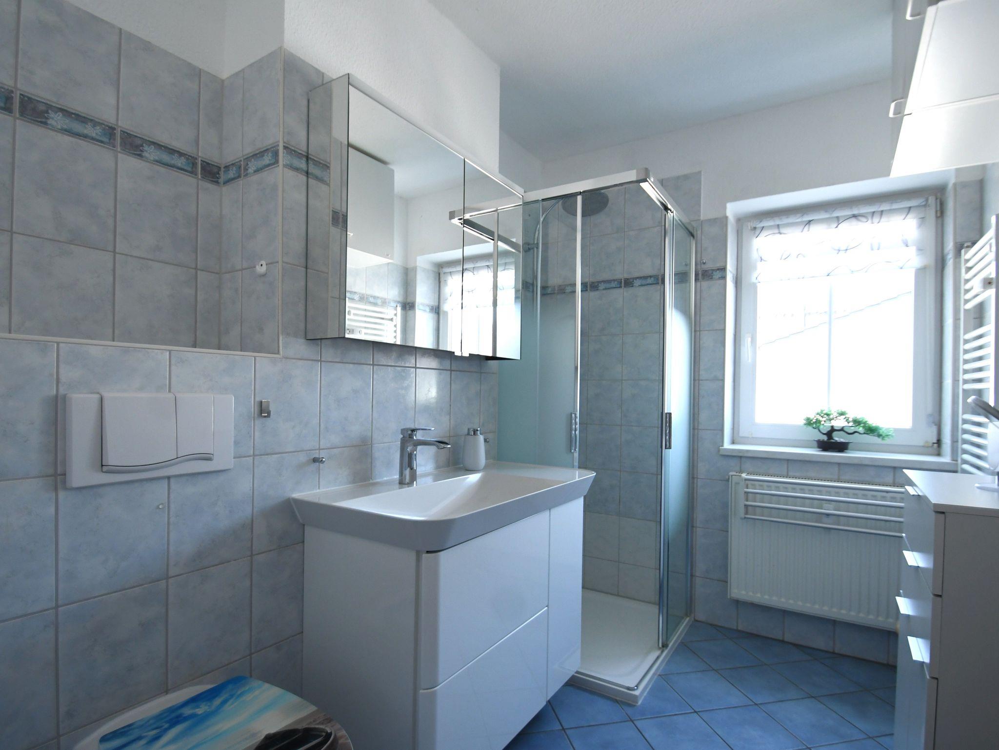 • Tageslichtbad mit Dusche, Waschplatz, Handtuchtrockner, WC und Fön