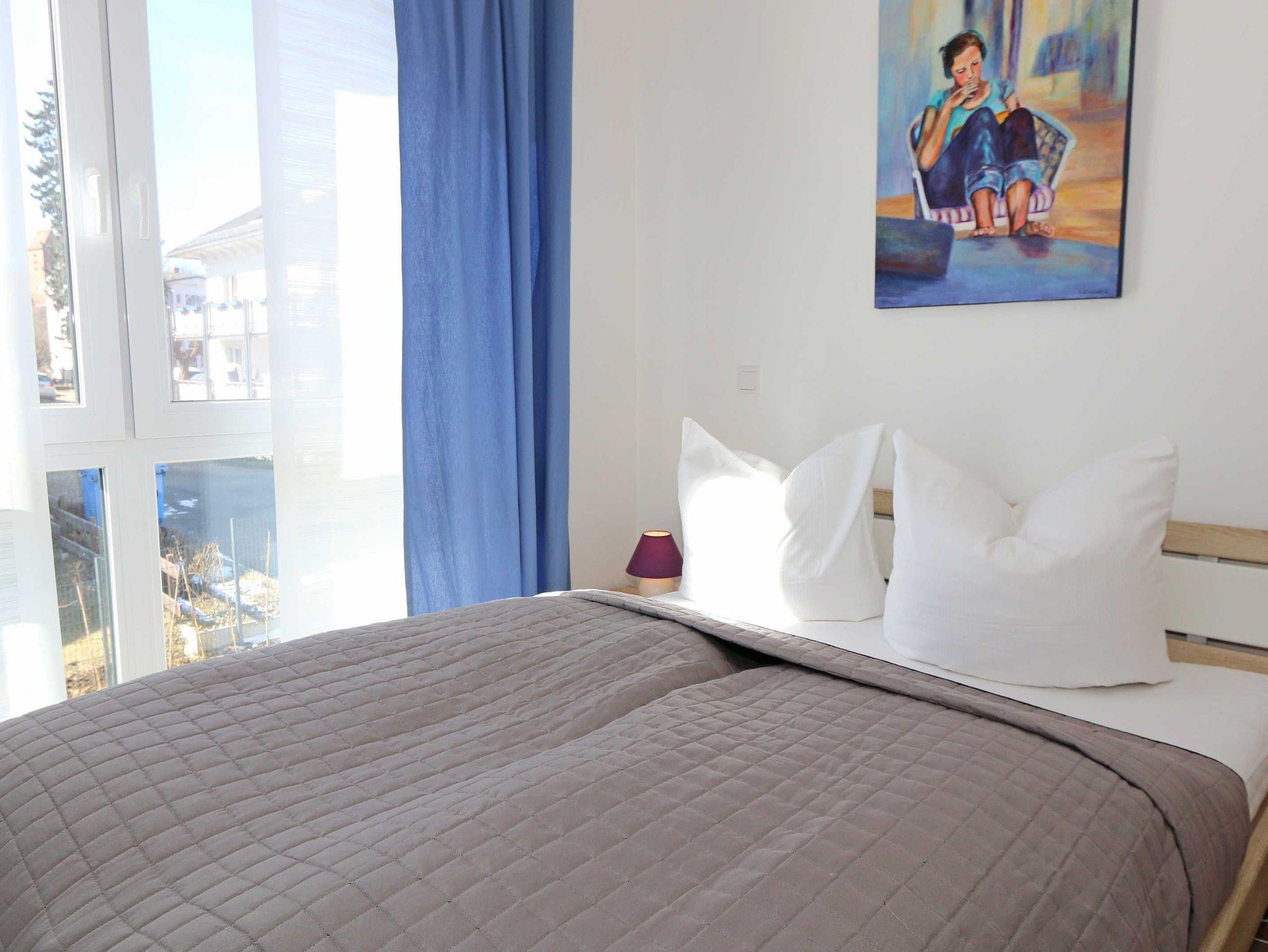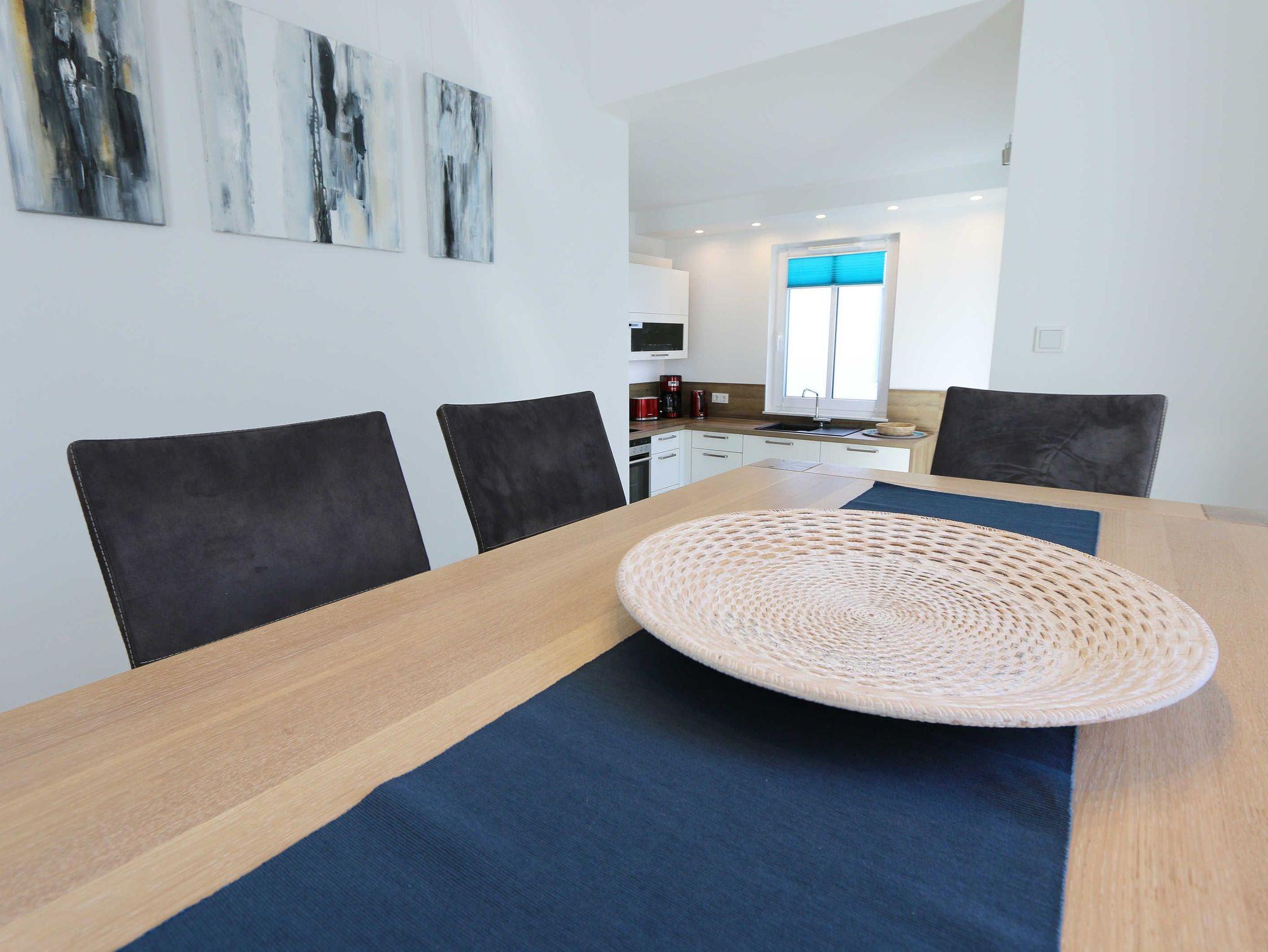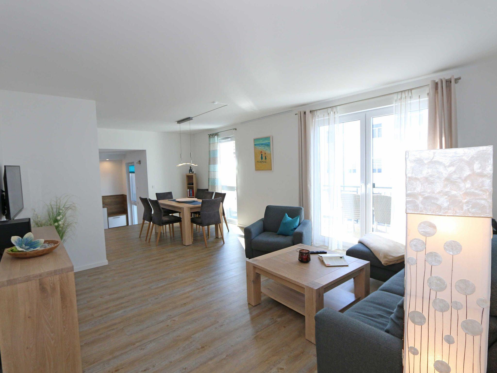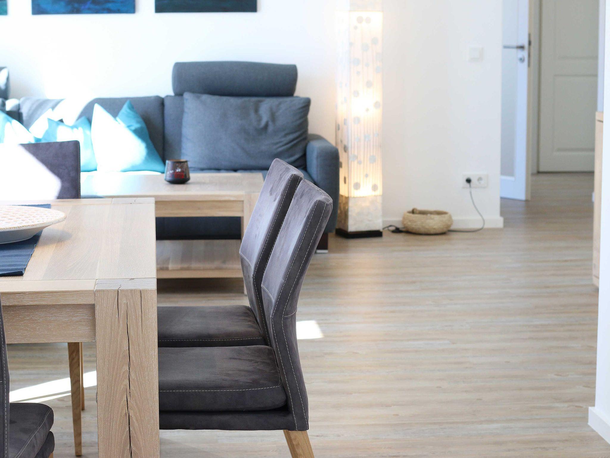 Die Wohnung Nr. 6 der Villa Anni ist eine komfortable, ca. 82 m² große und stilvoll eingerichtete Nichtraucherferienwohnung im ersten Obergeschoss. Sie bietet mit ihren 3 Schlafzimmern ausreichend Platz für 5 Erwachsene + 1 Kleinkind bis 3 Jahre im Kinderreisebett. Der kombinierte Wohn-/Koch- und Essbereich mit der modernen und integrierten Küchenzeile lässt mit Ceranfeld, Backofen, Geschirrspüler, Mikrowelle, Kühlschrank mit Gefrierfach, Kaffeemaschine, Wasserkocher, Toaster und diversen Küchenutensilien keine Wünsche offen. Der Essbereich fügt sich der Küchenzeile an. Der offene Wohnbereich verfügt über eine gemütliche Sitzecke mit Couchtisch, einen Sessel, eine Leselampe, ein Smart-TV mit CD-Player, DAB-Radio und einen Blu Ray Player. Auch auf einen Internetanschluss (WLAN) müssen Sie in Ihrem Urlaub nicht verzichten. Dieser ist für Sie inklusive! Eine Auswahl an Gesellschaftsspielen und Urlaubslektüre sorgt für eine gelungene Abwechslung. Der nach Westen ausgerichtete, bestuhlte Balkon mit Sonnenschirm ist direkt vom Wohnbereich aus zu erreichen. Das erste Schlafzimmer verfügt über ein Doppelbett mit Kaltschaummatratzen (1,60m x 2,00m), verstellbaren Lattenrosten, Nachttischablagen und einen Kleiderschrank. Das zweite Schlafzimmer verfügt über ein Doppelbett mit einer durchgehenden Kaltschaummatratze (1,40m x 2,00m), Nachttischablagen, Smart-TV und einen Kleiderschrank. Im dritten Schlafzimmer befindet sich ein Einzelbett (0,90m x 2,00m). Für einen ruhigen Schlaf sorgt in allen 3 Schlafzimmern eine Verdunklungsmöglichkeit. Das erste Bad ist mit einer ebenerdigen Dusche, Waschplatz, WC, Handtuchheizkörper und Fön ausgestattet. Im zweiten Bad befinden sich neben einem WC und einem Waschplatz auch eine Waschmaschine. In den Schlafzimmern und in der Küche sind Insektenschutzgitter vorhanden. Alle Räumlichkeiten sind mit einer Fußbodenheizung versehen und sorgen für eine angenehme Wärme. Für unsere kleinen Gäste steht 1x Kinderhochstuhl sowie 1x Kinderreisebett (ohne Zusatzmatratze und ohne Bettinlett) inklusive zur Verfügung. Ein eigener PKW-Stellplatz (Nr. 6) befindet sich in der Tiefgarage (Einfahrtshöhe: 2,00 m) des Hauses. Haustiere sind in der Wohnung nicht erlaubt! Die Erstausstattung eines Wäschepaketes (komplette Bettwäsche, 1 Duschhandtuch, 2 kleine Handtücher) können Sie bis 14 Tage vor Anreise gegen einen Aufpreis dazu buchen oder durch eigene ergänzen. Ab 2 gebuchten Paketen erhalten Sie einmalig 1 Geschirrhandtuch und 1 Duschvorleger hinzu.