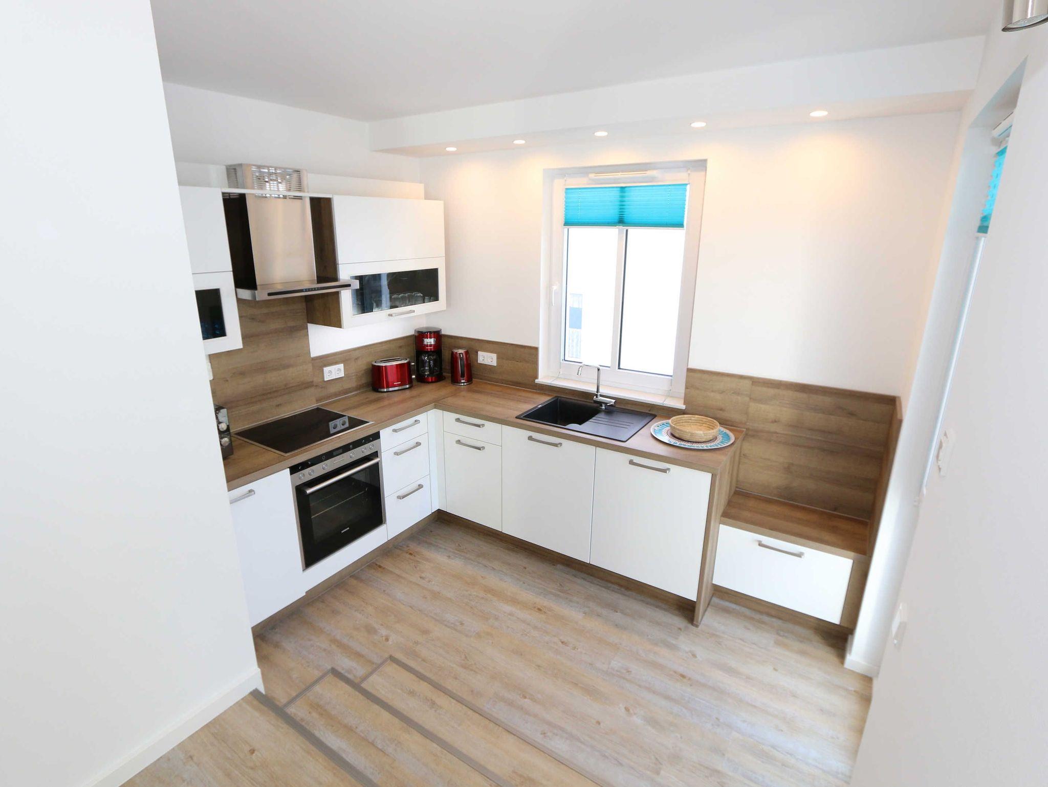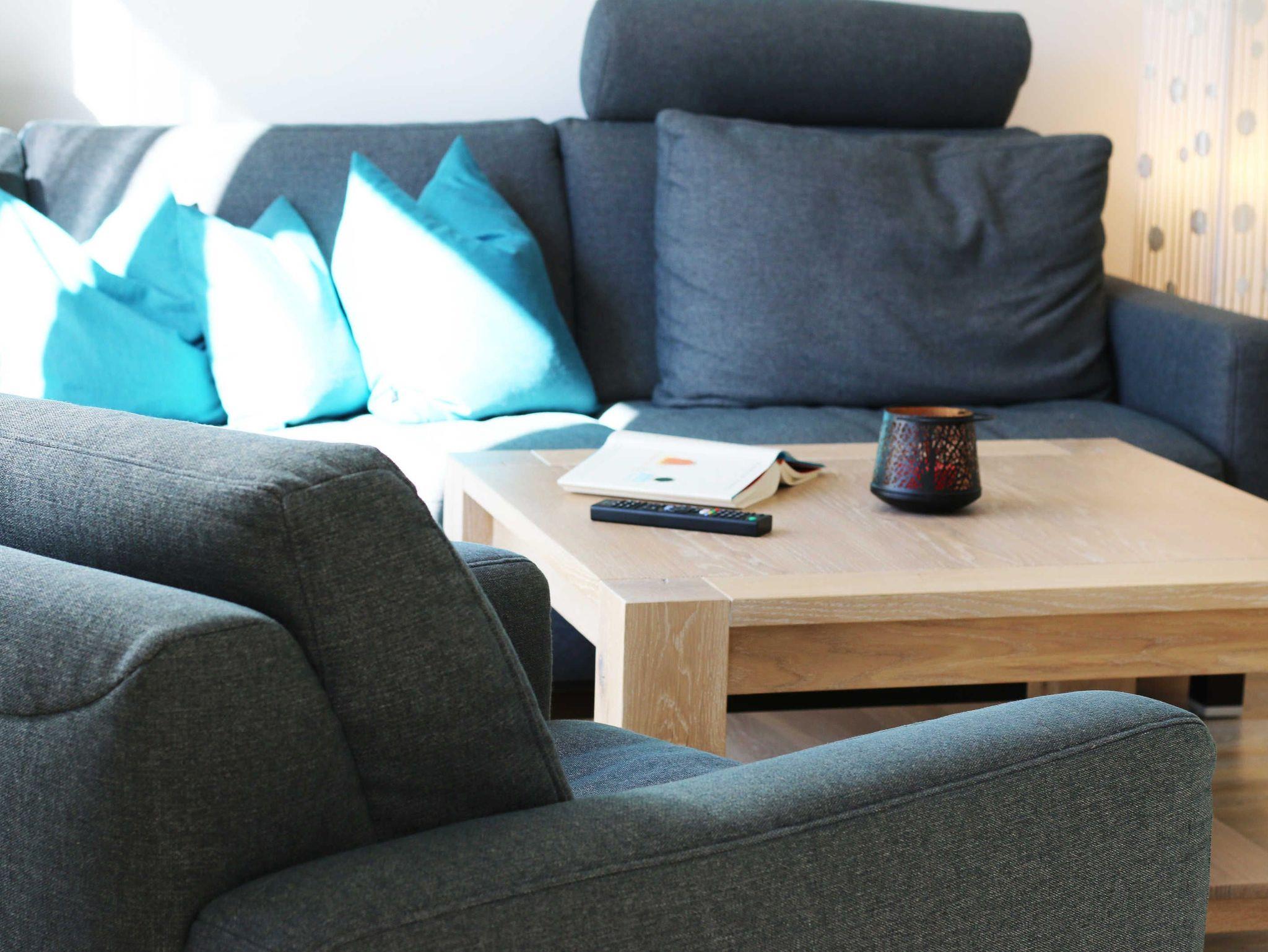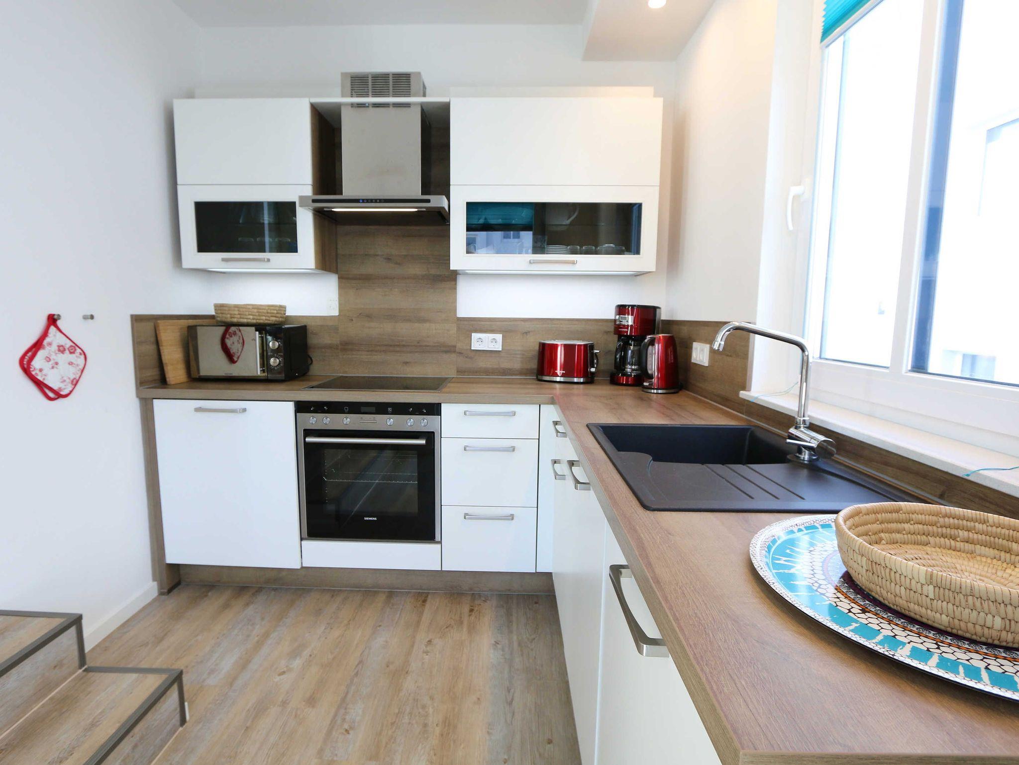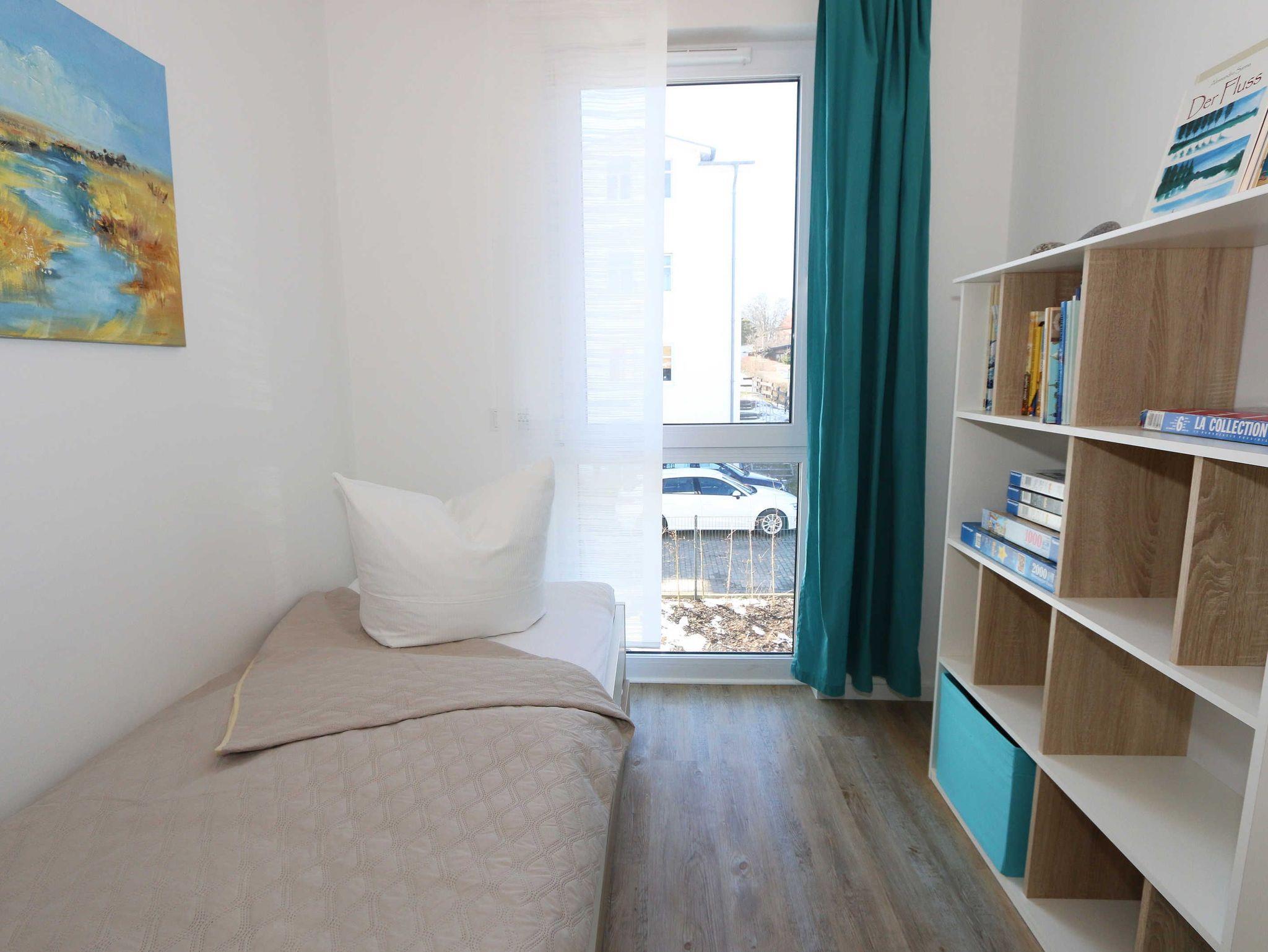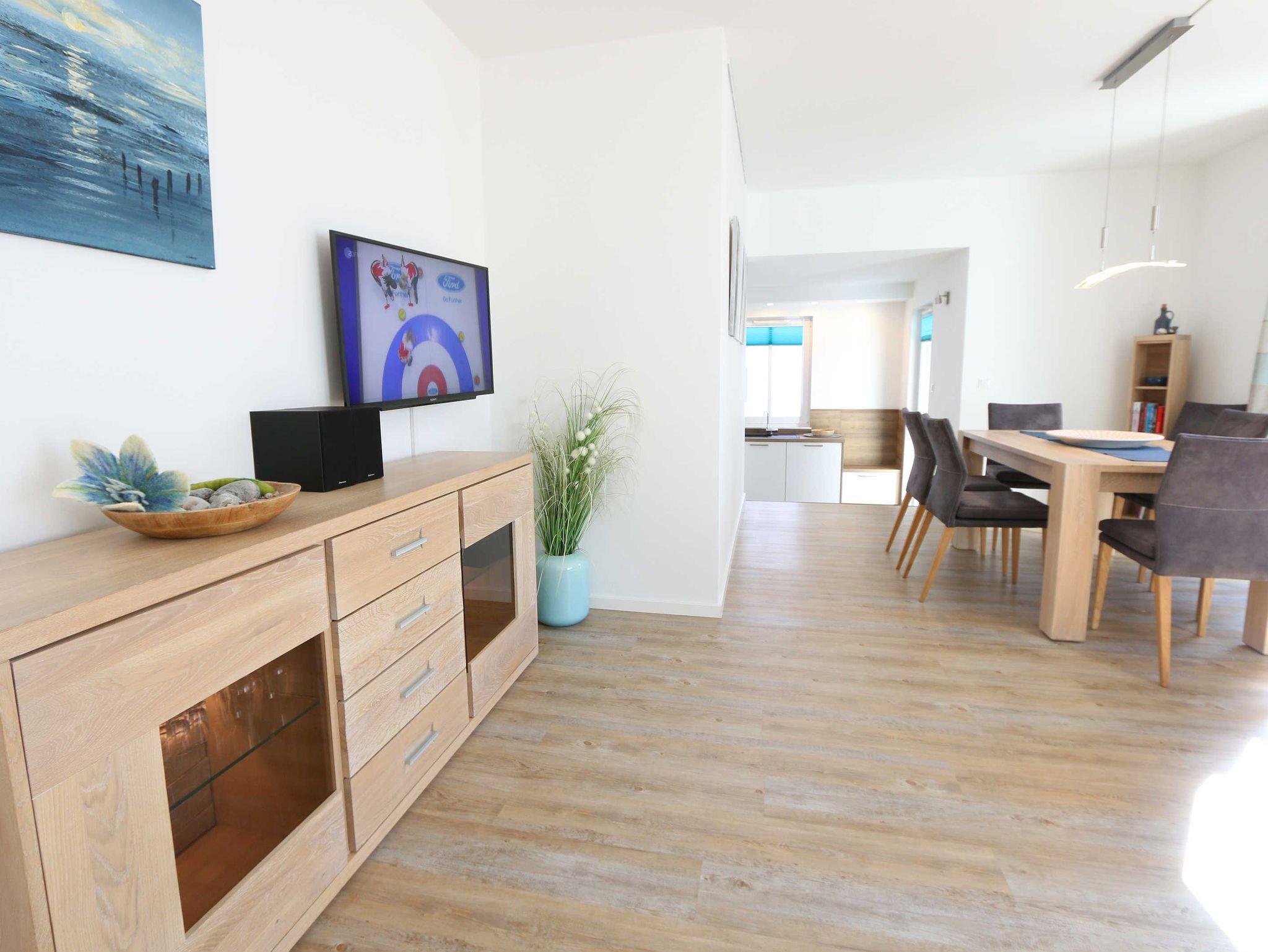 Die Wohnung Nr. 6 der Villa Anni ist eine komfortable, ca. 82 m² große und stilvoll eingerichtete Nichtraucherferienwohnung im ersten Obergeschoss. Sie bietet mit ihren 3 Schlafzimmern ausreichend Platz für 5 Erwachsene + 1 Kleinkind bis 3 Jahre im Kinderreisebett. Der kombinierte Wohn-/Koch- und Essbereich mit der modernen und integrierten Küchenzeile lässt mit Ceranfeld, Backofen, Geschirrspüler, Mikrowelle, Kühlschrank mit Gefrierfach, Kaffeemaschine, Wasserkocher, Toaster und diversen Küchenutensilien keine Wünsche offen. Der Essbereich fügt sich der Küchenzeile an. Der offene Wohnbereich verfügt über eine gemütliche Sitzecke mit Couchtisch, einen Sessel, eine Leselampe, ein Smart-TV mit CD-Player, DAB-Radio und einen Blu Ray Player. Auch auf einen Internetanschluss (WLAN) müssen Sie in Ihrem Urlaub nicht verzichten. Dieser ist für Sie inklusive! Eine Auswahl an Gesellschaftsspielen und Urlaubslektüre sorgt für eine gelungene Abwechslung. Der nach Westen ausgerichtete, bestuhlte Balkon mit Sonnenschirm ist direkt vom Wohnbereich aus zu erreichen. Das erste Schlafzimmer verfügt über ein Doppelbett mit Kaltschaummatratzen (1,60m x 2,00m), verstellbaren Lattenrosten, Nachttischablagen und einen Kleiderschrank. Das zweite Schlafzimmer verfügt über ein Doppelbett mit einer durchgehenden Kaltschaummatratze (1,40m x 2,00m), Nachttischablagen, Smart-TV und einen Kleiderschrank. Im dritten Schlafzimmer befindet sich ein Einzelbett (0,90m x 2,00m). Für einen ruhigen Schlaf sorgt in allen 3 Schlafzimmern eine Verdunklungsmöglichkeit. Das erste Bad ist mit einer ebenerdigen Dusche, Waschplatz, WC, Handtuchheizkörper und Fön ausgestattet. Im zweiten Bad befinden sich neben einem WC und einem Waschplatz auch eine Waschmaschine. In den Schlafzimmern und in der Küche sind Insektenschutzgitter vorhanden. Alle Räumlichkeiten sind mit einer Fußbodenheizung versehen und sorgen für eine angenehme Wärme. Für unsere kleinen Gäste steht 1x Kinderhochstuhl sowie 1x Kinderreisebett (ohne Zusatzmatratze und ohne Bettinlett) inklusive zur Verfügung. Ein eigener PKW-Stellplatz (Nr. 6) befindet sich in der Tiefgarage (Einfahrtshöhe: 2,00 m) des Hauses. Haustiere sind in der Wohnung nicht erlaubt! Die Erstausstattung eines Wäschepaketes (komplette Bettwäsche, 1 Duschhandtuch, 2 kleine Handtücher) können Sie bis 14 Tage vor Anreise gegen einen Aufpreis dazu buchen oder durch eigene ergänzen. Ab 2 gebuchten Paketen erhalten Sie einmalig 1 Geschirrhandtuch und 1 Duschvorleger hinzu.