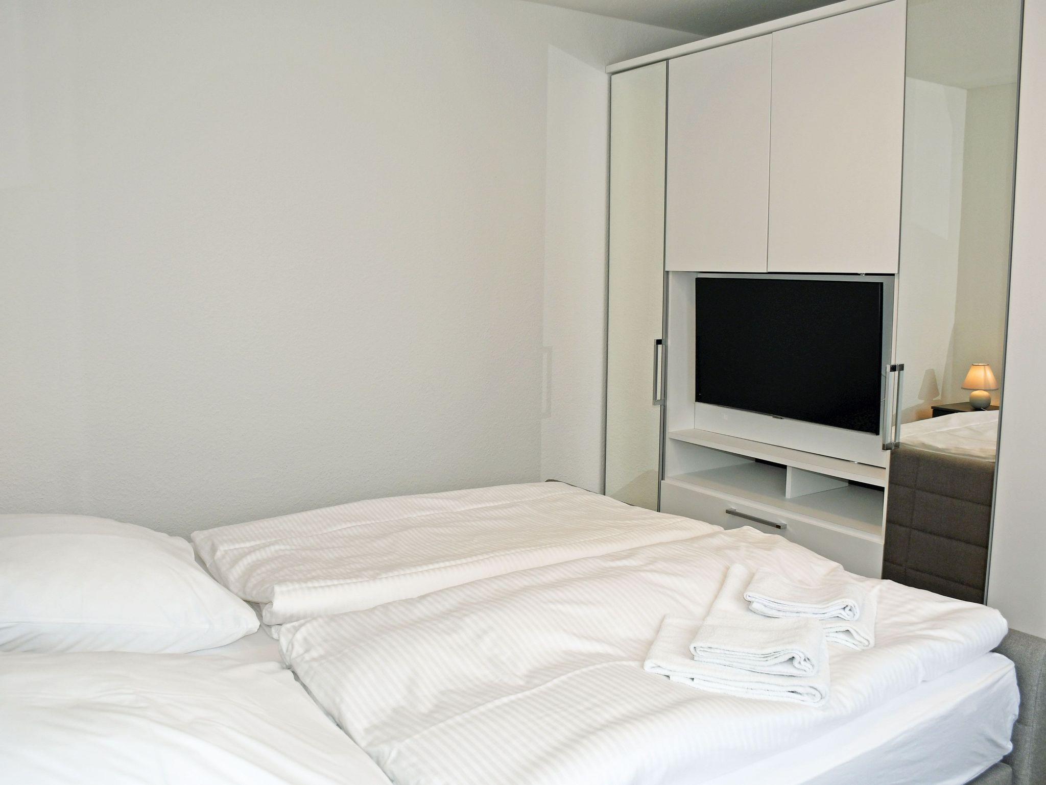 * Schlafzimmer mit einem Doppelbett (180 x 200 cm), Großem Kleiderschrank mit integriertem Flachbild Fernseher