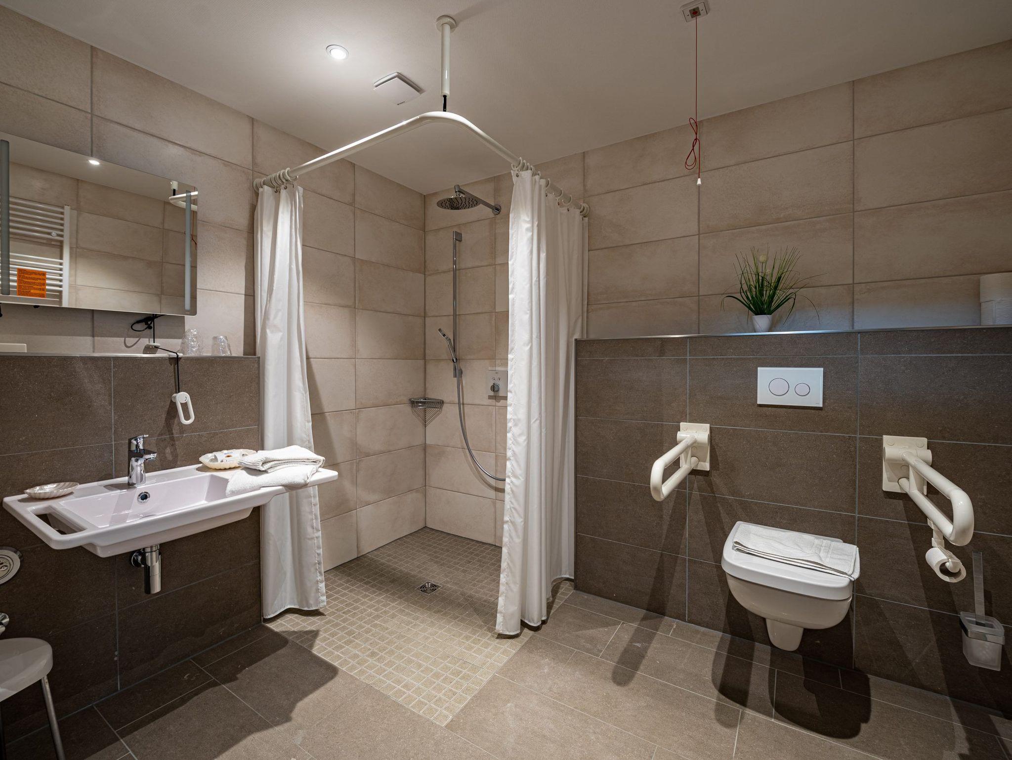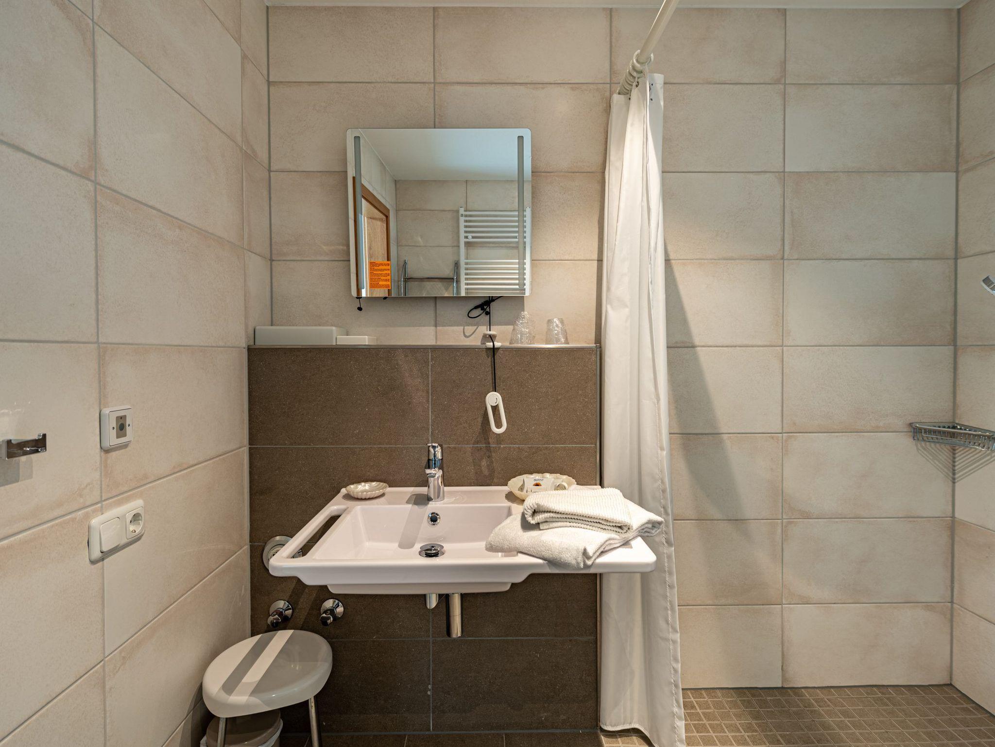 * Bad mit großer ebenerdiger Dusche, WC und Föhn