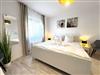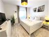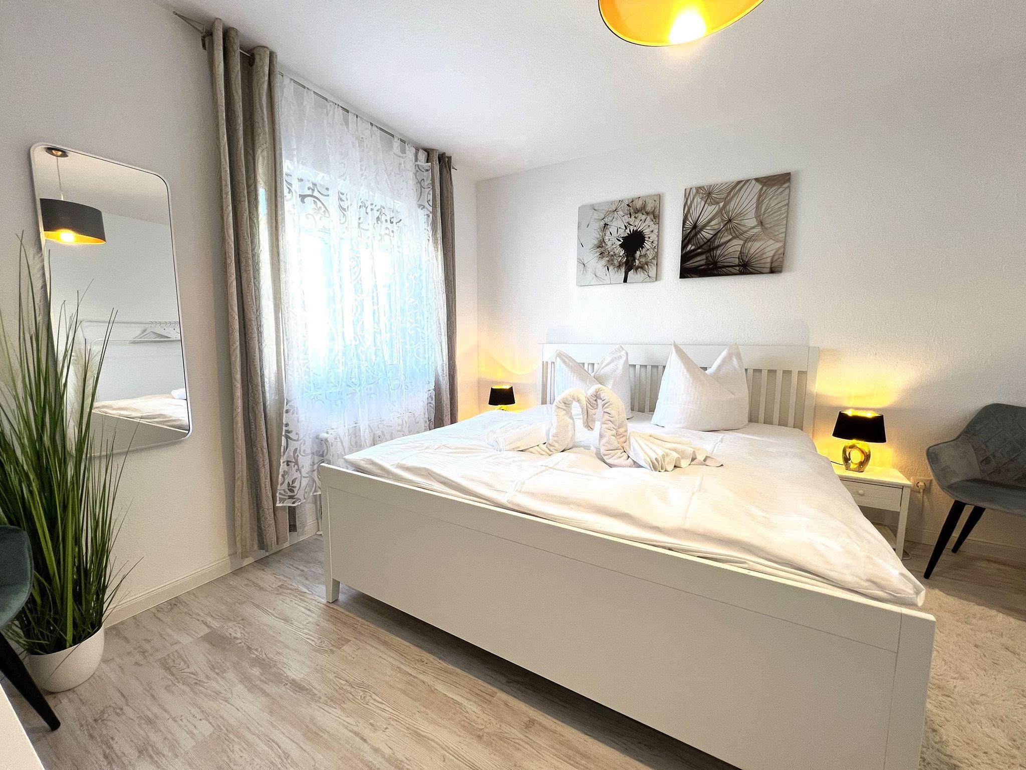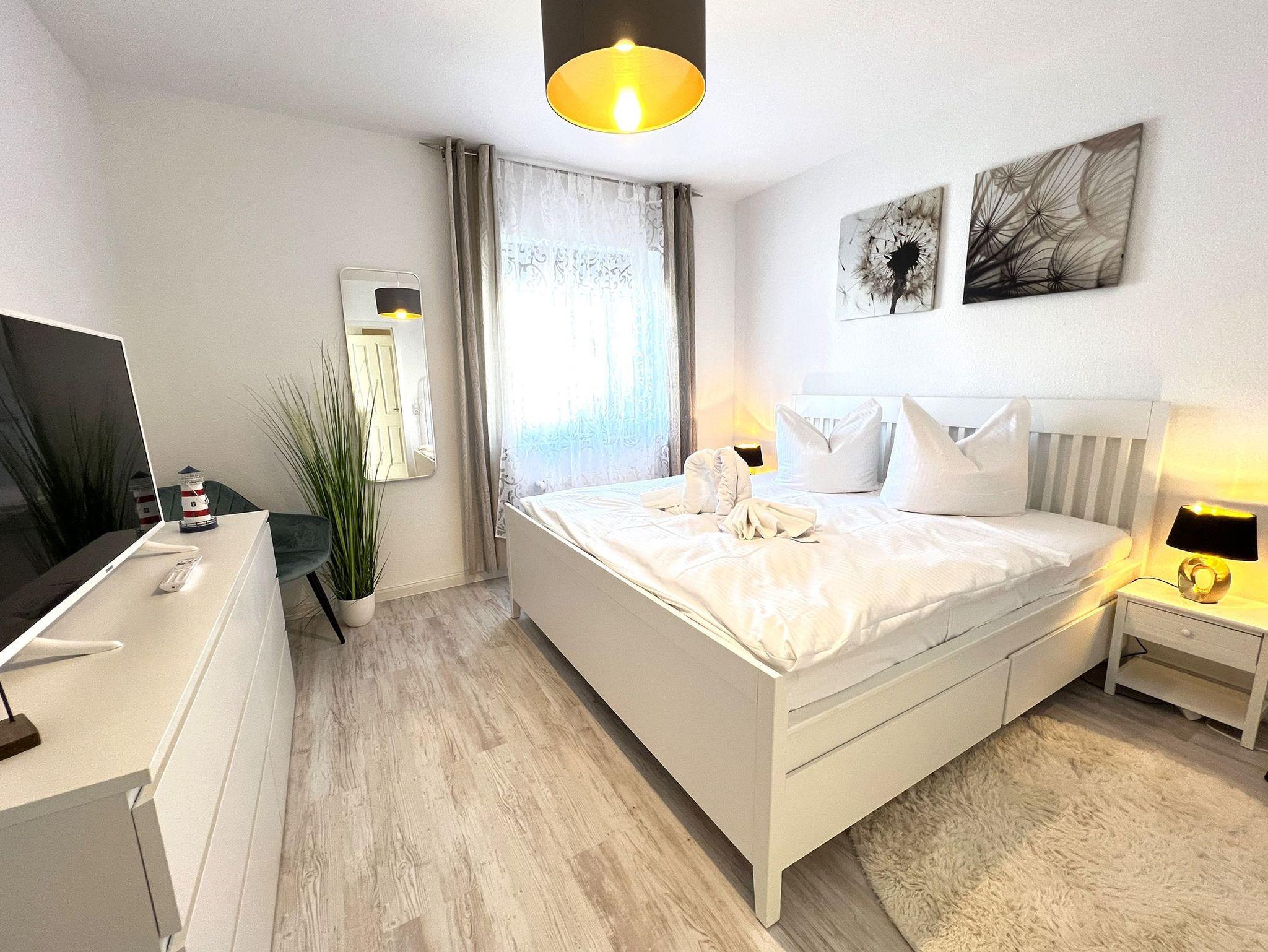 Das Schlafzimmer ist mit einem großzügigen Doppelbett ausgestattet und verspricht erholsame Nächte. Das moderne Bad verfügt über eine Glasdusche und wurde funktional und stilvoll gestaltet.