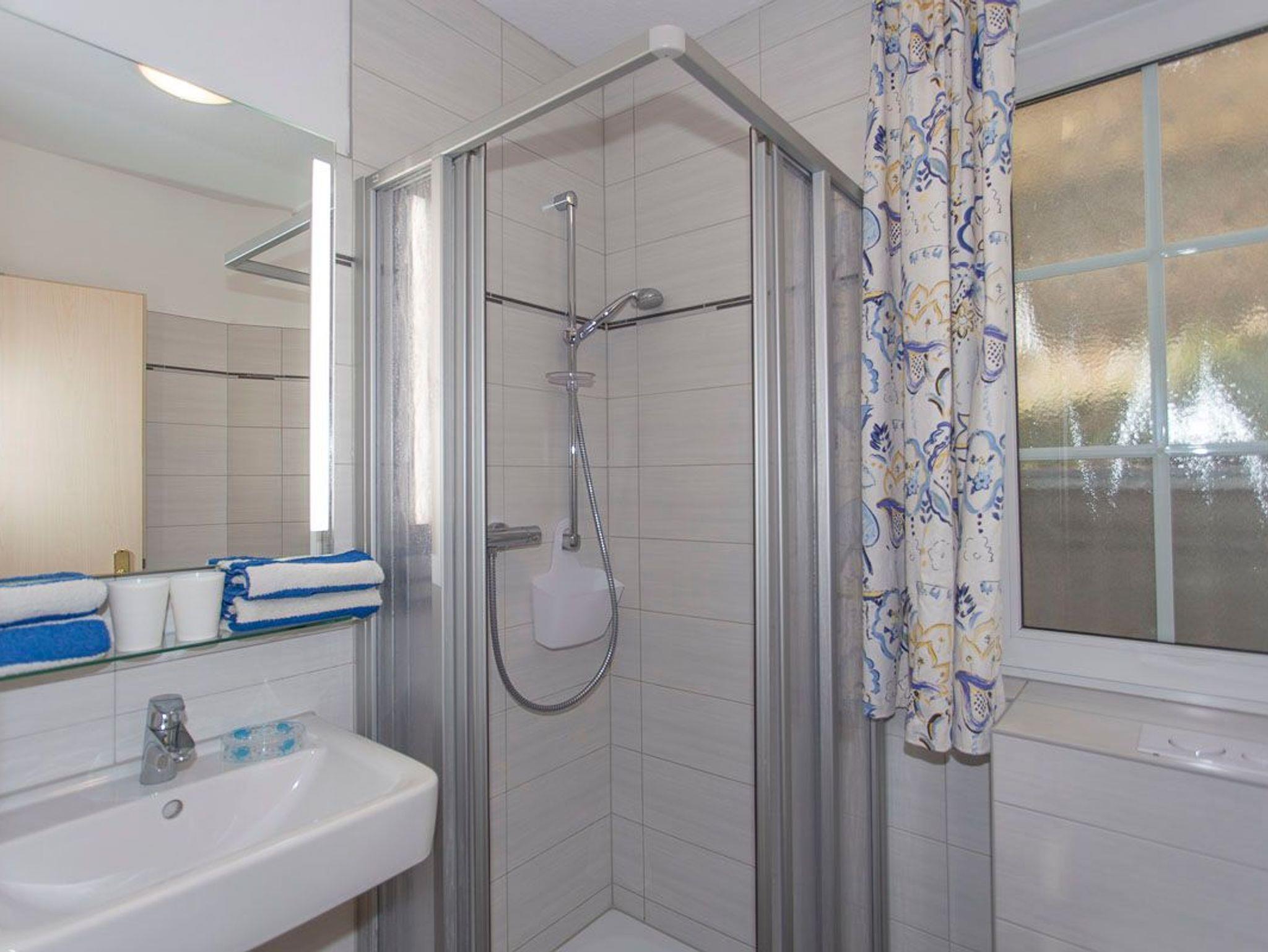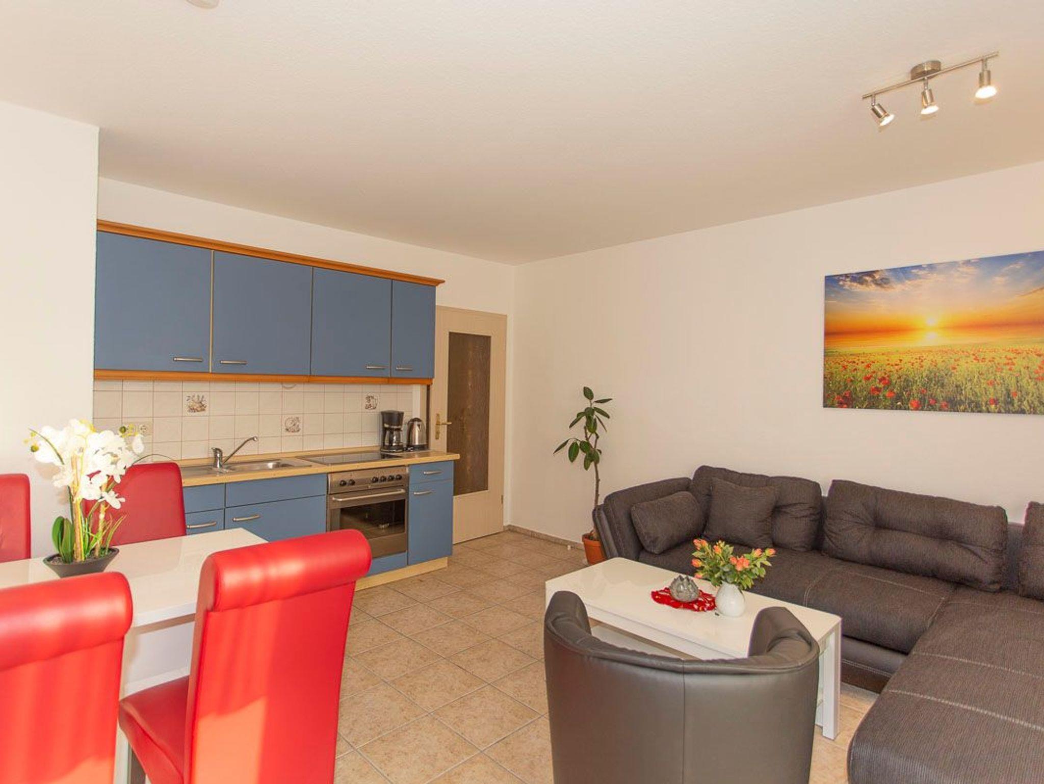 Die Zweiraumwohnung bestehend aus einem Wohnzimmer mit einer offenen Küchenzeile (Wasserkocher, Toaster, Ceranfeld, Backofen, Eierkocher), einem Schlafzimmer mit einem Doppelbett und einem Bad mit Dusche/WC.