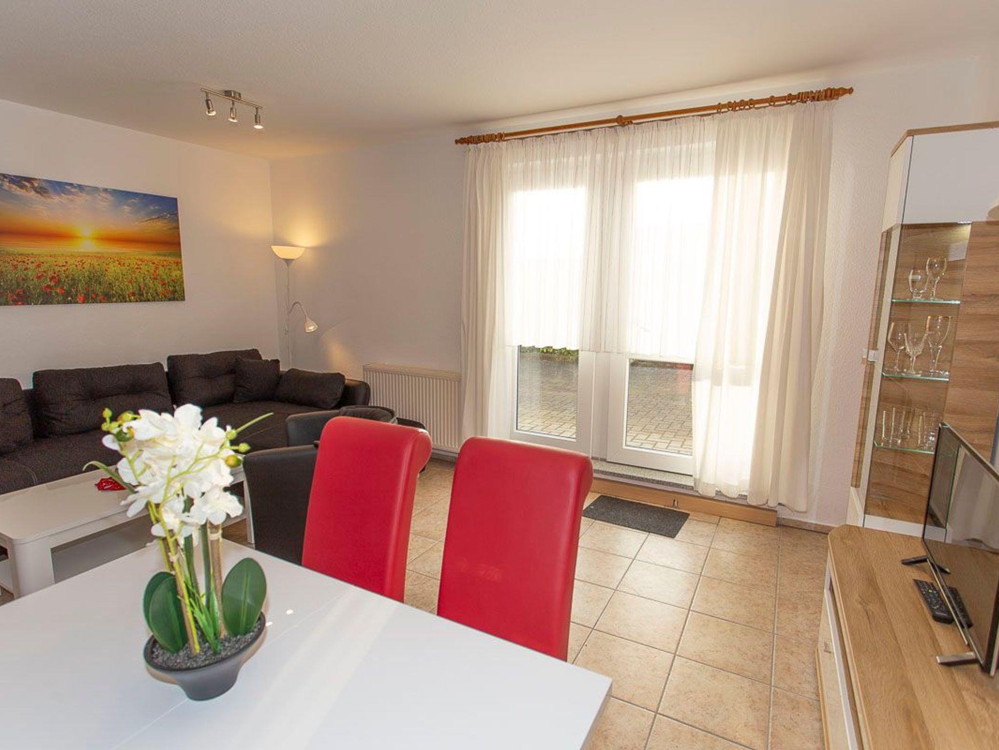 Die Ferienwohnung besitzt eine Terrasse. Ein Parkplatz, sowie Fahrradabstellmöglichkeiten befinden sich direkt am Haus. Die Ferienwohungen können auch mit leichten Geh-Einschränkungen genutzt werden, da sich keine Treppen zur und in der Ferienwohnung befinden.