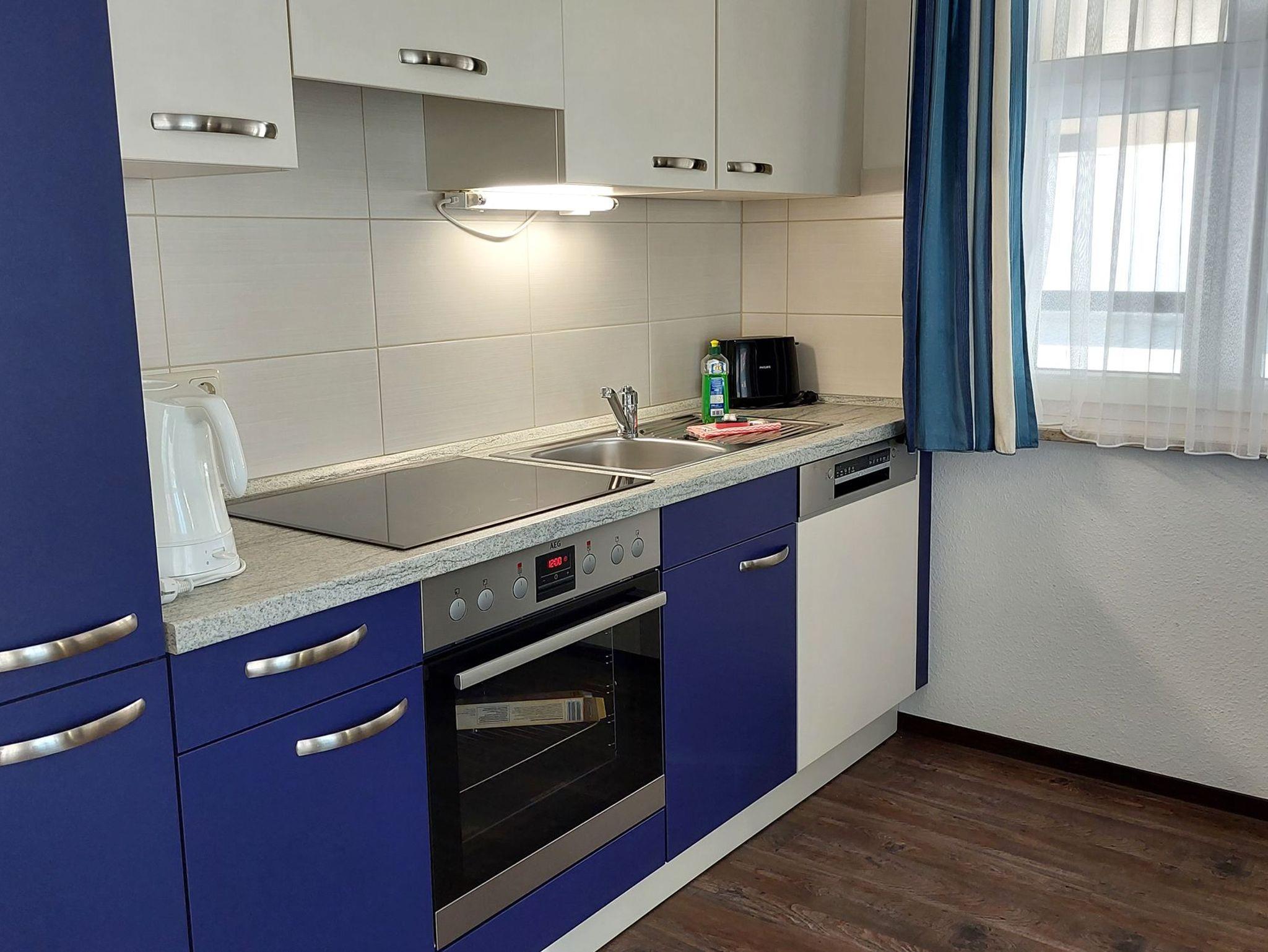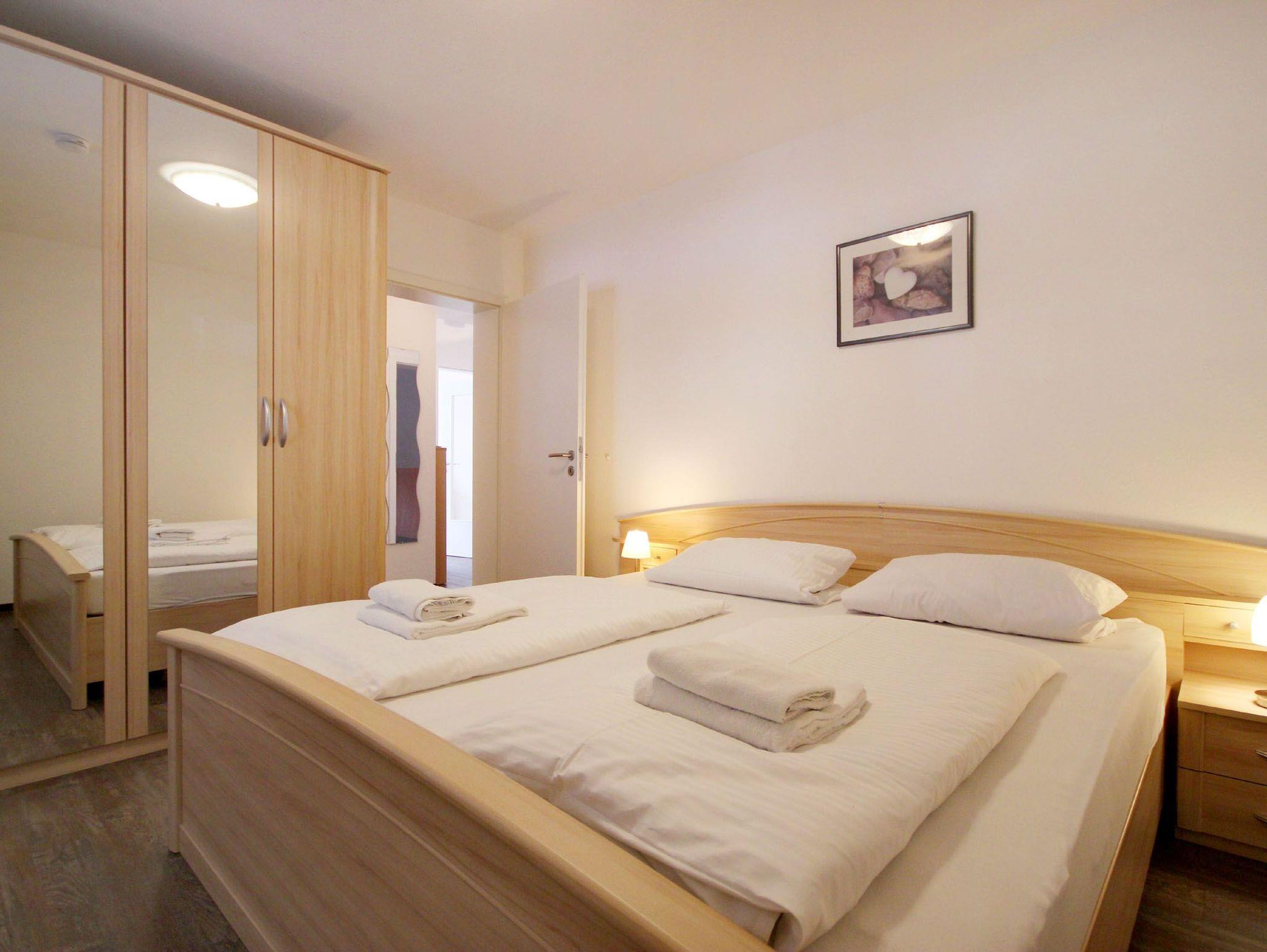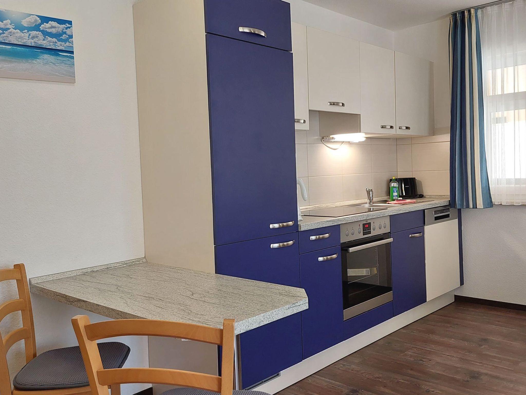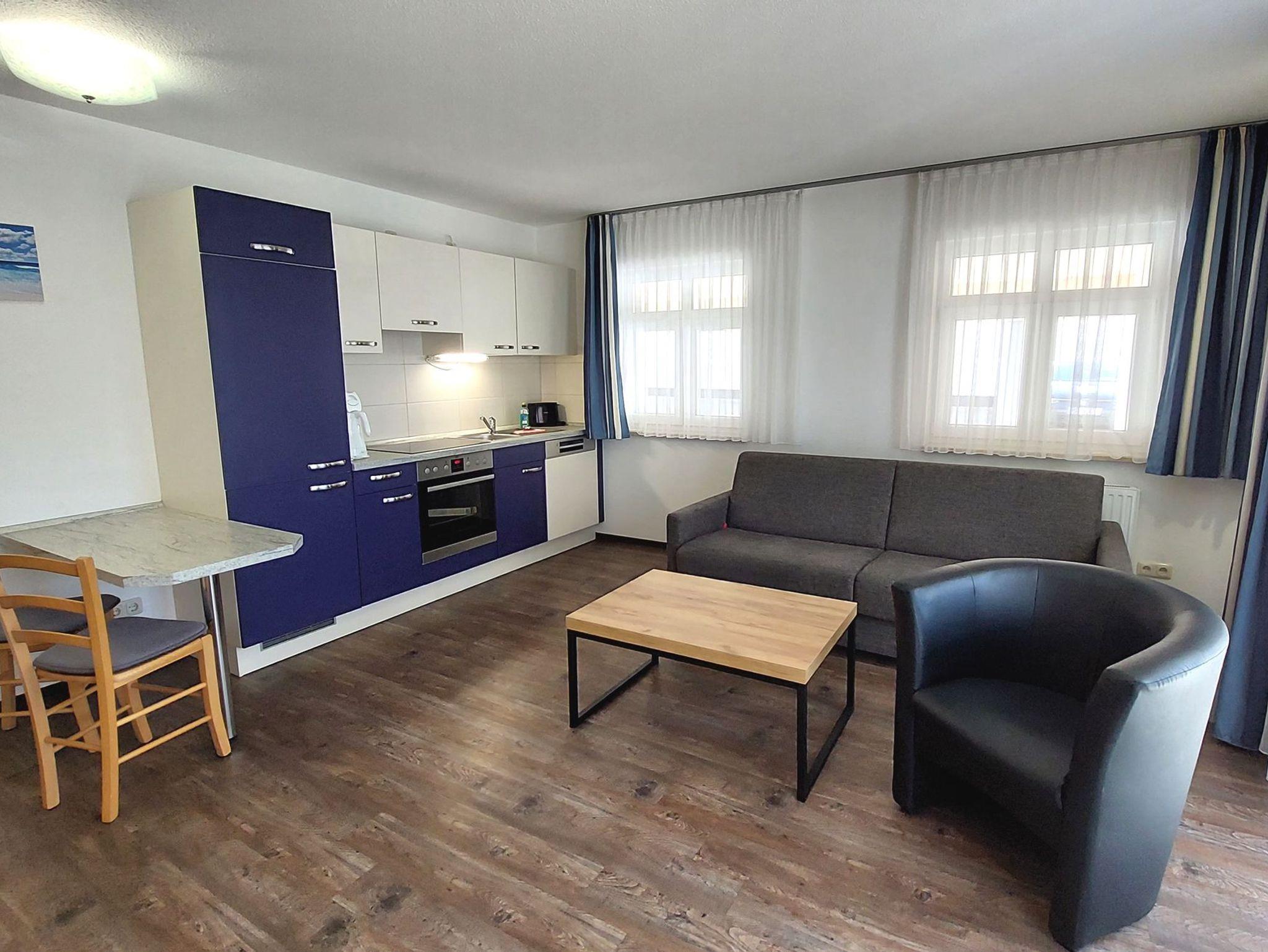 Diese freundliche Wohnung ist aufgeteilt in einen Wohnraum mit Terrasse und integrierter Küchenzeile, ein Schlafzimmer und ein Duschbad mit Waschtisch und WC. Das Wohnzimmer begrüßt Sie mit einem Schlafsofa und Sessel sowie Flachbild-TV. Das geräumige Schlafzimmer verfügt über ein Doppelbett (1,80m x 2m) sowie einen Kleiderschrank. Die Küchenzeile ist mit Backofen, Geschirrspüler, Cerankochfeld, Kühlschrank mit kleinem Gefrierfach, Cerankochfeld, Mikrowelle, Kaffeemaschine, Wasserkocher und Toaster ausgestattet. Highlights: Kostenfreies WLAN sowie ein frei wählbarer PKW-Stellplatz direkt am Haus. Haustiere sind in dieser Wohnung herzlich willkommen.