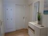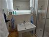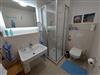 Das hell geflieste Bad ist zweckmäßig mit Dusche und WC, Waschbecken und Ablagen ausgestattet. Es wurde im Jahr 2022 renoviert.