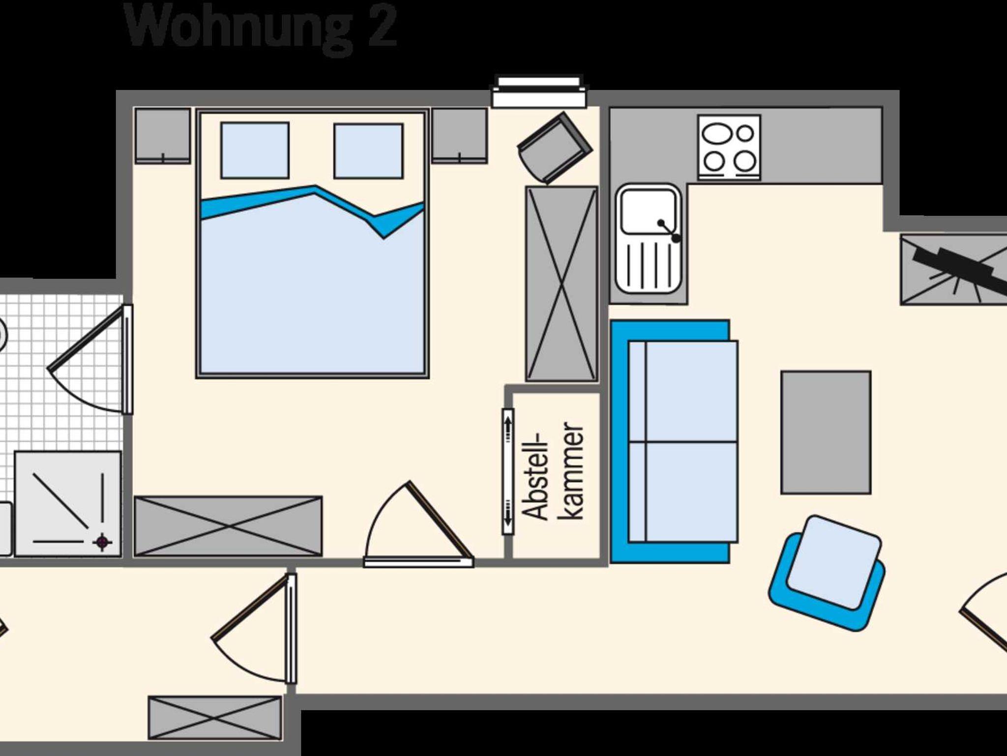 * Schlafzimmer, Duschbad/WC, Küche mit Wohnraum