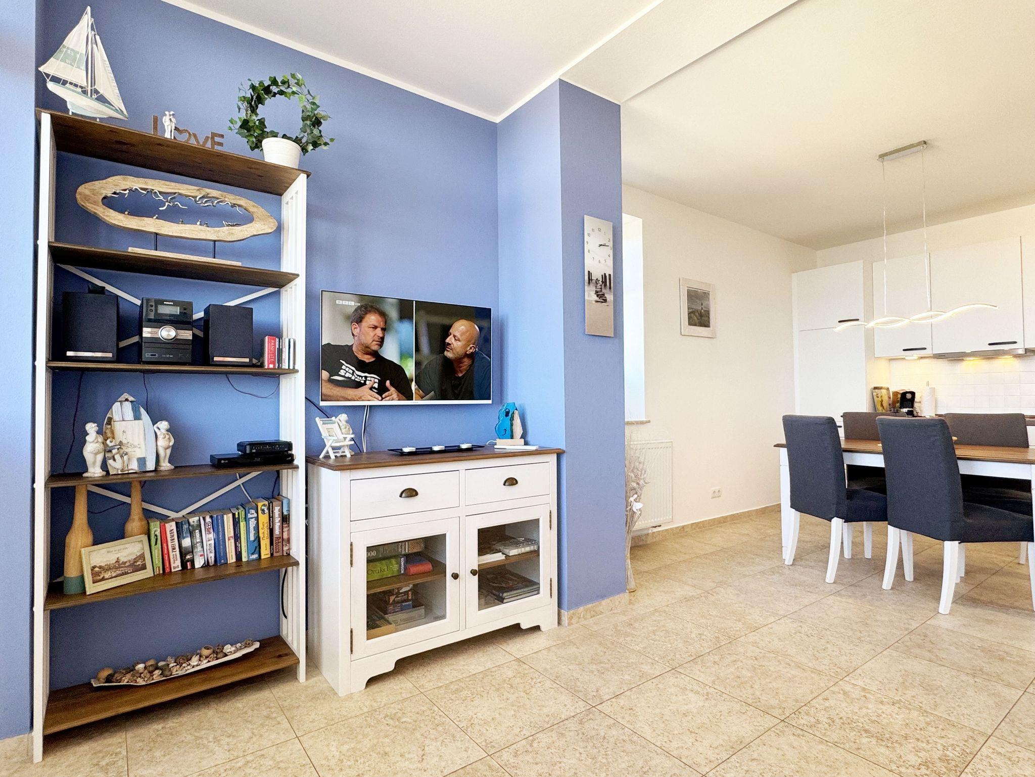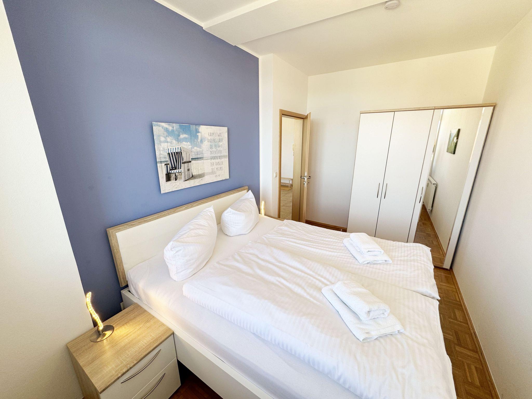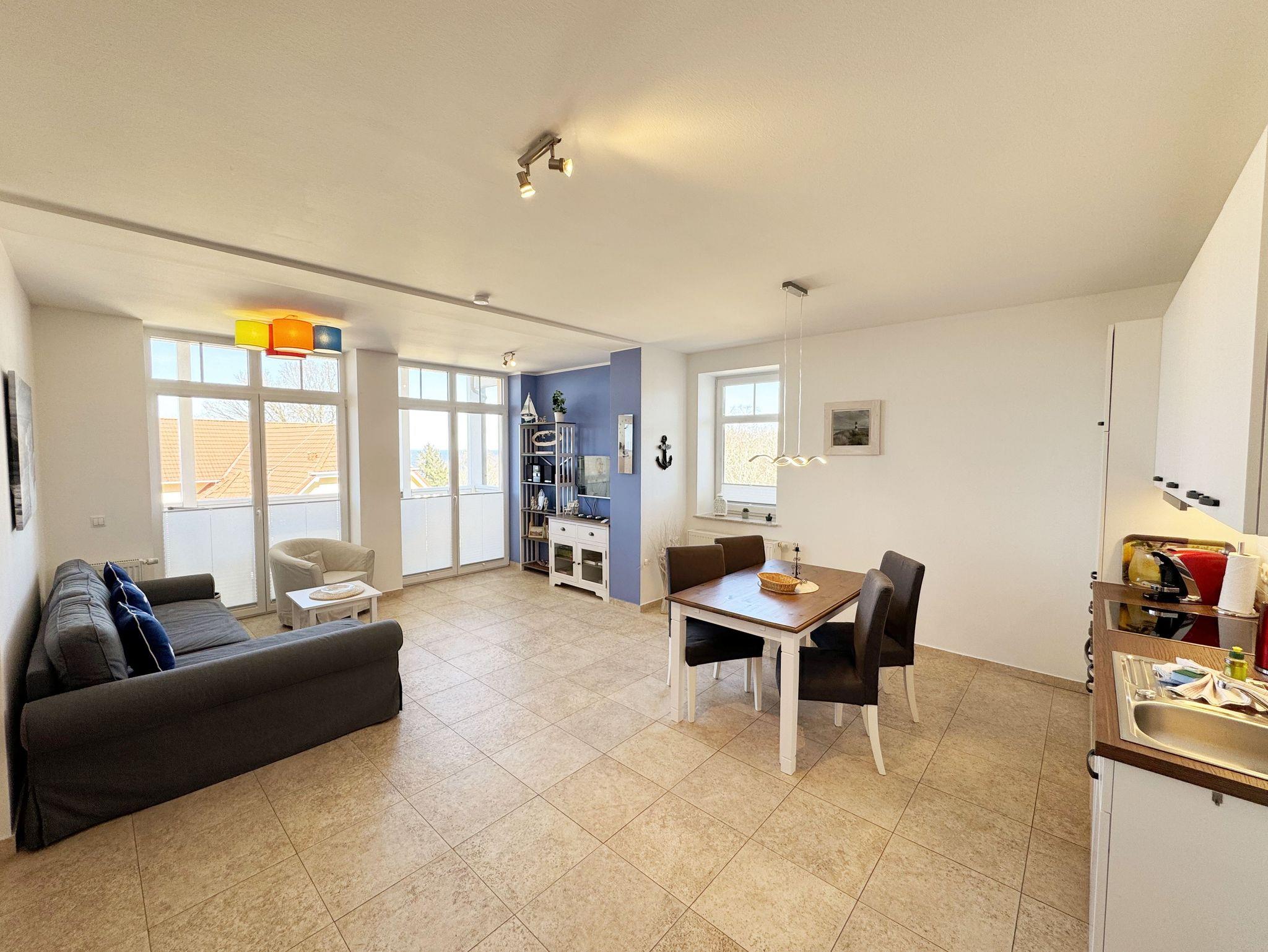 Die komfortable Nichtraucherferienwohnung in der Villa Bergfrieden bietet mit ca. 53 qm Platz für max. 2 bis 4 Personen. Die Wohnung befindet sich in der 1. Etage. Der Wohn- und Essbereich besteht aus einer gemütlichen, ausziehbaren Couchecke (Aufbettungsmöglichkeit für 3./4. Person, 1,40m x 2,00m), einem Couchtisch, einer Anrichte mit einem Smart-TV, einem DVD-Player, einem Radio mit CD-Player sowie einen WLAN-Zugang, welcher für Sie inklusive ist. Abgerundet wird der Bereich mit einer kleinen Auswahl an Gesellschaftsspielen und Urlaubslektüre. Am angrenzenden Essbereich befindet sich eine voll ausgestattete moderne Küchenzeile mit einem Geschirrspüler, einer Spüle, einem Kühlschrank mit Eisfach, einen Backofen mit 4-Zonen-Cerankochfeld, einen Wasserkocher, einer Kaffeemaschine, einen Toaster, einer Cafissimo Maschine sowie diverse Küchenutensilien. Ein Esstisch komplettiert den Bereich. Das helle Schlafzimmer besteht aus einem Doppelbett mit 2 einzelnen Matratzen (1,60m x 2,00m), verstellbare Lattenroste, Nachtischablagen mit Beleuchtung sowie einem Kleiderschrank. Vom Wohnbereich sowie auch vom Schlafzimmer können Sie den bestuhlten Balkon mit Sonnenschirm betreten. Hier haben Sie einen herrlichen Blick auf die Ostsee, wo Sie schon bei Ihrem Frühstück die Aussicht genießen können. Das innenliegende und geflieste Bad verfügt über eine Dusche, ein WC, einen Kosmetikspiegel und einen Fön. Im kleinen Abstellraum befindet sich ein Staubsauger, ein Wäscheständer, ein Bügelbrett und ein Bügeleisen sowie weitere Reinigungsutensilien. Bis zu 2 Haustiere können Sie gerne gegen eine Gebühr dazu buchen. Ihr PKW-Stellplatz Nr. 06 befindet sich direkt am Haus. Ihre geliehenen oder mitgebrachten Fahrräder können Sie in einem Fahrräderständer direkt vor dem Haus abstellen. Die Erstausstattung eines Wäschepaketes (komplette Bettwäsche, 1 Duschhandtuch, 2 kleine Handtücher) können Sie bis 14 Tage vor der Anreise gegen einen Aufpreis dazu buchen oder durch eigenes Ergänzen. Ab 2 gebuchten Paketen erhalten Sie einmalig 1 Geschirrtuch und einen Duschvorleger dazu.