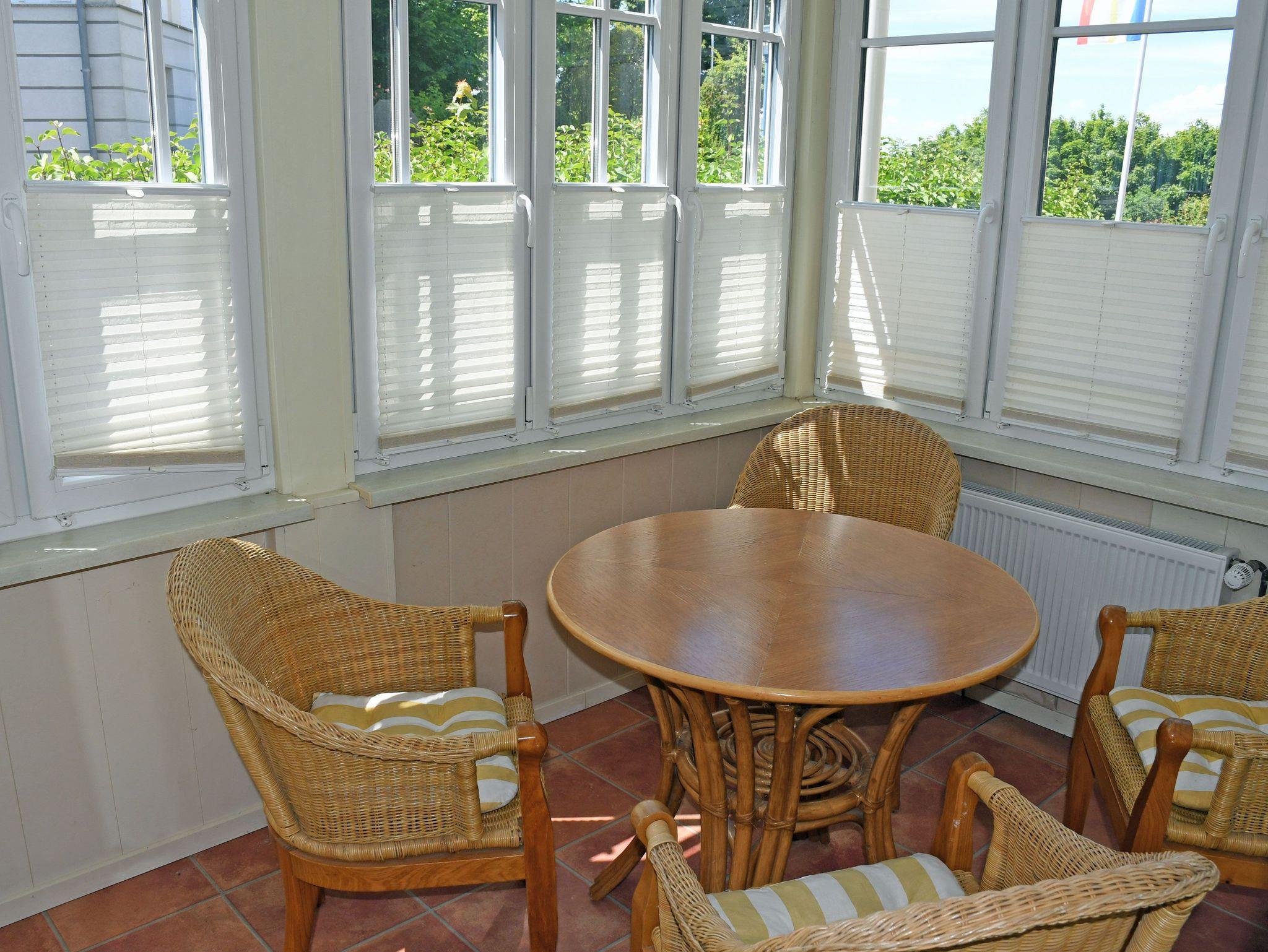 * verglaste Veranda mit Esstisch und 4 Stühlen