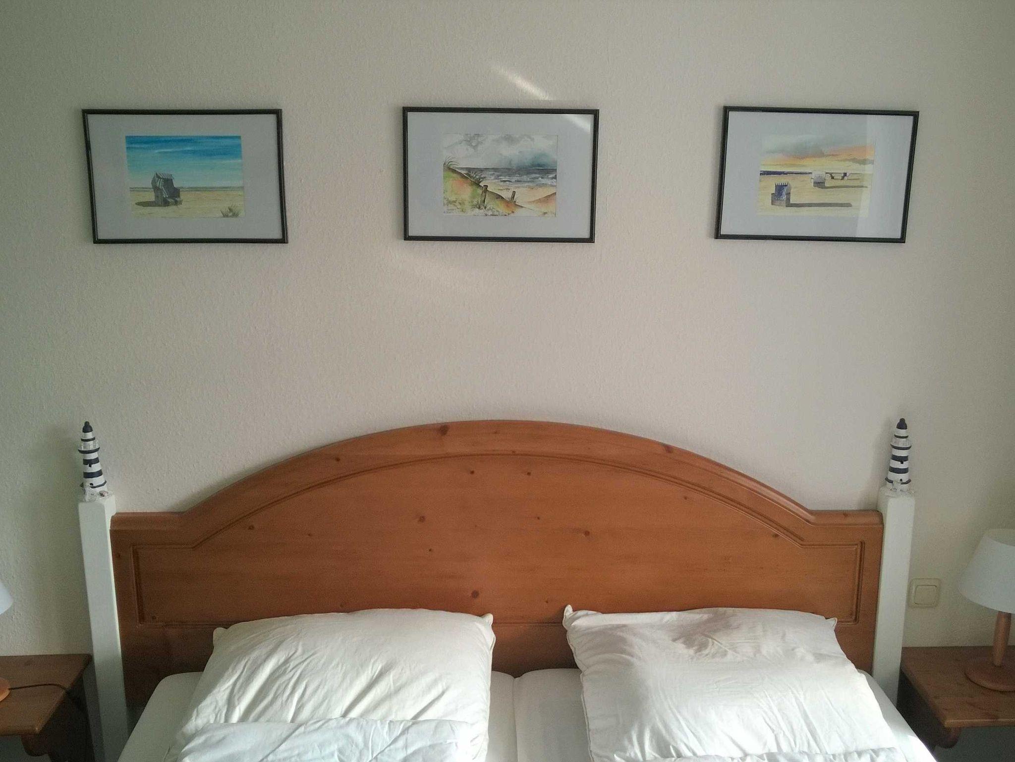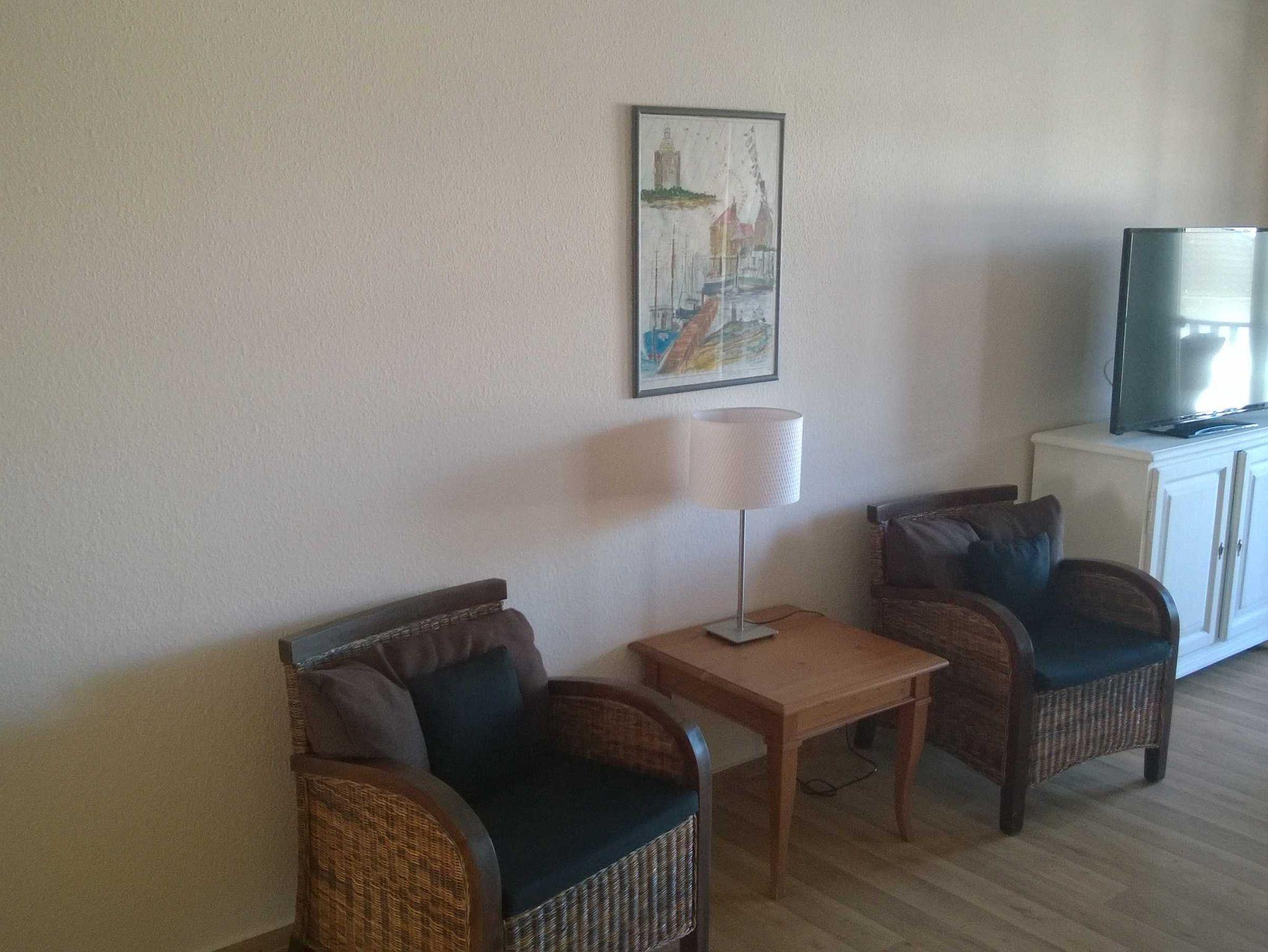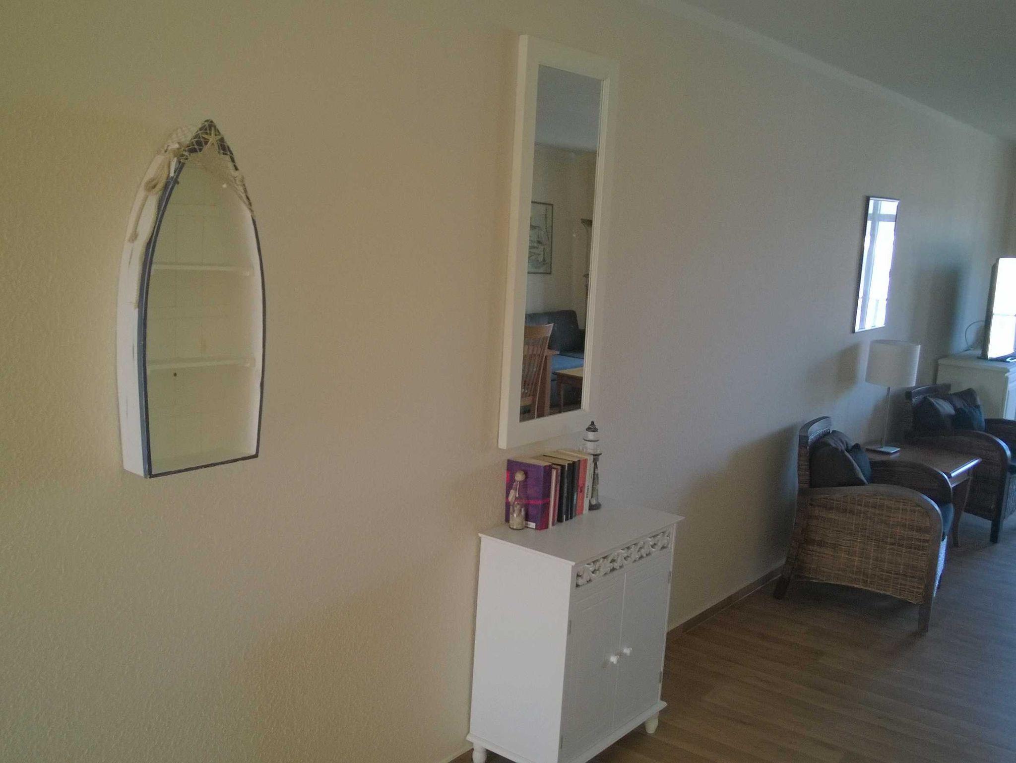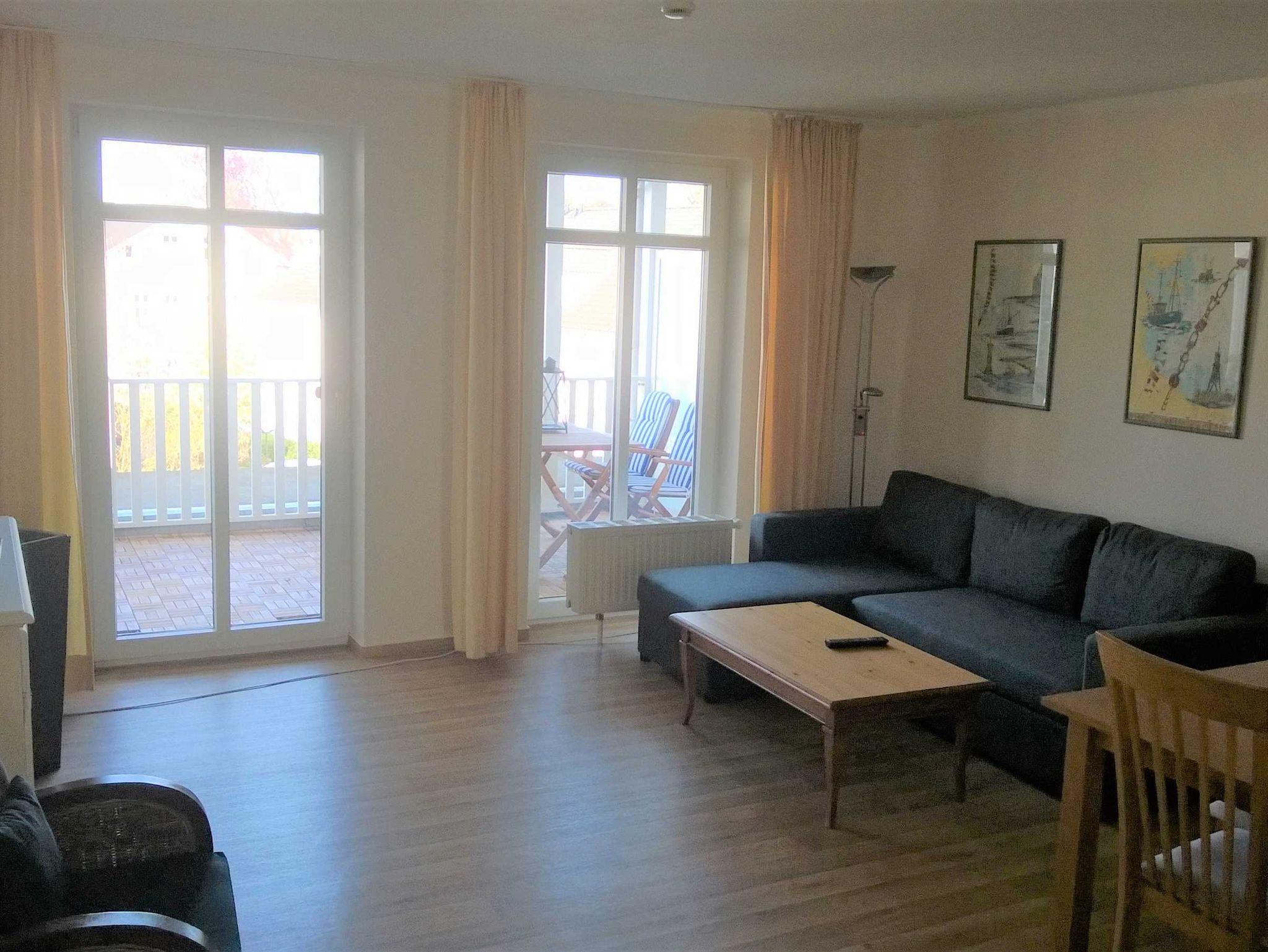 Auf einer Grundfläche von ca. 65 qm können sich vier Erwachsene bequem aufhalten und sich wohlfühlen. Neben dem großen Wohnzimmer mit Essbereich gibt es ein Schlafzimmer mit Doppelbett, sowie ein Bad und eine umfangreich ausgestattete offene Küche. Im Wohnzimmer lädt eine gemütliche Sofalandschaft, die mit wenigen Handgriffen zu einer Schlafmöglichkeit für 2 Personen wird, zum Erholen nach einem langen Strandtag, einer Wanderung zu Fuß oder per Rad oder einem anderen Ausflug ein. Zur technischen Ausstattung gehört ein 50-Zoll Flachbildfernseher, CD/DVD-Player und eine Musikanlage. Ein W-LAN-Zugang zur kostenlosen Nutzung ist selbstverständlich vorhanden. Der grosse Balkon lädt zum Verweilen zwischen den Ausflügen oder einem Strandtag ein. Er ist auch gross genug um dort z.B. zu Frühstücken. In der komplett ausgestatteten offenen Küche finden Sie ein Cerankochfeld, einen Backofen, einen Geschirrspüler, Kühlschrank mit Eisfach, Toaster, Kaffeemaschine, Wasserkocher und umfangfreiche Küchenutensilien. Das Schlafzimmer mit Doppelbett (2x 0,90 m x 2,00m) ist zusätzlich mit einem 32 Zoll Flachbildfernseher ausgestattet. Nachtischablagen und Kleiderschränke sind selbstverständlich. Wohn- und Schlafzimmer sind mit einem Laminat-Fußboden ausgelegt. Die Ausstattung des Bades besteht aus einer Duschkabine, Waschbecken und WC sowie einer Waschmaschine. Mitgebrachte Fahrräder können im Keller abgestellt werden.