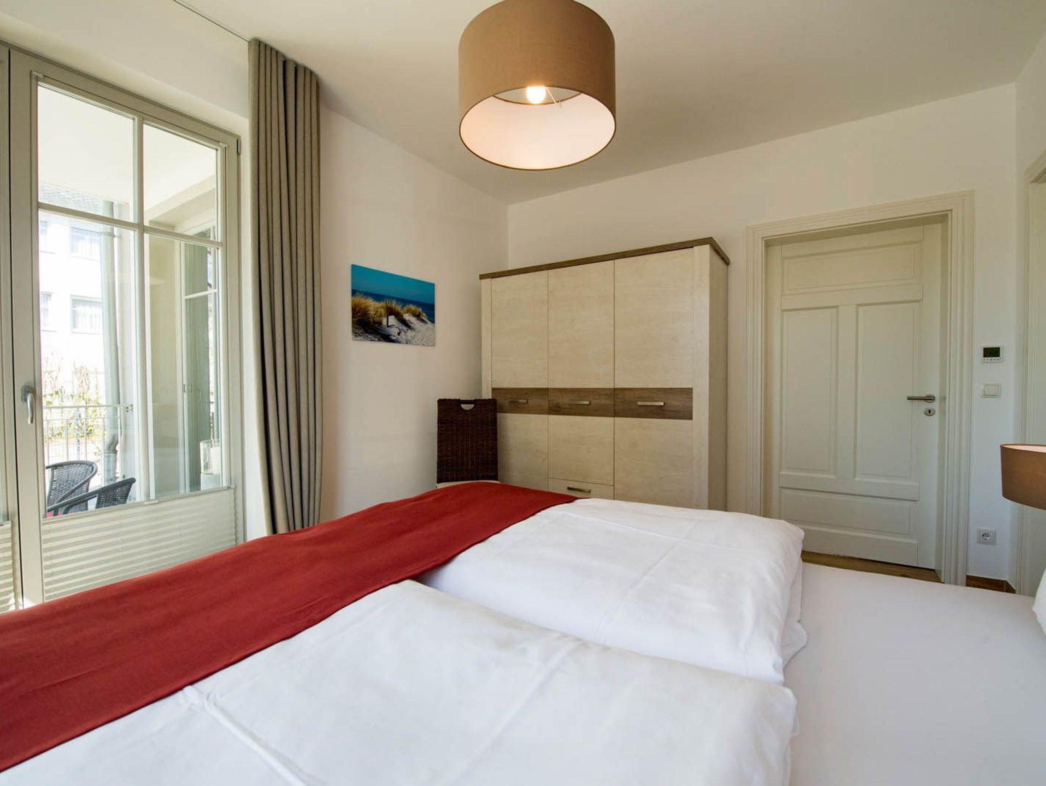 * 1. Schlafzimmer mit einem Komfortdoppelbett (180 x 200 cm), 2 Nachttische mit Nachttischlampen und großer Kleiderschrank, 1 Stummer Diener Flat-TV mit Radiofunktion (32 Zoll), Zugang zur kleinen Terrasse