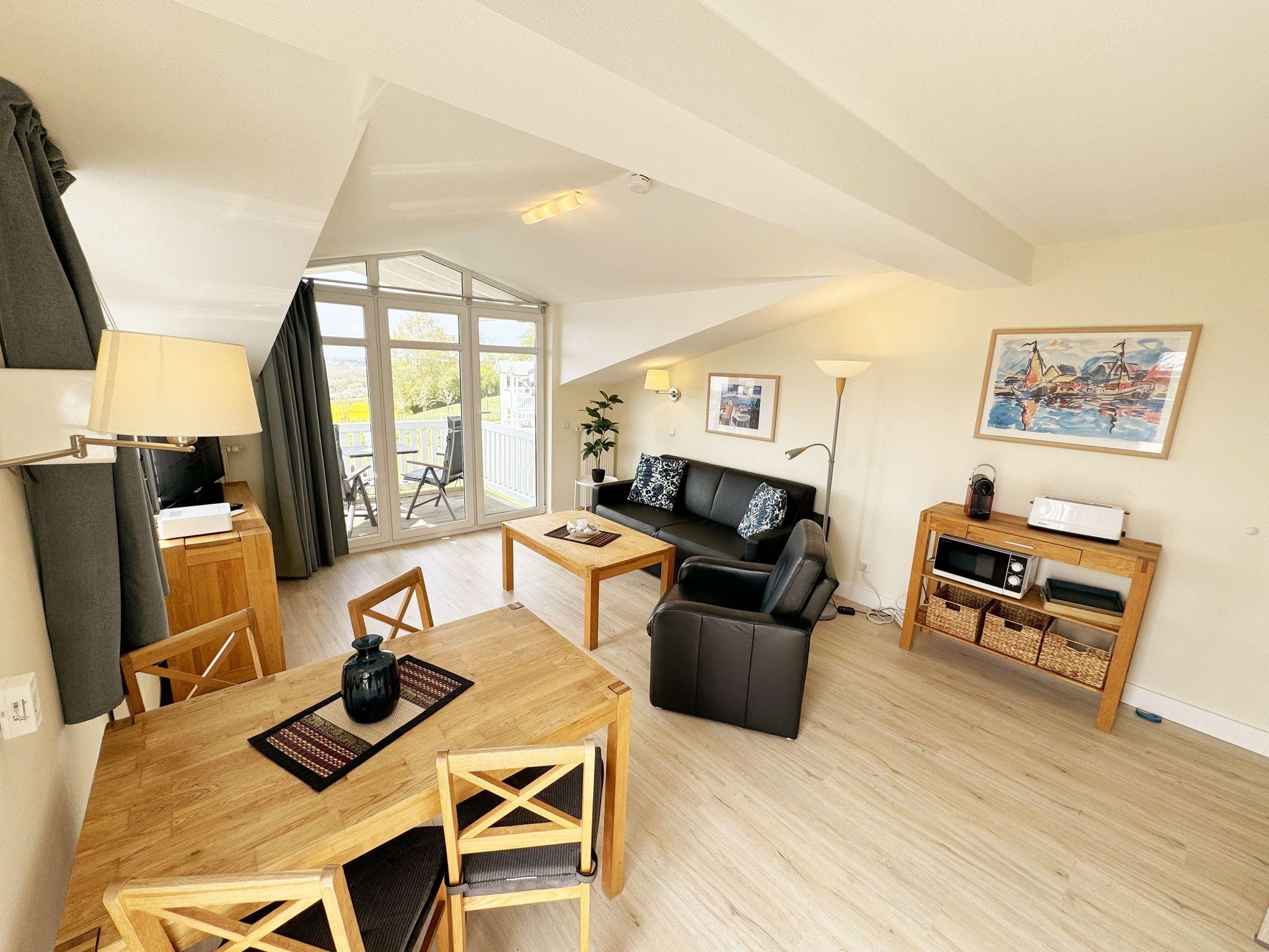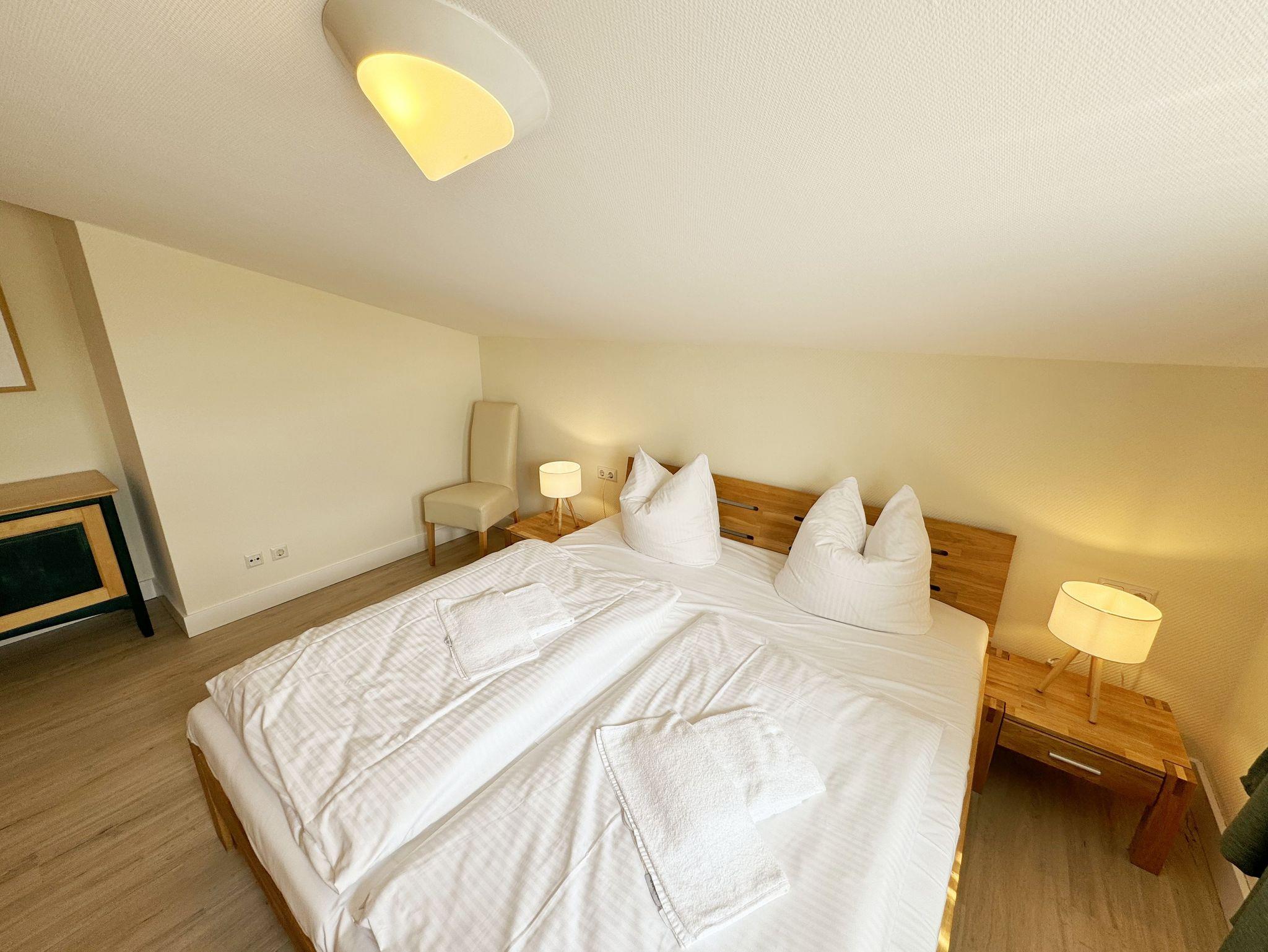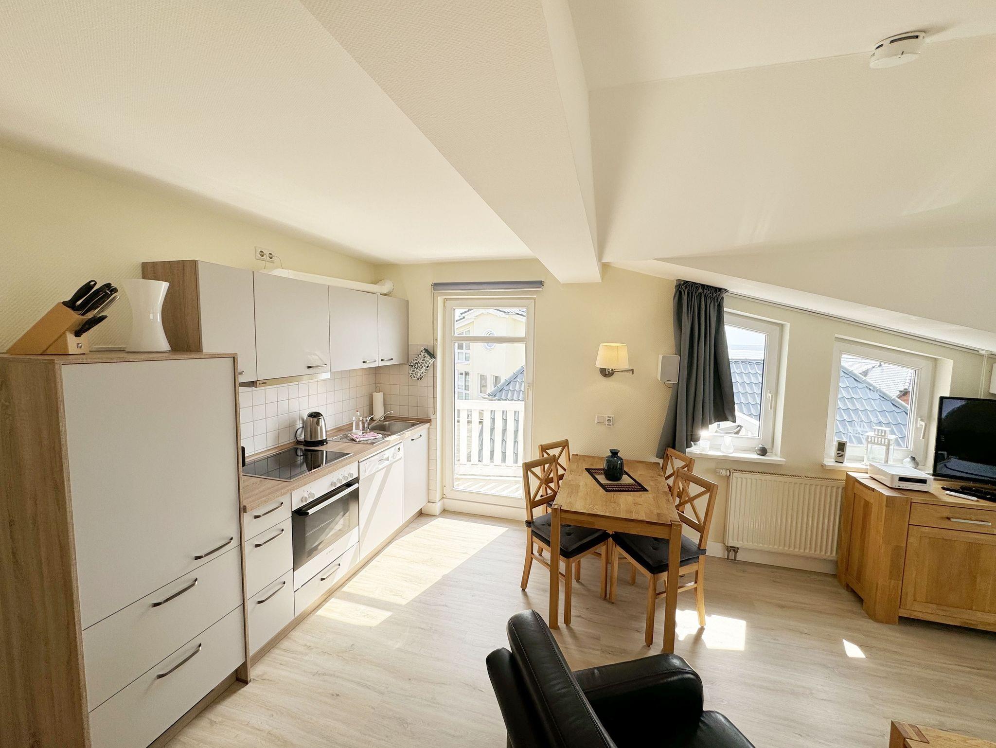 Unsere komfortable Nichtraucherwohnung von ca. 50 qm für 2 bis max. 3 Erwachsene und 1 Kleinkind im Kinderreisebett bis 3 Jahre verfügt über ein Schlafzimmer mit Doppelbett, Kleiderschrank und Nachttischkonsolen. Der Wohnbereich wurde mit einer Sitzecke (Aufbettungsmöglichkeit für die 3. Person), TV-Board und LCD-TV/Mini-Stereo-Anlage eingerichtet. Das Badezimmer ist mit einer Dusche, WC und Fön ausgestattet. Die Küchenzeile bietet einen Esstisch mit 4 Stühlen, Geschirrspüler, 4 Herdplatten mit Backofen, Toaster, Kaffeemaschine, Wasserkocher und diverse Küchenutensilien. Vom bestuhlten sowie dem kleinen Seitenbalkon aus können Sie die einmalige Aussicht auf die Ostsee genießen. Kinderreisebett (ohne Matratze und Bett Inlett) und Hochstuhl können für unsere kleinen Gäste gegen eine Gebühr gestellt werden. WLAN ist für Sie inklusive nutzbar!! Ein PKW-Stellplatz (Nr. 07) sowie eine Unterstellmöglichkeit für Ihre Fahrräder ist am Haus vorhanden. 2 Haustiere sind gegen eine Gebühr gern gesehene Gäste. Die Erstausstattung eines Wäschepaketes (komplette Bettwäsche, 1 Duschhandtuch, 1 kleines Handtuch) können Sie bis 14 Tage vor Anreise gegen einen Aufpreis dazu buchen oder durch eigene ergänzen. Ab 2 gebuchten Paketen erhalten Sie einmalig 1 Geschirrhandtuch und 1 Duschvorleger hinzu.