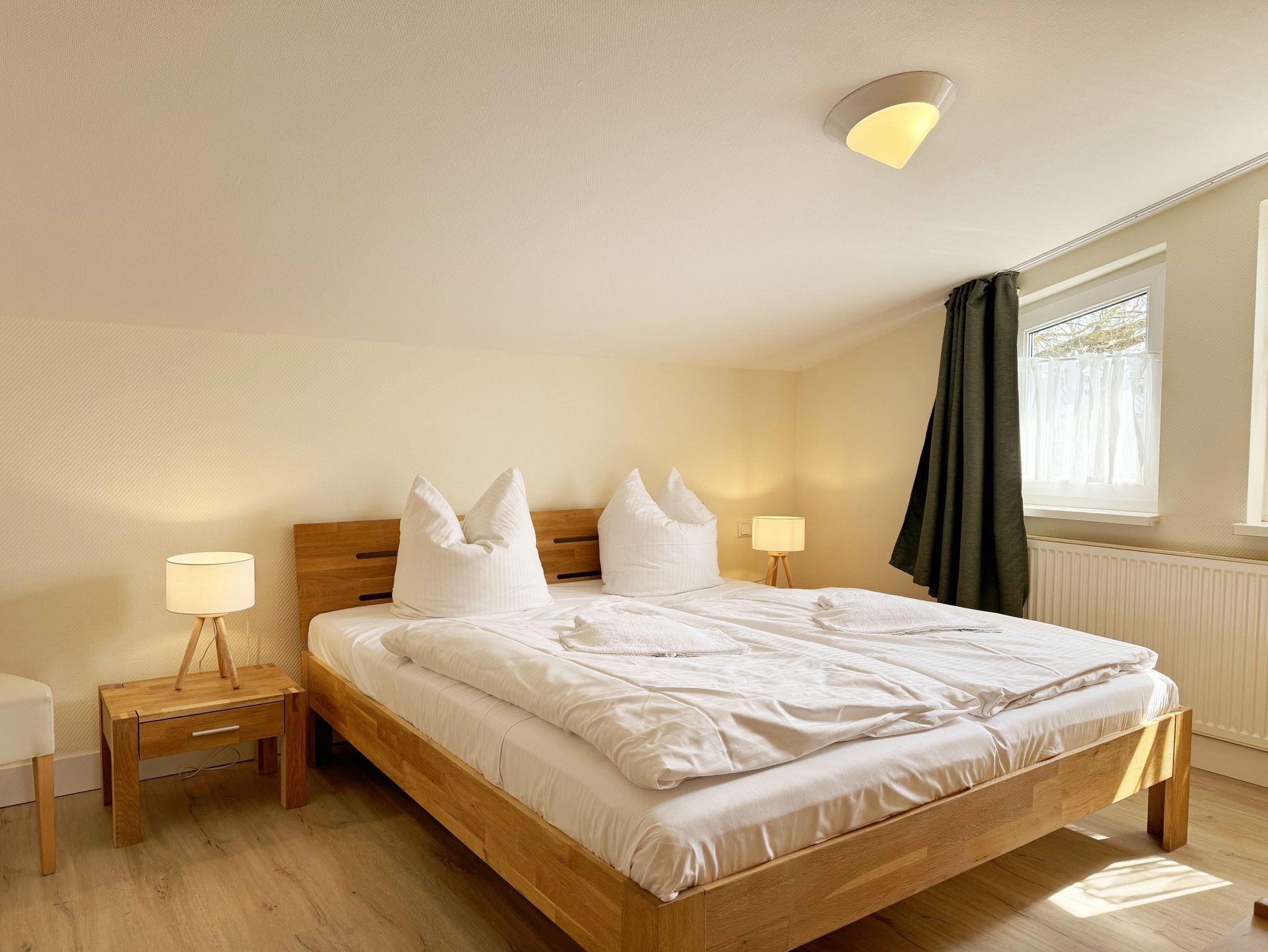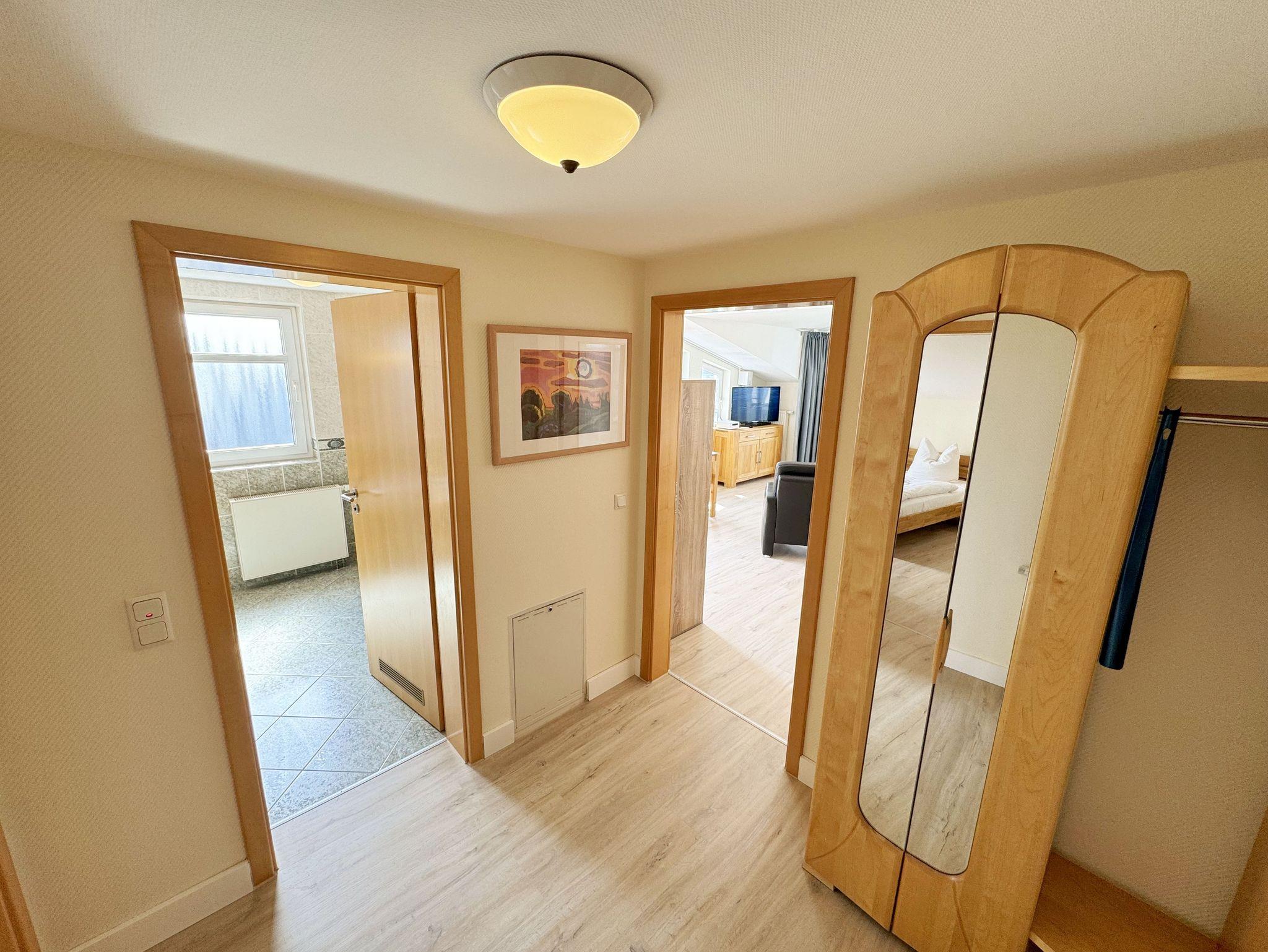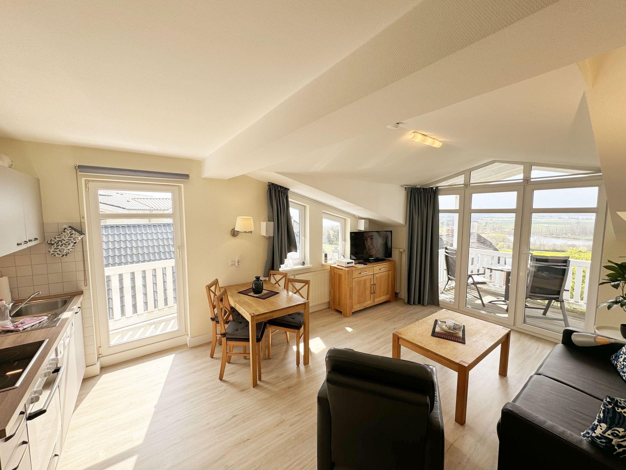Unsere komfortable Nichtraucherwohnung von ca. 50 qm für 2 bis max. 3 Erwachsene und 1 Kleinkind im Kinderreisebett bis 3 Jahre verfügt über ein Schlafzimmer mit Doppelbett, Kleiderschrank und Nachttischkonsolen. Der Wohnbereich wurde mit einer Sitzecke (Aufbettungsmöglichkeit für die 3. Person), TV-Board und LCD-TV/Mini-Stereo-Anlage eingerichtet. Das Badezimmer ist mit einer Dusche, WC und Fön ausgestattet. Die Küchenzeile bietet einen Esstisch mit 4 Stühlen, Geschirrspüler, 4 Herdplatten mit Backofen, Toaster, Kaffeemaschine, Wasserkocher und diverse Küchenutensilien. Vom bestuhlten sowie dem kleinen Seitenbalkon aus können Sie die einmalige Aussicht auf die Ostsee genießen. Kinderreisebett (ohne Matratze und Bett Inlett) und Hochstuhl können für unsere kleinen Gäste gegen eine Gebühr gestellt werden. WLAN ist für Sie inklusive nutzbar!! Ein PKW-Stellplatz (Nr. 07) sowie eine Unterstellmöglichkeit für Ihre Fahrräder ist am Haus vorhanden. 2 Haustiere sind gegen eine Gebühr gern gesehene Gäste. Die Erstausstattung eines Wäschepaketes (komplette Bettwäsche, 1 Duschhandtuch, 1 kleines Handtuch) können Sie bis 14 Tage vor Anreise gegen einen Aufpreis dazu buchen oder durch eigene ergänzen. Ab 2 gebuchten Paketen erhalten Sie einmalig 1 Geschirrhandtuch und 1 Duschvorleger hinzu.