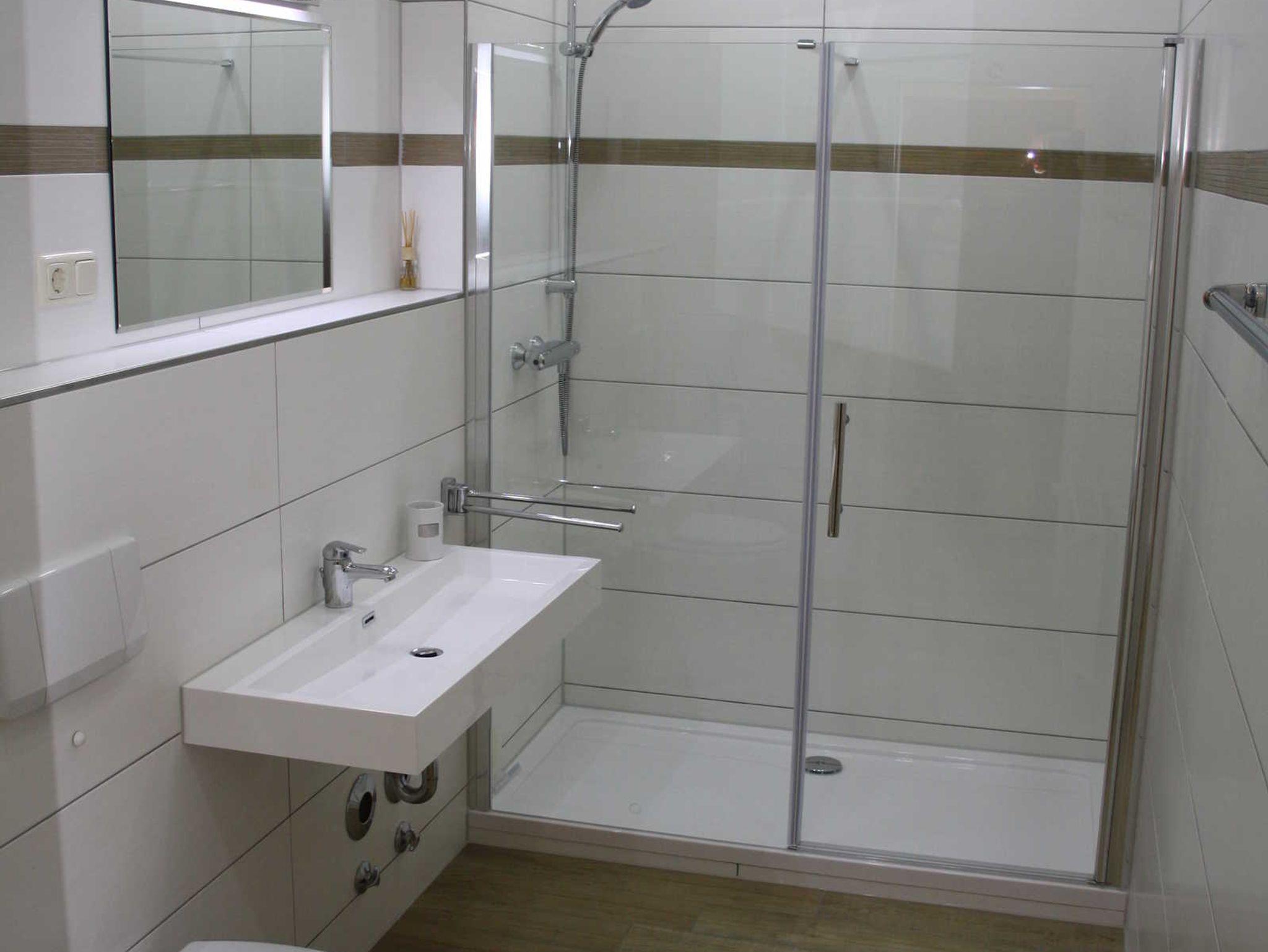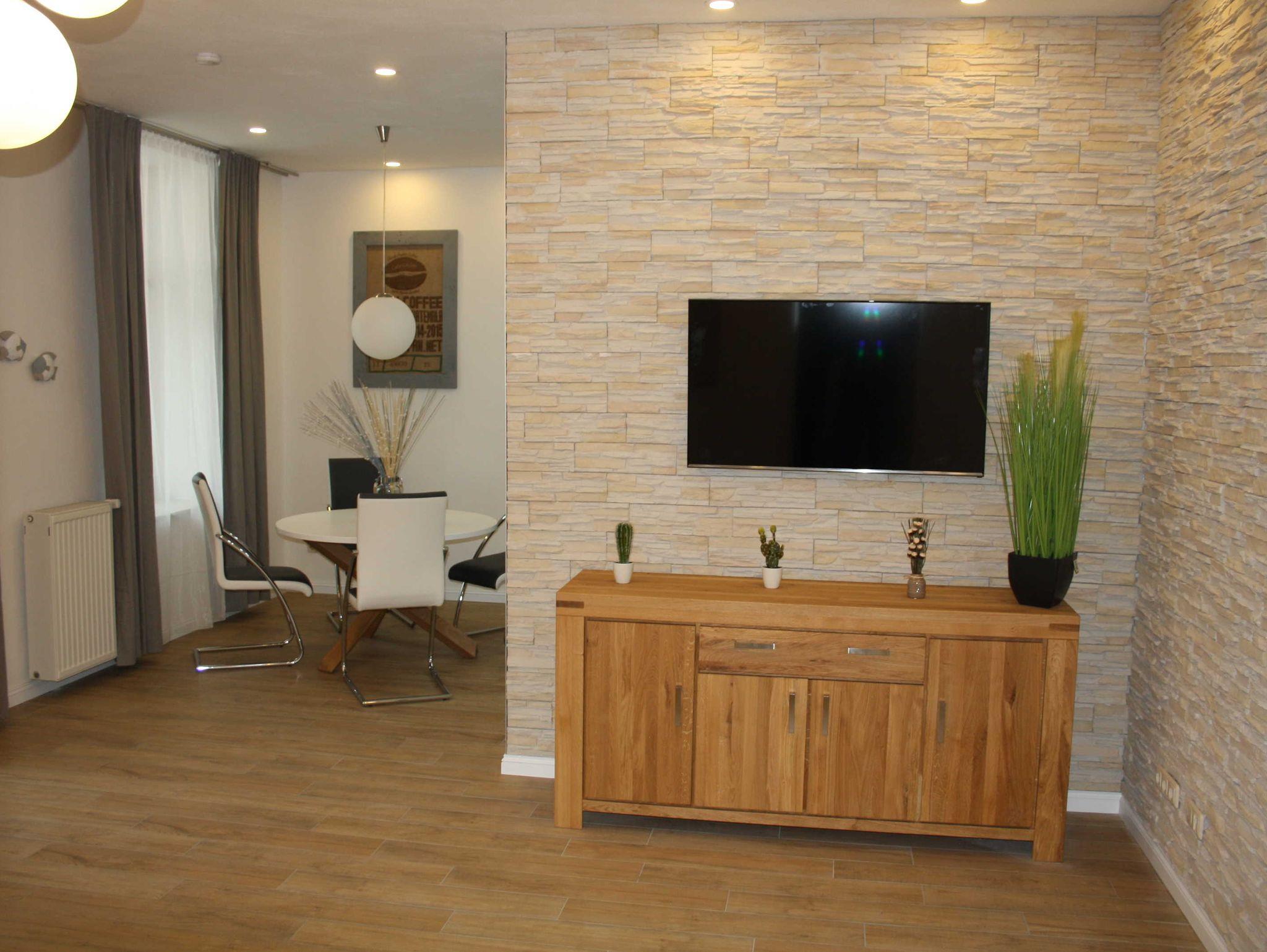 Die Anfang 2016 komplett sanierte und neu eingerichtete 2-Raum-Fewo befindet sich im Erdgeschoß. Sie ist ca. 69 qm groß und für 5 Personen ausgestattet. Die Fewo besteht aus aus einem Wohnzimmer mit Sitzecke (Doppelschlafcouch) und TV und einer offenen Küche - komplett eingerichtet mit Esstisch, Kühl- und Gefrierkombi, Geschirrspüler, Ceranfeld, Backofen, Kaffeemaschine, Wasserkocher und komplett Geschirr etc. Das Schlafzimmer ist ausgestattet mit Doppelbett, einem großen Kleiderschrank und TV. Für die 5. Person ist ein Klappbett vorhanden, welches ins Schlafzimmer gestellt werden kann. Vor dem Wohnzimmer ist ein großer ebenerdiger Ballkon mit Sitzmöglichkeiten. Das Bad ist mit einer großen Dusche, Waschbecken, WC und Waschmaschine bestückt.