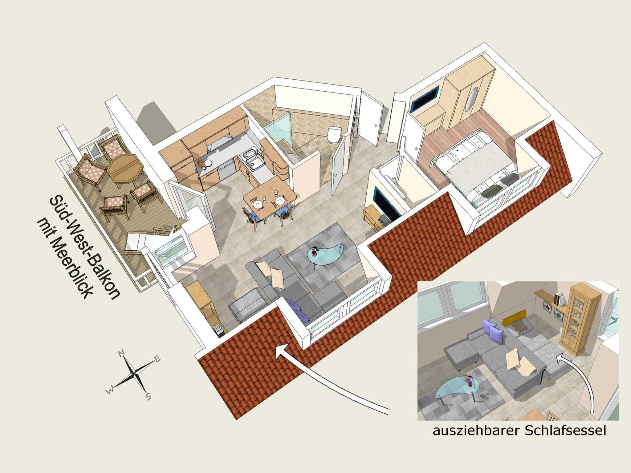 Südwestbalkon mit fantastischem Meerblick, Sitz- und Liegemöglichkeit, Elektrogrill