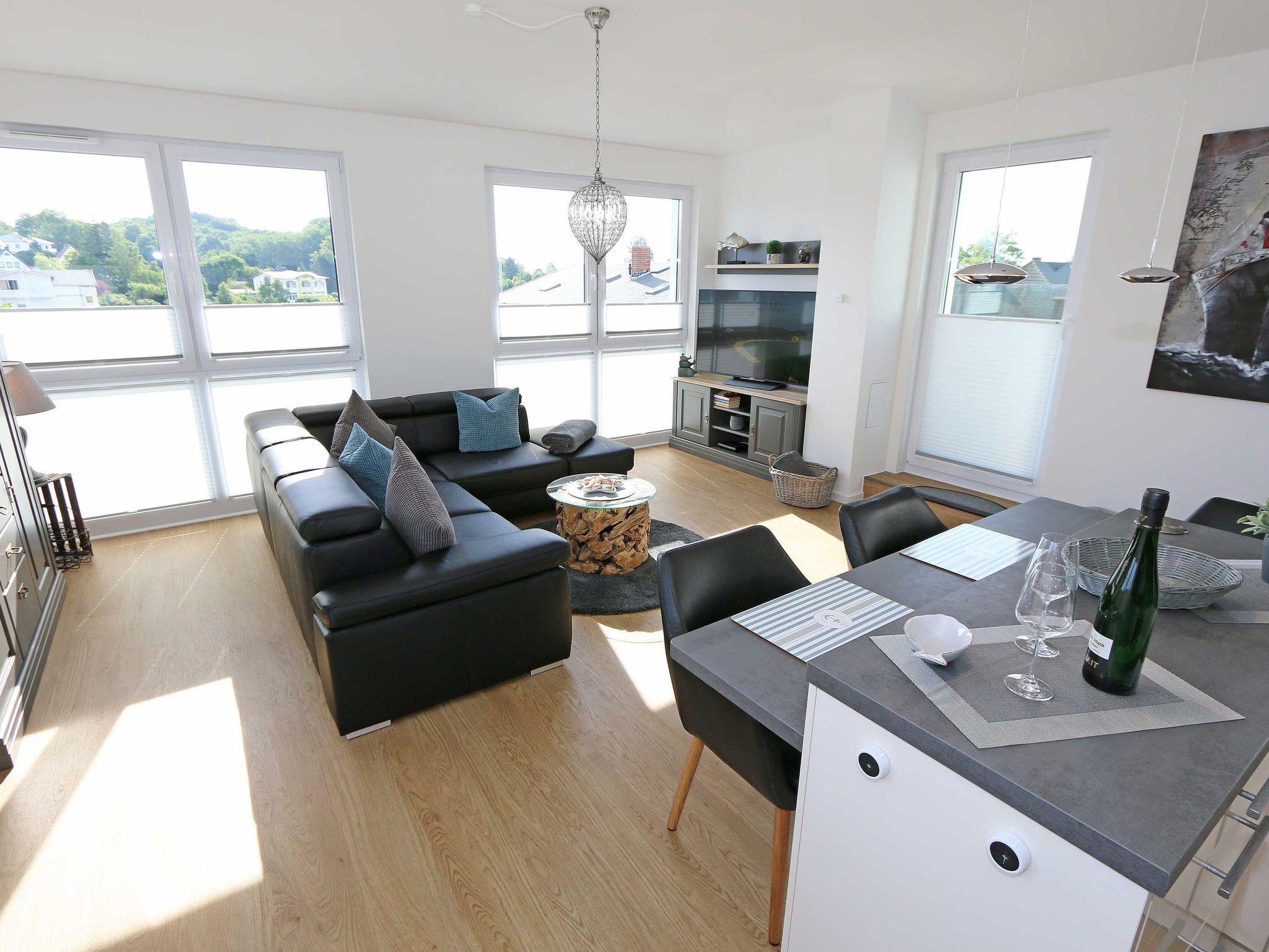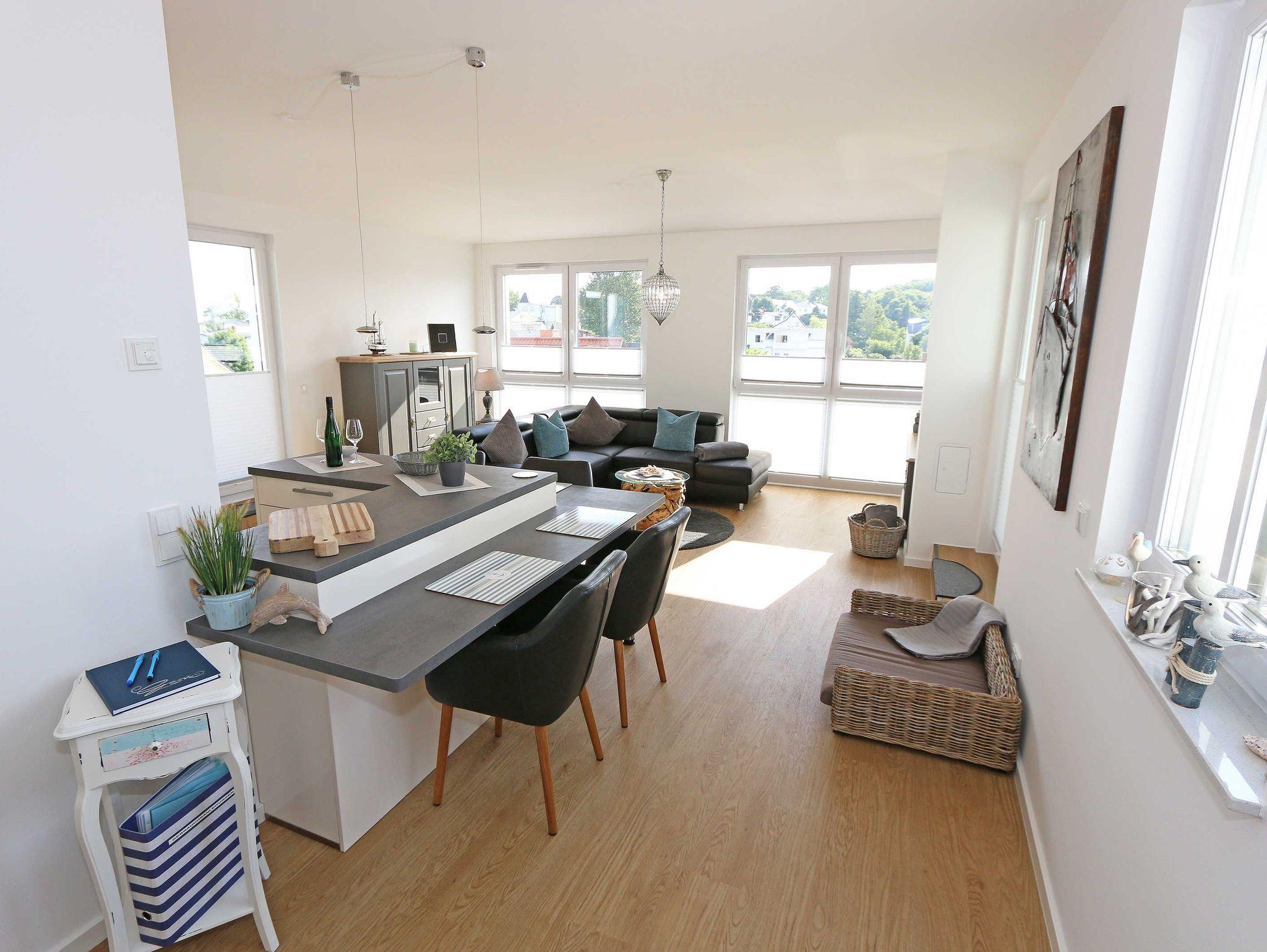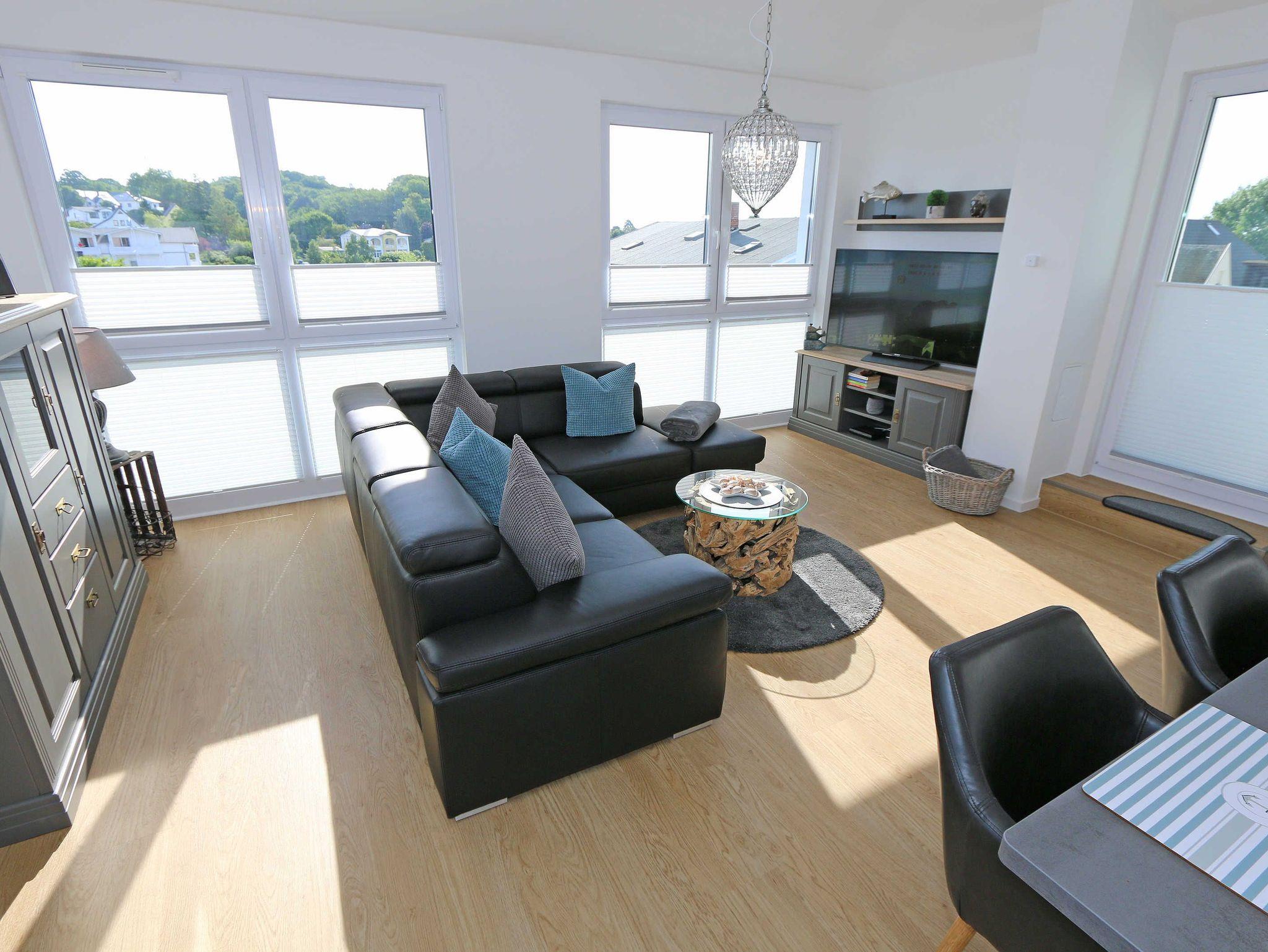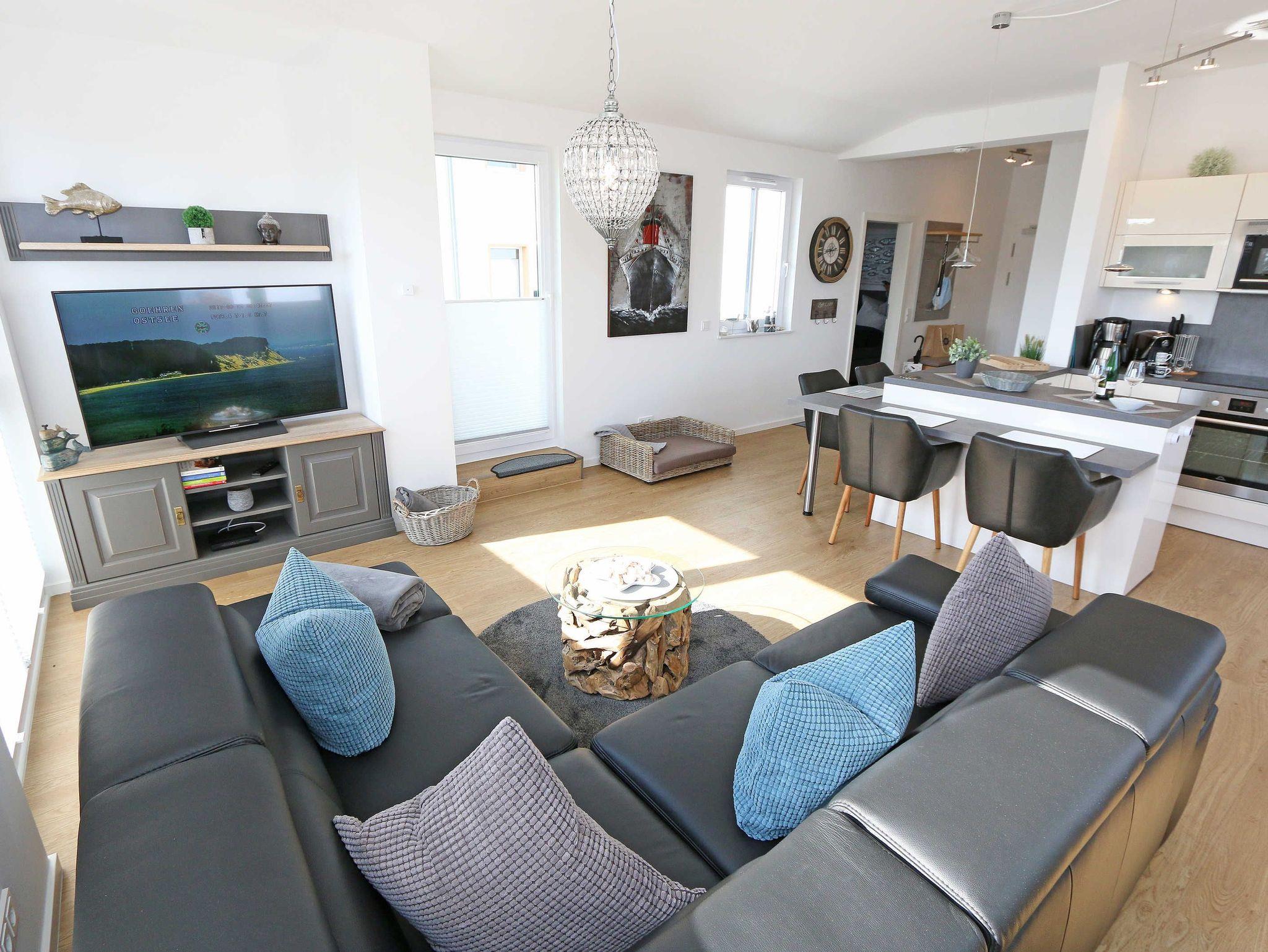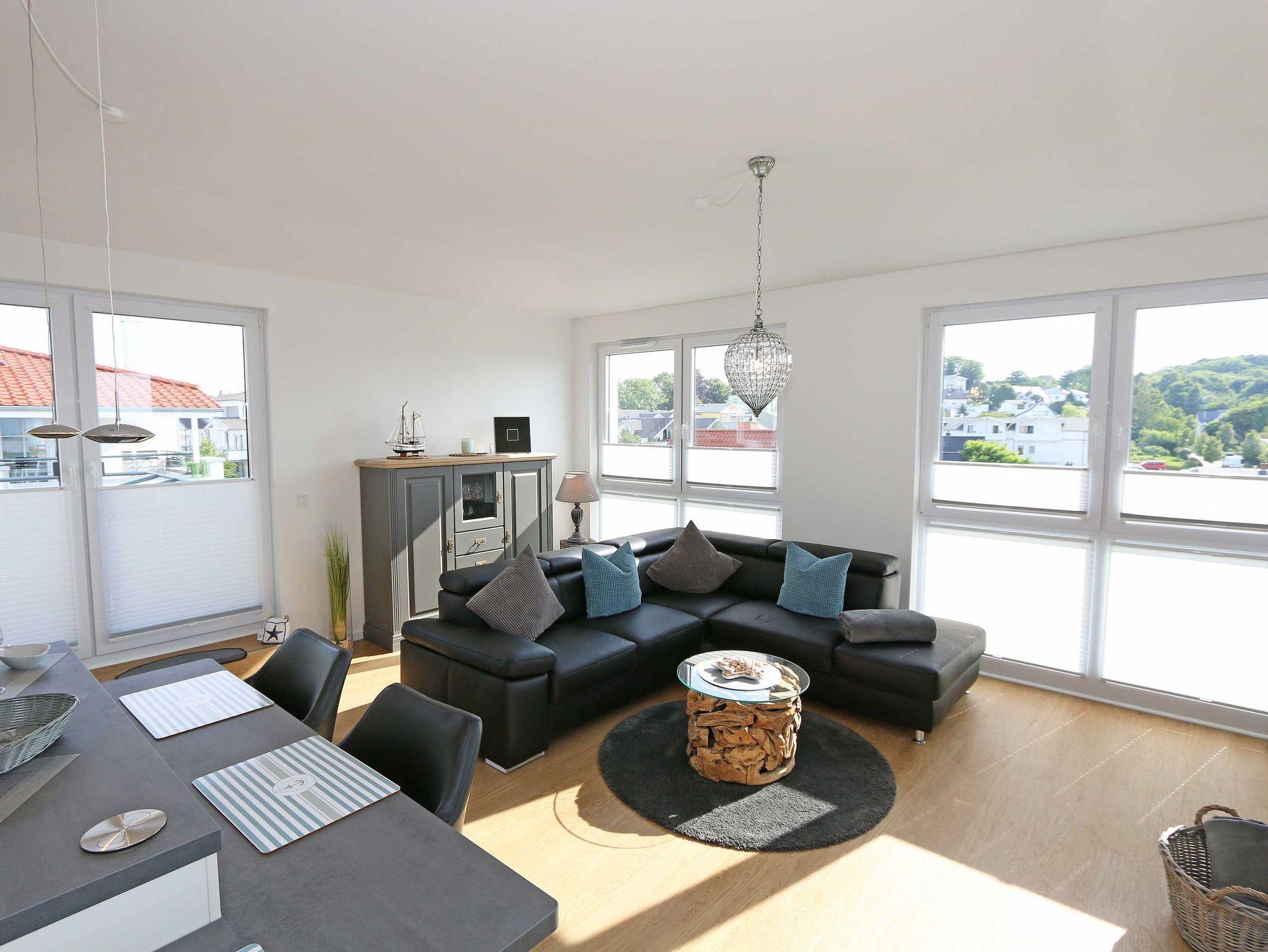 Die komfortable, stilvolle und modern eingerichtete 3-Zimmerferienwohnung besticht mit ihrem Panoramablick über Göhren. Auf ca. 86 m² ist diese Nichtraucherwohnung mit viel Liebe zum Detail eingerichtet. Sie ist ausgestattet für max. 4 Erwachsene. Die hochwertig eingerichtete Einbauküche befindet sich im kombinierten Koch-Ess-/Wohnbereich einschließlich Induktionskochfeld, Geschirrspüler, Kühlschrank mit Gefrierkombination, Backofen, Mikrowelle, Waschtrockner, Kaffeemaschine, Caffissimo-Kapselmaschine, Mixer, Pürierstab, Toaster, Wasserkocher, Eierkocher und diverse Küchenutensilien. Der Essbereich mit 4 Stühlen fügt sich der Küchenzeile an. Der offene Wohnbereich verfügt über eine moderne Ledercouch, ein Sideboard, Leselampe, ein Lowboard, ein Sony Full HD 55 Zoll Smart-TV und eine Yamaha Musikanlage mit DAB-Radio. Auch auf einen Internetanschluss (WLAN) müssen Sie im Urlaub nicht verzichten. Dieser ist für Sie inklusive! Eine kleine Auswahl an Urlaubslektüre und Gesellschaftsspielen sorgt für eine gelungene Abwechslung. Auf der großen Dachterrasse (Nördlich) mit einer gemütlichen Lounge, können Sie den Abend bei einem Glas Wein ausklingen lassen und den wunderbaren Blick über Göhren genießen. Der nach Süd-Ost ausgerichtete Balkon verfügt über eine Sitzgarnitur an der Sie morgens das Frühstück genießen und dabei auf das Meer schauen können. Für erholsamen Schlaf erwarten Sie im 1.Schlafzimmer ein bequemes Boxspringbett mit einem durchgehenden Topper (1,80 m x 2,00 m) in Komforthöhe, Nachttischablagen mit Nachttischleuchten, ein Radio-Wecker, Flachbild- TV, ein großzügiger Kleiderschrank sowie eine Kommode. Das zweite Schlafzimmer verfügt ebenfalls über ein Boxspringbett mit durchgehendem Topper (1,60m x 2,00m), Nachttischablagen mit Leuchten, ein Flachbild-TV, ein Kleiderschrank, eine Ablagebank und einen Herrendiener. Für einen ruhigen Schlaf sorgt in beiden Schlafzimmern eine Verdunklungsmöglichkeit sowie Insektenschutzgitter. Im innenliegenden Bad mit WC tragen eine ebenerdige Dusche, ein Fön, ein Badradio, ein Kosmetikspiegel, ein Waschtisch mit Unterschrank und eine wohnungseigene Sauna zu Ihrer Entspannung bei. Genug Ablageflächen für Ihre Pflegeprodukte sind hier ausreichend vorhanden. In der Gästetoilette befinden sich ebenfalls Ablageflächen, ein Waschtisch und ein kleiner Fön. Alle Räumlichkeiten sind mit einer Fußbodenheizung versehen und sorgen für eine angenehme Wärme. Ein separater Abstellraum in dem unter anderem Staubsauger, Bügel ? und Reinigungsutensilien ihren Platz haben, befindet sich im Eingangsbereich der Wohnung. Auch 1 Haustier mit seinem eigenen Schlafplatz ist gegen eine Gebühr ein gern gesehener Gast. Fress-und Wassernapf stehen ebenfalls für Ihren Liebling bereit. Ein eigener PKW-Stellplatz (Nr.07) befindet sich in der Tiefgarage (Einfahrtshöhe: 2,00 m) des Hauses. Ihre mitgebrachten oder geliehenen Fahrräder können Sie im Außenbereich in einem Fahrradständer abstellen. Die Erstausstattung eines Wäschepaketes (komplette Bettwäsche, 1 Duschhandtuch, 2 kleine Handtücher) können Sie bis 14 Tage vor Anreise gegen einen Aufpreis dazu buchen oder durch eigene ergänzen. Ab 2 gebuchten Paketen erhalten Sie einmalig 1 Geschirrhandtuch und 1 Duschvorleger hinzu.