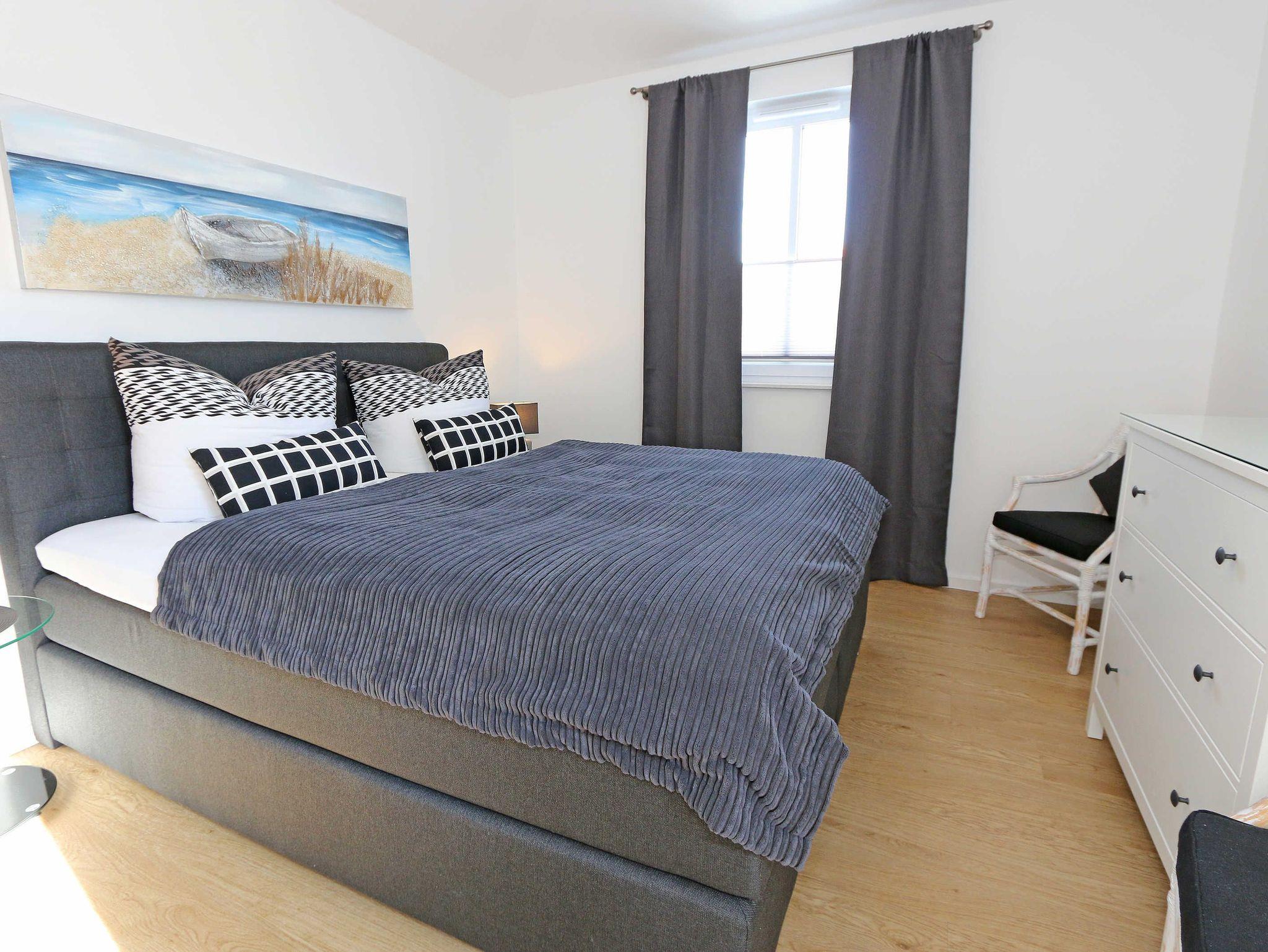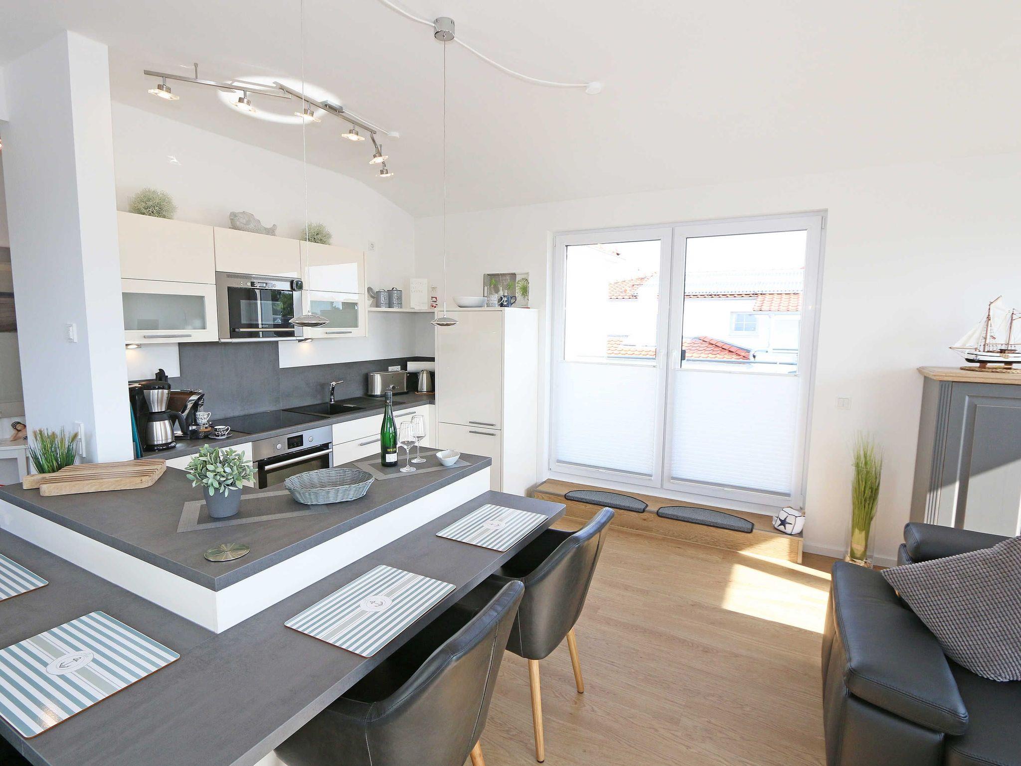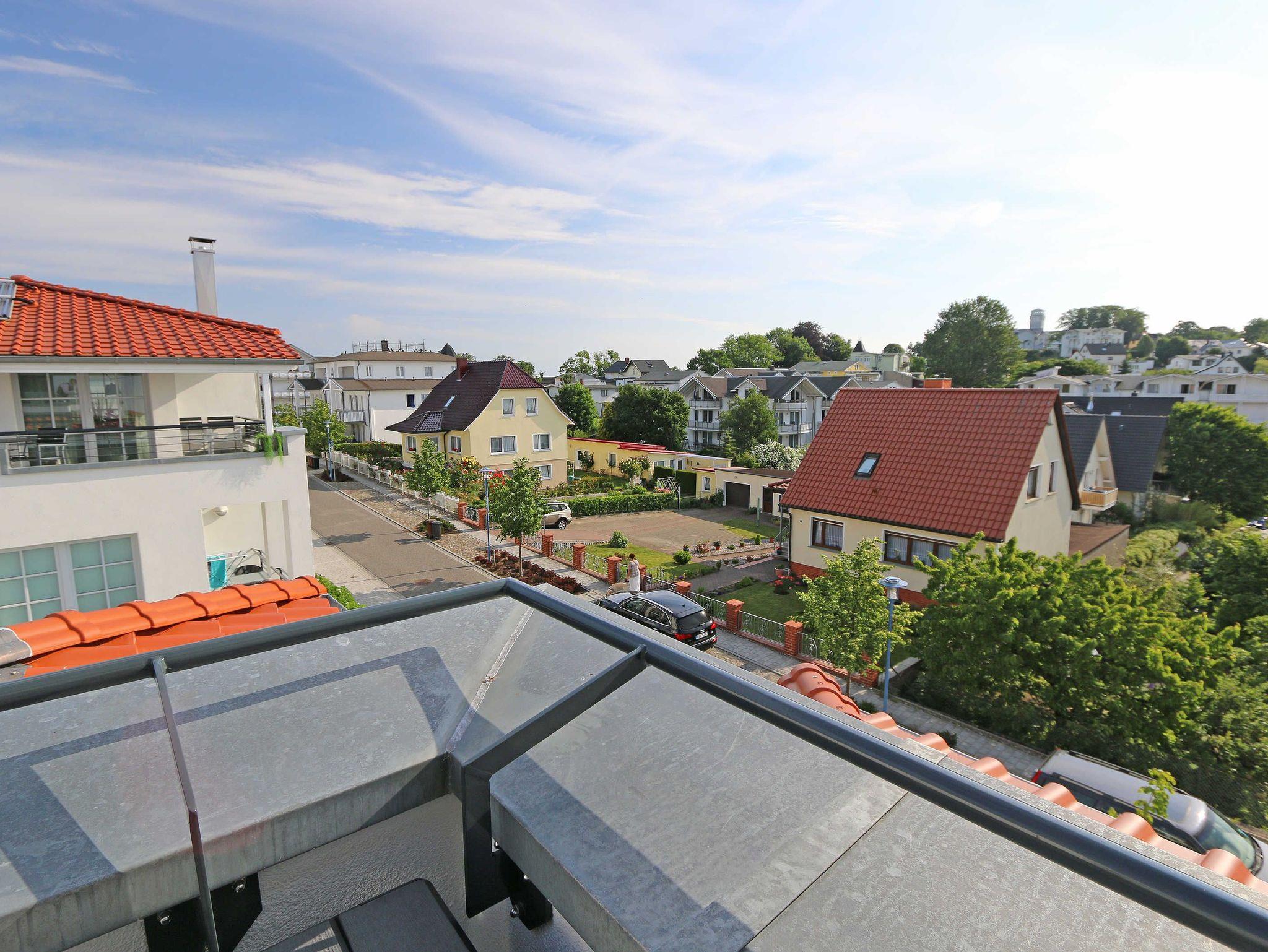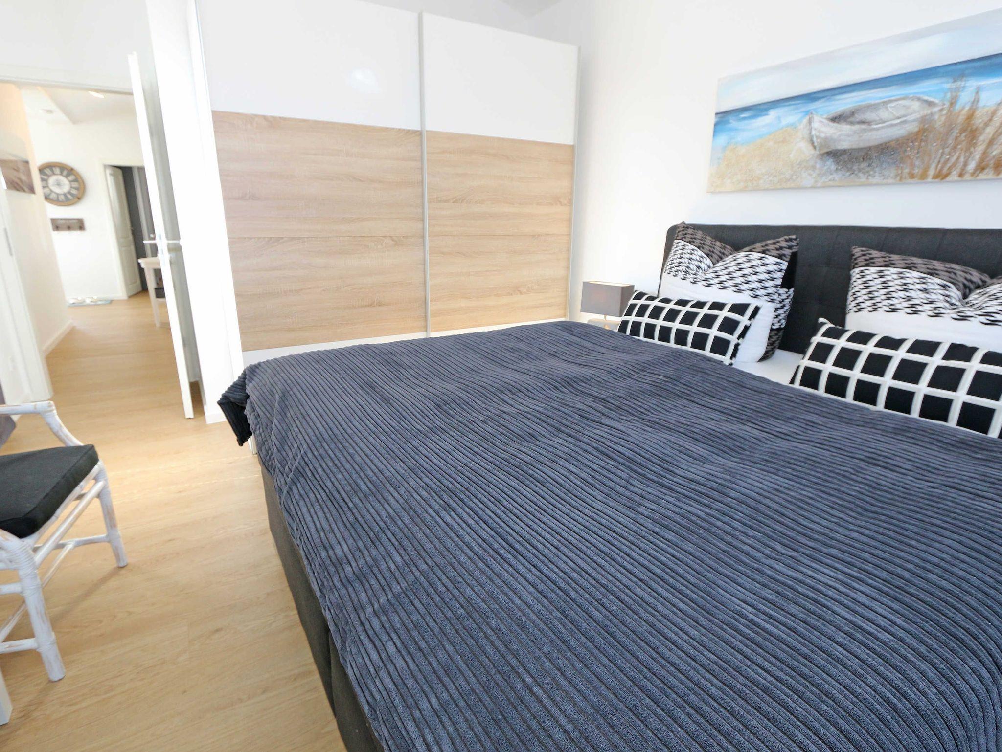 Die komfortable, stilvolle und modern eingerichtete 3-Zimmerferienwohnung besticht mit ihrem Panoramablick über Göhren. Auf ca. 86 m² ist diese Nichtraucherwohnung mit viel Liebe zum Detail eingerichtet. Sie ist ausgestattet für max. 4 Erwachsene. Die hochwertig eingerichtete Einbauküche befindet sich im kombinierten Koch-Ess-/Wohnbereich einschließlich Induktionskochfeld, Geschirrspüler, Kühlschrank mit Gefrierkombination, Backofen, Mikrowelle, Waschtrockner, Kaffeemaschine, Caffissimo-Kapselmaschine, Mixer, Pürierstab, Toaster, Wasserkocher, Eierkocher und diverse Küchenutensilien. Der Essbereich mit 4 Stühlen fügt sich der Küchenzeile an. Der offene Wohnbereich verfügt über eine moderne Ledercouch, ein Sideboard, Leselampe, ein Lowboard, ein Sony Full HD 55 Zoll Smart-TV und eine Yamaha Musikanlage mit DAB-Radio. Auch auf einen Internetanschluss (WLAN) müssen Sie im Urlaub nicht verzichten. Dieser ist für Sie inklusive! Eine kleine Auswahl an Urlaubslektüre und Gesellschaftsspielen sorgt für eine gelungene Abwechslung. Auf der großen Dachterrasse (Nördlich) mit einer gemütlichen Lounge, können Sie den Abend bei einem Glas Wein ausklingen lassen und den wunderbaren Blick über Göhren genießen. Der nach Süd-Ost ausgerichtete Balkon verfügt über eine Sitzgarnitur an der Sie morgens das Frühstück genießen und dabei auf das Meer schauen können. Für erholsamen Schlaf erwarten Sie im 1.Schlafzimmer ein bequemes Boxspringbett mit einem durchgehenden Topper (1,80 m x 2,00 m) in Komforthöhe, Nachttischablagen mit Nachttischleuchten, ein Radio-Wecker, Flachbild- TV, ein großzügiger Kleiderschrank sowie eine Kommode. Das zweite Schlafzimmer verfügt ebenfalls über ein Boxspringbett mit durchgehendem Topper (1,60m x 2,00m), Nachttischablagen mit Leuchten, ein Flachbild-TV, ein Kleiderschrank, eine Ablagebank und einen Herrendiener. Für einen ruhigen Schlaf sorgt in beiden Schlafzimmern eine Verdunklungsmöglichkeit sowie Insektenschutzgitter. Im innenliegenden Bad mit WC tragen eine ebenerdige Dusche, ein Fön, ein Badradio, ein Kosmetikspiegel, ein Waschtisch mit Unterschrank und eine wohnungseigene Sauna zu Ihrer Entspannung bei. Genug Ablageflächen für Ihre Pflegeprodukte sind hier ausreichend vorhanden. In der Gästetoilette befinden sich ebenfalls Ablageflächen, ein Waschtisch und ein kleiner Fön. Alle Räumlichkeiten sind mit einer Fußbodenheizung versehen und sorgen für eine angenehme Wärme. Ein separater Abstellraum in dem unter anderem Staubsauger, Bügel ? und Reinigungsutensilien ihren Platz haben, befindet sich im Eingangsbereich der Wohnung. Auch 1 Haustier mit seinem eigenen Schlafplatz ist gegen eine Gebühr ein gern gesehener Gast. Fress-und Wassernapf stehen ebenfalls für Ihren Liebling bereit. Ein eigener PKW-Stellplatz (Nr.07) befindet sich in der Tiefgarage (Einfahrtshöhe: 2,00 m) des Hauses. Ihre mitgebrachten oder geliehenen Fahrräder können Sie im Außenbereich in einem Fahrradständer abstellen. Die Erstausstattung eines Wäschepaketes (komplette Bettwäsche, 1 Duschhandtuch, 2 kleine Handtücher) können Sie bis 14 Tage vor Anreise gegen einen Aufpreis dazu buchen oder durch eigene ergänzen. Ab 2 gebuchten Paketen erhalten Sie einmalig 1 Geschirrhandtuch und 1 Duschvorleger hinzu.
