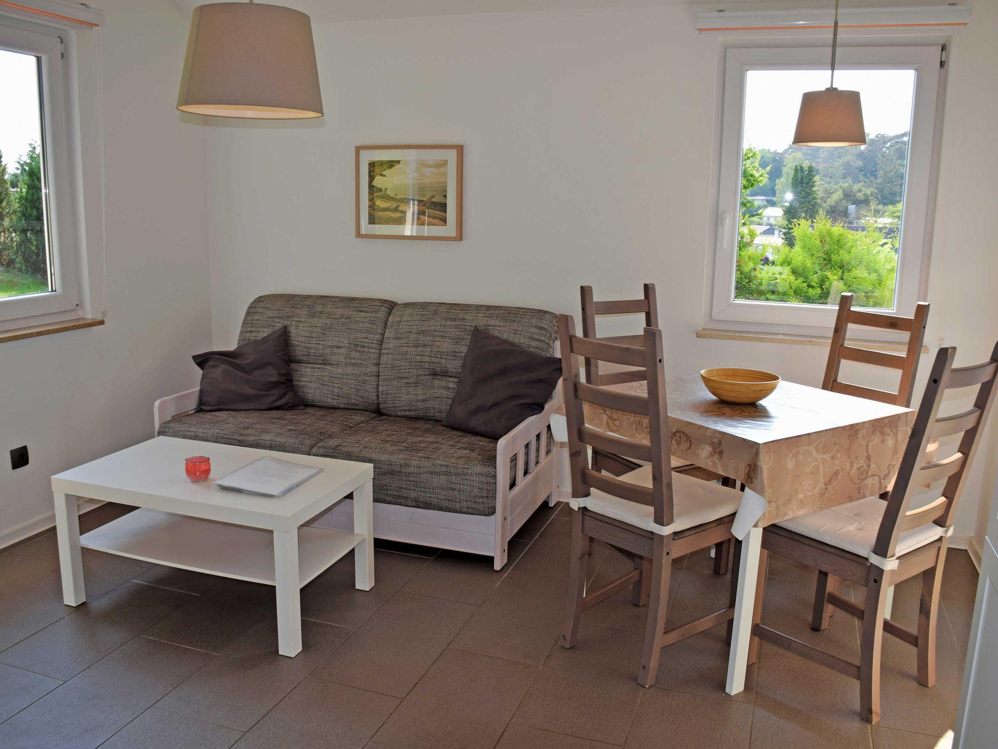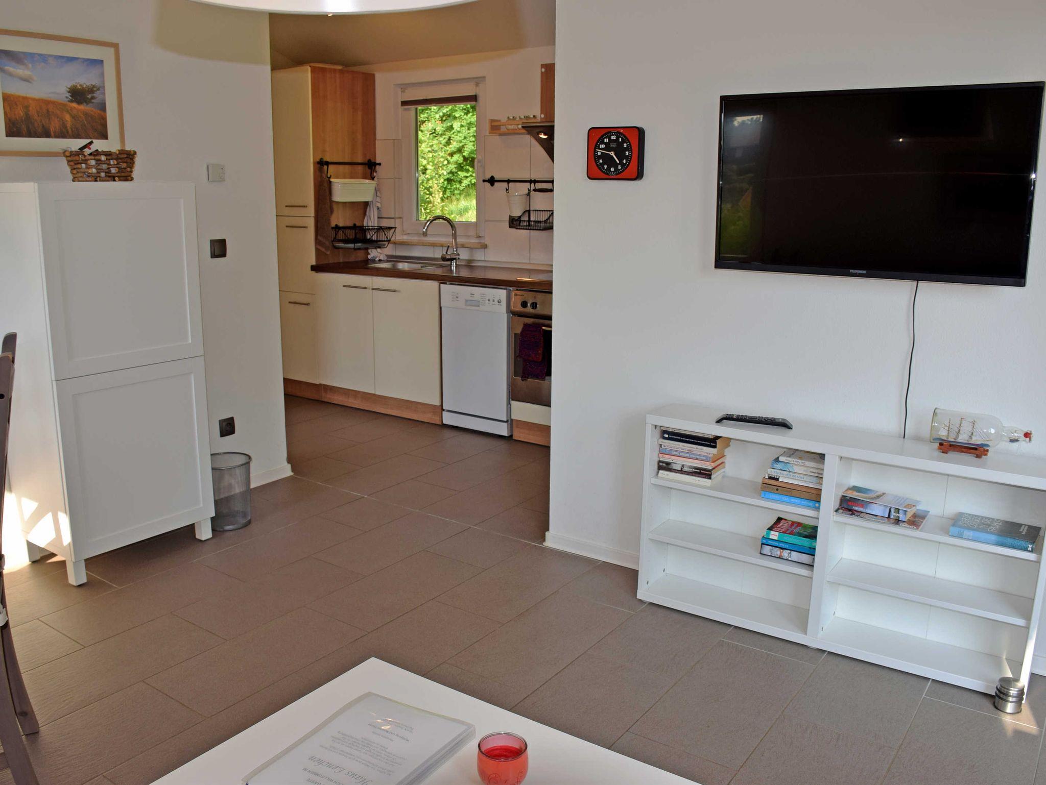 Unser Ferienhaus verfügt über Wohnraum, Küche, Schlafraum und Bad mit WC und WLAN. Es ist für 2 Personen modern und komfortabel eingerichtet. Eine Aufbettung für 1 Kind ist möglich (auch mit Kinderreisebett und Hochstuhl). Sie betreten das Ferienhaus über einen Eingang direkt in die Küche. Von dort aus gelangen Sie in den Wohnraum. Dort finden Sie Sitzgelegenheiten, ein Schlafsofa sowie einen TV vor. Der Küchenbereich ist voll ausgestattet. Im Schlafzimmer befindet sich ein Doppelbett mit Leselampen, TV, Nachtschränke sowie ein Kleiderschrank. Das Bad ist mit Dusche, WC und Waschtisch ausgestattet.