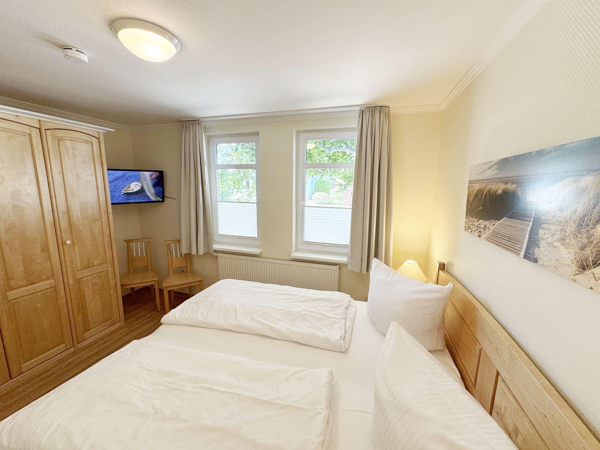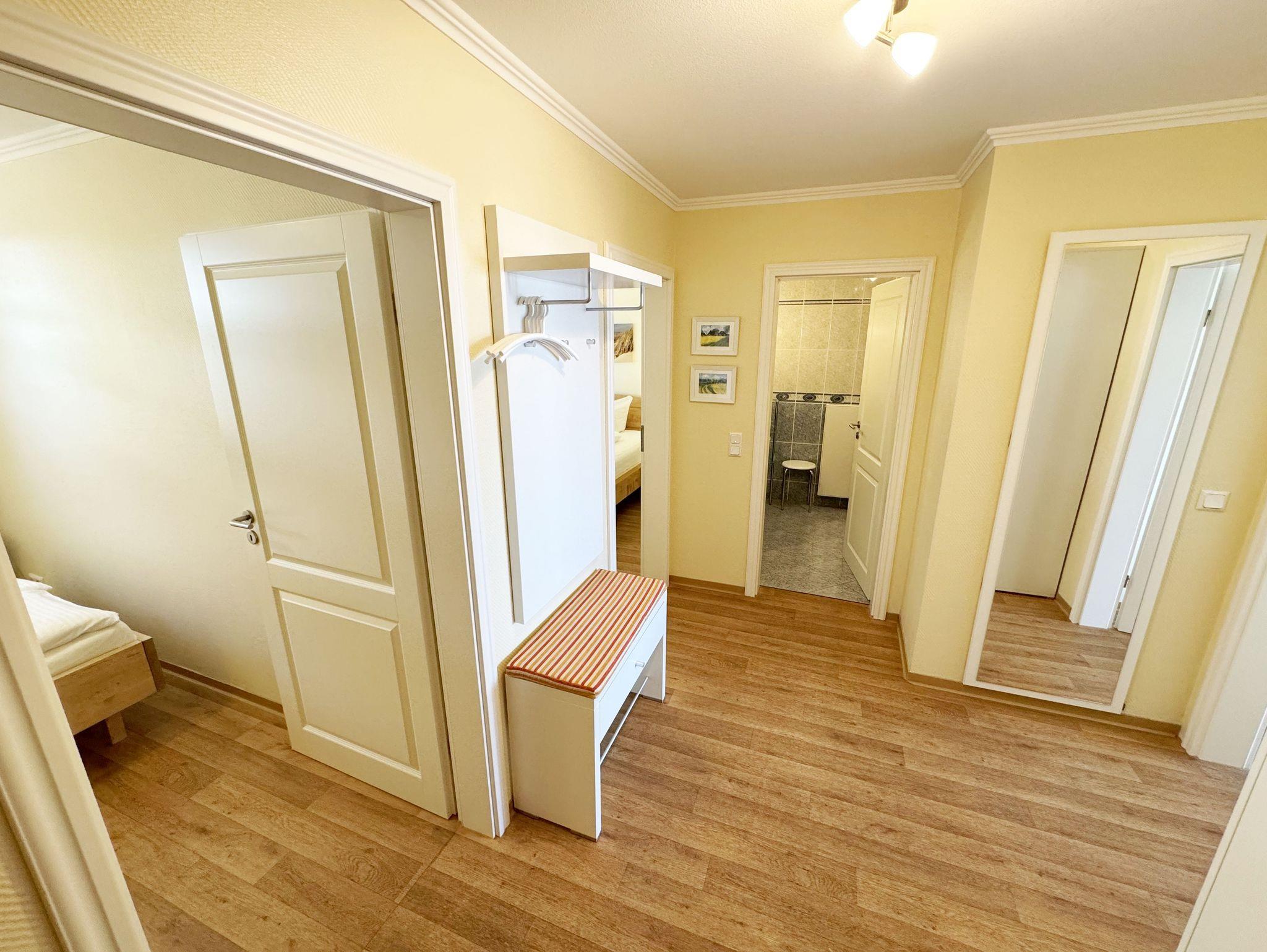 Die vom DTV mit vier Sternen ausgezeichnete Nichtraucherferienwohnung beherbergt max. 4 Erwachsene + 1 Kleinkind bis 3 Jahre im Kinderreisebett bei ca. 61qm und befindet sich im 2. Obergeschoss im Haus Having. Sie ist hell und freundlich eingerichtet, in warmen Tönen gehalten, hochwertig und zugleich funktional ausgestattet und bietet ein niveauvolles Ambiente. Der Flur im Eingangsbereich der Wohnung ist neben einer Garderobe mit Schuhbank und Wandspiegel auch mit einem großen Schrank mit ausreichend Stauraum ausgestattet. Das großzügige Wohnzimmer mit großer Fensterfront ist mit einer gemütlichen Couch, Couchtisch, einen Sessel mit Hocker, einer Leselampe, einen Schreibtisch, einen Smart-TV, einen Blu-Ray Player, eine Yamaha-Mini-Stereoanlage mit Bluetooth und USB-Anschluss, DAB-Radio sowie Lektüre rund um Rügen und Gesellschaftsspielen ausgestattet. Ein WLAN-Anschluss, welcher für Sie inklusive ist, rundet den technischen Bereich ab. Auf dem nach Süden ausgerichteten weitgehend überdachten großen Balkon mit Bestuhlung, einen Sonnenschirm und klappbarer Sonnenliege können Sie ausgiebig sonnenbaden und entspannt frühstücken und dabei eine traumhafte Aussicht über die Ostsee und die Halbinsel Mönchgut genießen. Im Wohnbereich befinden sich eine voll ausgestattete Küchenzeile mit Cerankochfeld, Backofen, Mikrowelle, Geschirrspüler, Kühlschrank mit Gefrierfach, Mixer, Kaffeemaschine, Senseo Pad Kaffeemaschine, Wasserkocher, Toaster sowie diverse Küchenutensilien. Ein bequemer Essbereich mit Lederfreischwingern schließt sich der Küchenzeile an. Im ersten Schlafzimmer finden Sie ein Doppelbett (1,80m x 2,00m/ H2/3) mit verstellbaren Lattenrosten, Nachttischablagen, einen Stuhl, sowie einen großen Kleiderschrank und ein TV-Gerät. Im zweiten und damit etwas kleineren Schlafzimmer befindet sich ein französisches Bett (1,40 x 2,00m, durchgehende Matratze/ H3) mit einer Nachttischablage und einem Kleiderschrank sowie ein Bügelbrett und Bügeleisen. Für einen erholsamen Schlaf finden Sie in beiden Schlafzimmern Verdunklungsmöglichkeiten, Insektenschutzgitter sowie helle Massivholzmöbel. Im innenliegenden Bad mit WC, Waschtisch und Dusche finden Sie zusätzlich einen Fön, einen Kosmetikspiegel, einen Hocker und ausreichend Ablageflächen. Alle Räumlichkeiten sind mit einem Vinylfußboden ausgelegt worden. Haustiere sind nicht erlaubt. Ein eigener PKW-Stellplatz (Nr.36) am Haus, sowie eine abschließbare Fahrradabstellmöglichkeit sind für Sie vorhanden. Hier können Sie auch Ihre E-Bikes problemlos aufladen. Eine Waschmaschine und ein Trockner kann in einem separaten Raum vom Haus Kaming exklusive genutzt werden. Die Erstausstattung eines Wäschepaketes (komplette Bettwäsche, 1 Duschhandtuch, 2 kleine Handtücher) ist inklusive. Ab 2 Paketen erhalten Sie einmalig 1 Geschirrhandtuch und 1 Duschvorleger hinzu. Haustiere sind in der Wohnung nicht erlaubt.