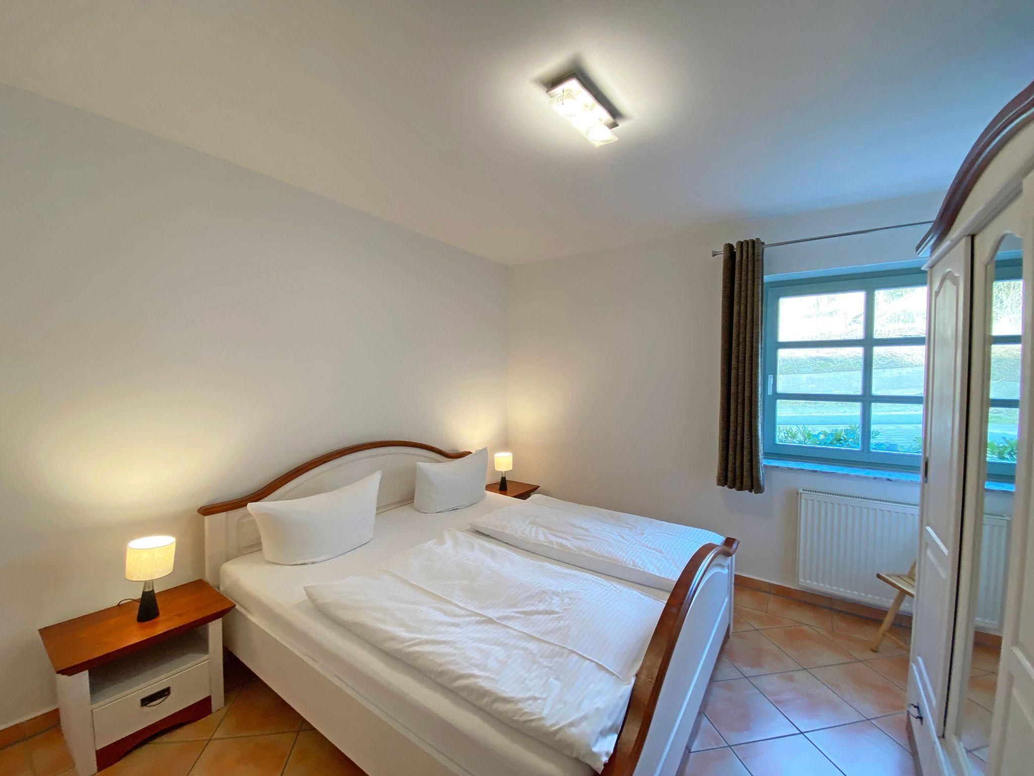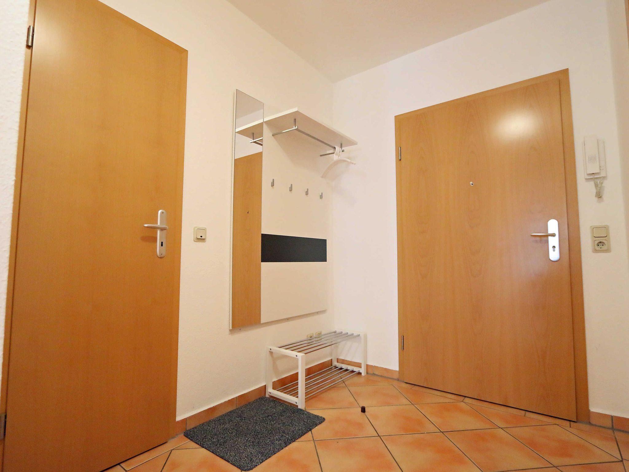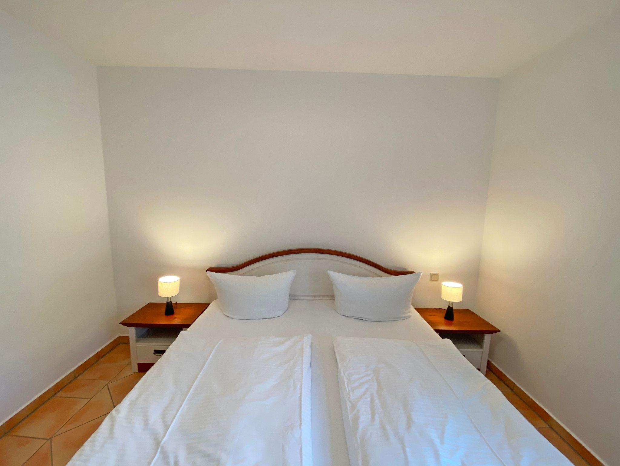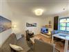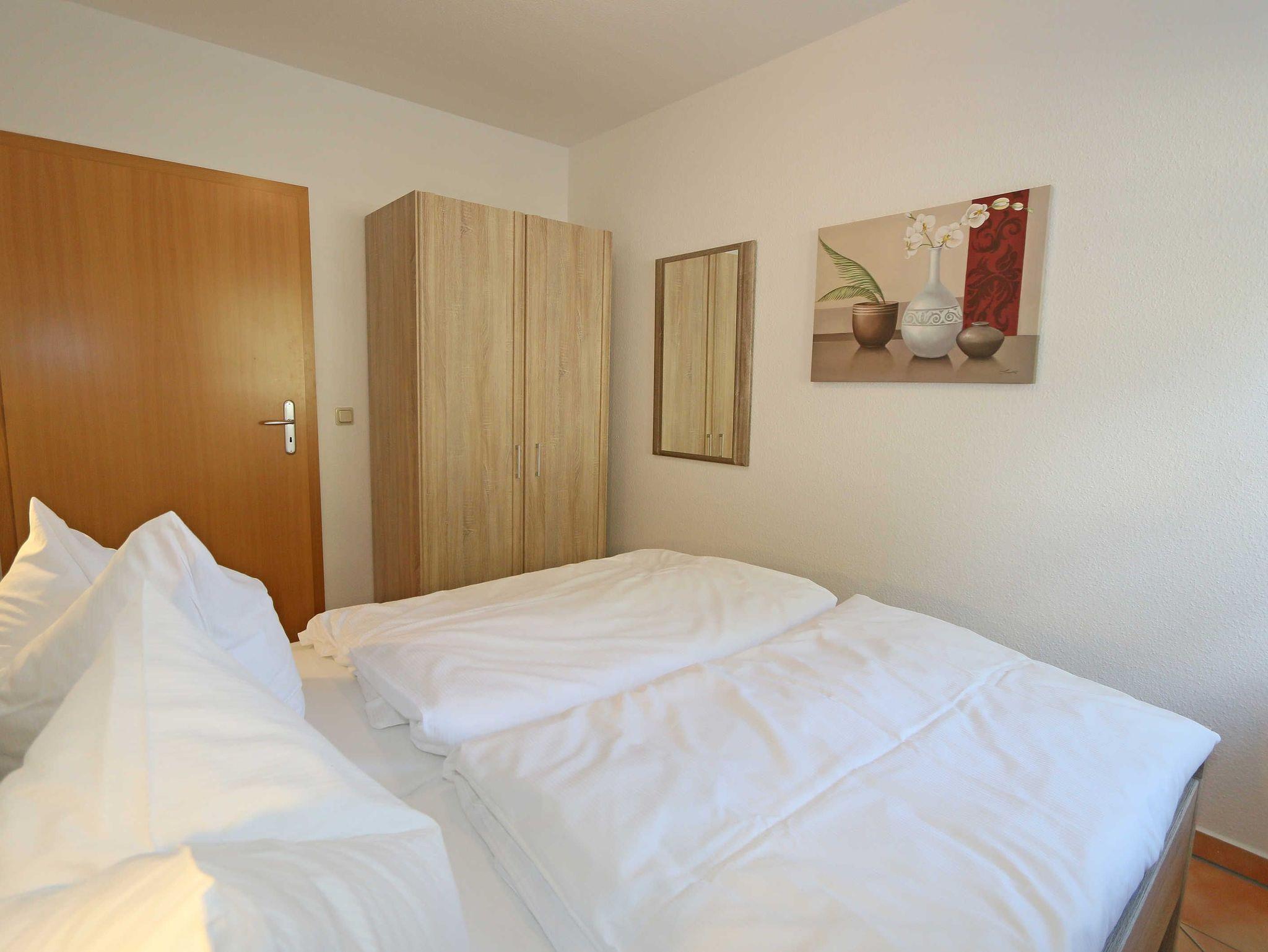 Die ca. 57m² große Nichtraucher-Wohnung befindet sich im Erdgeschoss des Hauses Südstrand und bietet Ihnen ausreichend Platz für 2 bis 4 Personen. Der moderne Wohnbereich lädt mit einer gemütlichen Polsterecke mit Couchtisch und Leselampe zur Entspannung ein. Für Ihre Unterhaltung können Sie dabei einen Flachbild-TV, einen DVD-Player und eine Mini-Stereo-Anlage nutzen. Der angrenzende Essbereich wird durch eine moderne Küchenzeile mit einer Kühl-Gefrierkombination, einem Geschirrspüler, einen Backofen und 4-Zonen Ceran-Kochfeld, einer Kaffeemaschine, einen Toaster und einen Wasserkocher sowie diverse Küchenutensilien, abgerundet. Der freundliche Essplatz befindet sich direkt am Fenster. Vom Wohnbereich gelangen Sie auf die überdachte und bestuhlte Terrasse (Ost), welche Sie bereits in den Morgenstunden mit Sonne verwöhnt. Alle Räumlichkeiten können Sie vom Flur mit Garderobe erreichen sowie beide Schlafzimmer. Im ersten Schlafzimmer befinden sich ein Doppelbett (1,80 m x 2,00 m) mit Federkernmatratzen und Nachttischablagen und ein großer Kleiderschrank. Das kleinere Schlafzimmer ist mit einem Doppelbett (1,60 m x 2,00 m) und einem Kleiderschrank ausgestattet. Beide Schlafzimmer können durch Außenrollos verdunkelt werden, somit steht einem ruhigen Schlaf nichts im Wege. Der Sanitärbereich wird durch eine Dusche, WC, Fön und einem Waschplatz abgerundet. Ein kleiner Abstellraum bietet eine gute Möglichkeit Dinge zu verstauen. Unteranderem befinden sich hier diverse Reinigungsutensilien. Haustiere sind nicht erlaubt. Auch im Urlaub brauchen Sie auf einen Internetzugang (WLAN) in Ihrer Wohnung nicht zu verzichten. Dieser ist inklusive. Die Münzbetriebene Sauna steht allen Gästen des Hauses zur Verfügung. Ein inklusiver PKW-Stellplatz befindet sich direkt am Haus. Die Erstausstattung eines Wäschepaketes (komplette Bettwäsche, 1 Duschhandtuch, 2 kleine Handtücher) können Sie bis 14 Tage vor Anreise gegen einen Aufpreis dazu buchen oder durch eigene ergänzen. Ab 2 gebuchten Paketen erhalten Sie einmalig 1 Geschirrhandtuch und 1 Duschvorleger hinzu.
