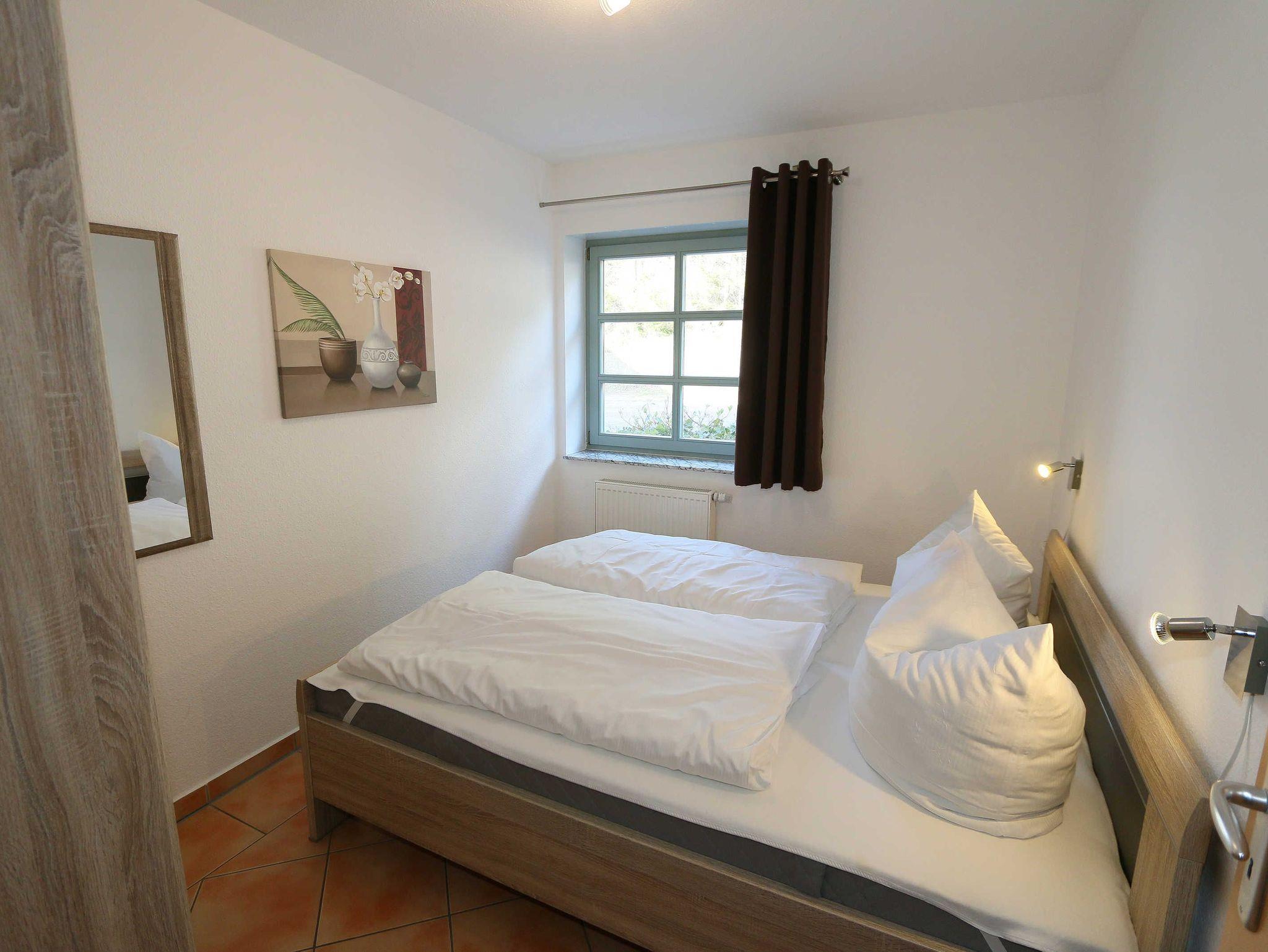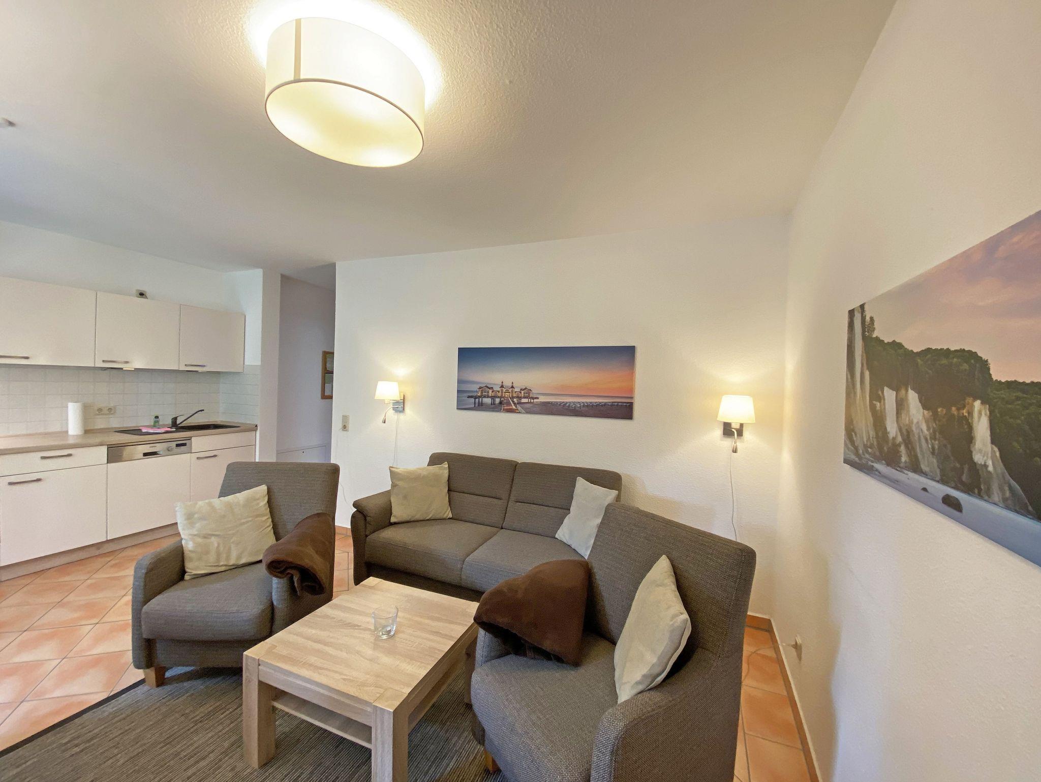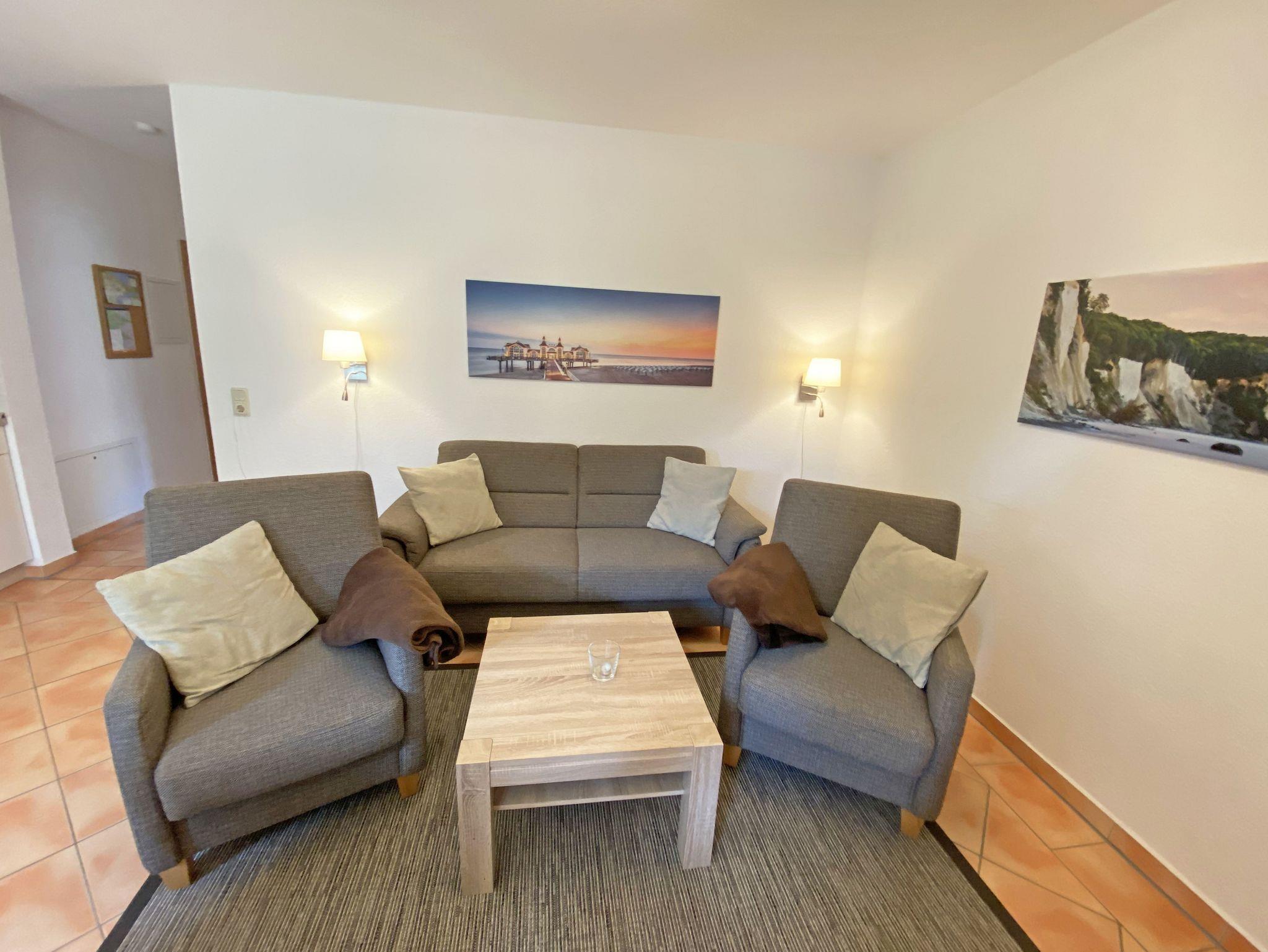 Die ca. 57m² große Nichtraucher-Wohnung befindet sich im Erdgeschoss des Hauses Südstrand und bietet Ihnen ausreichend Platz für 2 bis 4 Personen. Der moderne Wohnbereich lädt mit einer gemütlichen Polsterecke mit Couchtisch und Leselampe zur Entspannung ein. Für Ihre Unterhaltung können Sie dabei einen Flachbild-TV, einen DVD-Player und eine Mini-Stereo-Anlage nutzen. Der angrenzende Essbereich wird durch eine moderne Küchenzeile mit einer Kühl-Gefrierkombination, einem Geschirrspüler, einen Backofen und 4-Zonen Ceran-Kochfeld, einer Kaffeemaschine, einen Toaster und einen Wasserkocher sowie diverse Küchenutensilien, abgerundet. Der freundliche Essplatz befindet sich direkt am Fenster. Vom Wohnbereich gelangen Sie auf die überdachte und bestuhlte Terrasse (Ost), welche Sie bereits in den Morgenstunden mit Sonne verwöhnt. Alle Räumlichkeiten können Sie vom Flur mit Garderobe erreichen sowie beide Schlafzimmer. Im ersten Schlafzimmer befinden sich ein Doppelbett (1,80 m x 2,00 m) mit Federkernmatratzen und Nachttischablagen und ein großer Kleiderschrank. Das kleinere Schlafzimmer ist mit einem Doppelbett (1,60 m x 2,00 m) und einem Kleiderschrank ausgestattet. Beide Schlafzimmer können durch Außenrollos verdunkelt werden, somit steht einem ruhigen Schlaf nichts im Wege. Der Sanitärbereich wird durch eine Dusche, WC, Fön und einem Waschplatz abgerundet. Ein kleiner Abstellraum bietet eine gute Möglichkeit Dinge zu verstauen. Unteranderem befinden sich hier diverse Reinigungsutensilien. Haustiere sind nicht erlaubt. Auch im Urlaub brauchen Sie auf einen Internetzugang (WLAN) in Ihrer Wohnung nicht zu verzichten. Dieser ist inklusive. Die Münzbetriebene Sauna steht allen Gästen des Hauses zur Verfügung. Ein inklusiver PKW-Stellplatz befindet sich direkt am Haus. Die Erstausstattung eines Wäschepaketes (komplette Bettwäsche, 1 Duschhandtuch, 2 kleine Handtücher) können Sie bis 14 Tage vor Anreise gegen einen Aufpreis dazu buchen oder durch eigene ergänzen. Ab 2 gebuchten Paketen erhalten Sie einmalig 1 Geschirrhandtuch und 1 Duschvorleger hinzu.