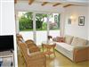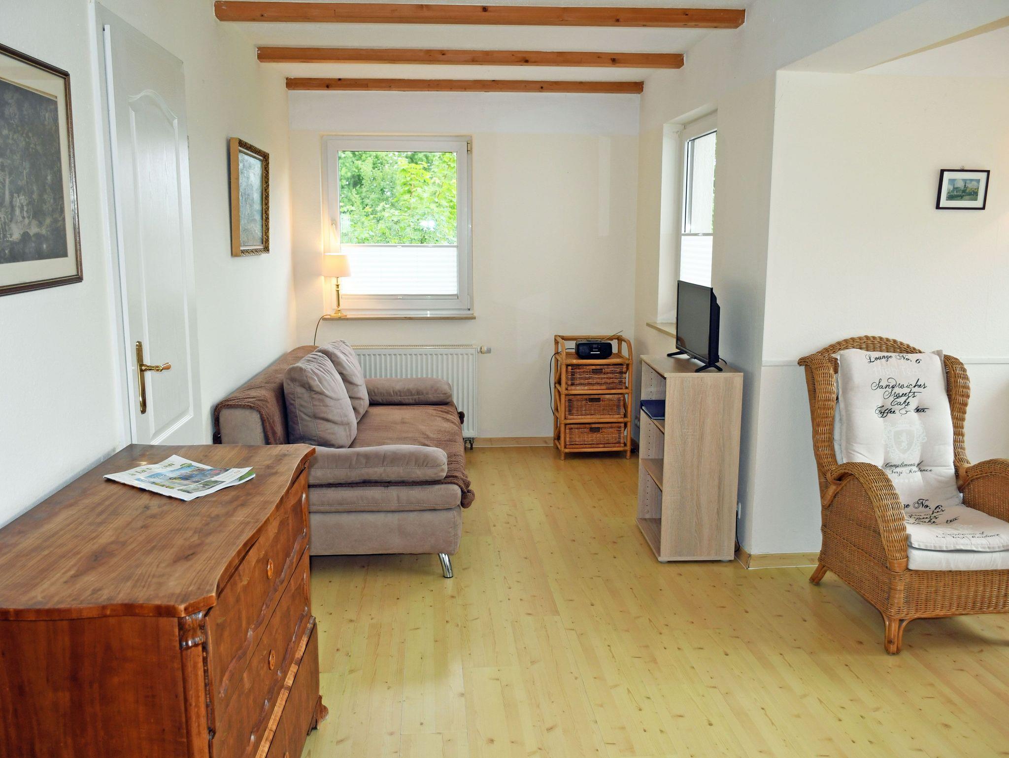 * Wohnbereich mit heller Couchgarnitur und 2 Sesseln mit Couchtisch, TV mit Radio und Esstisch mit 4 Stühlen