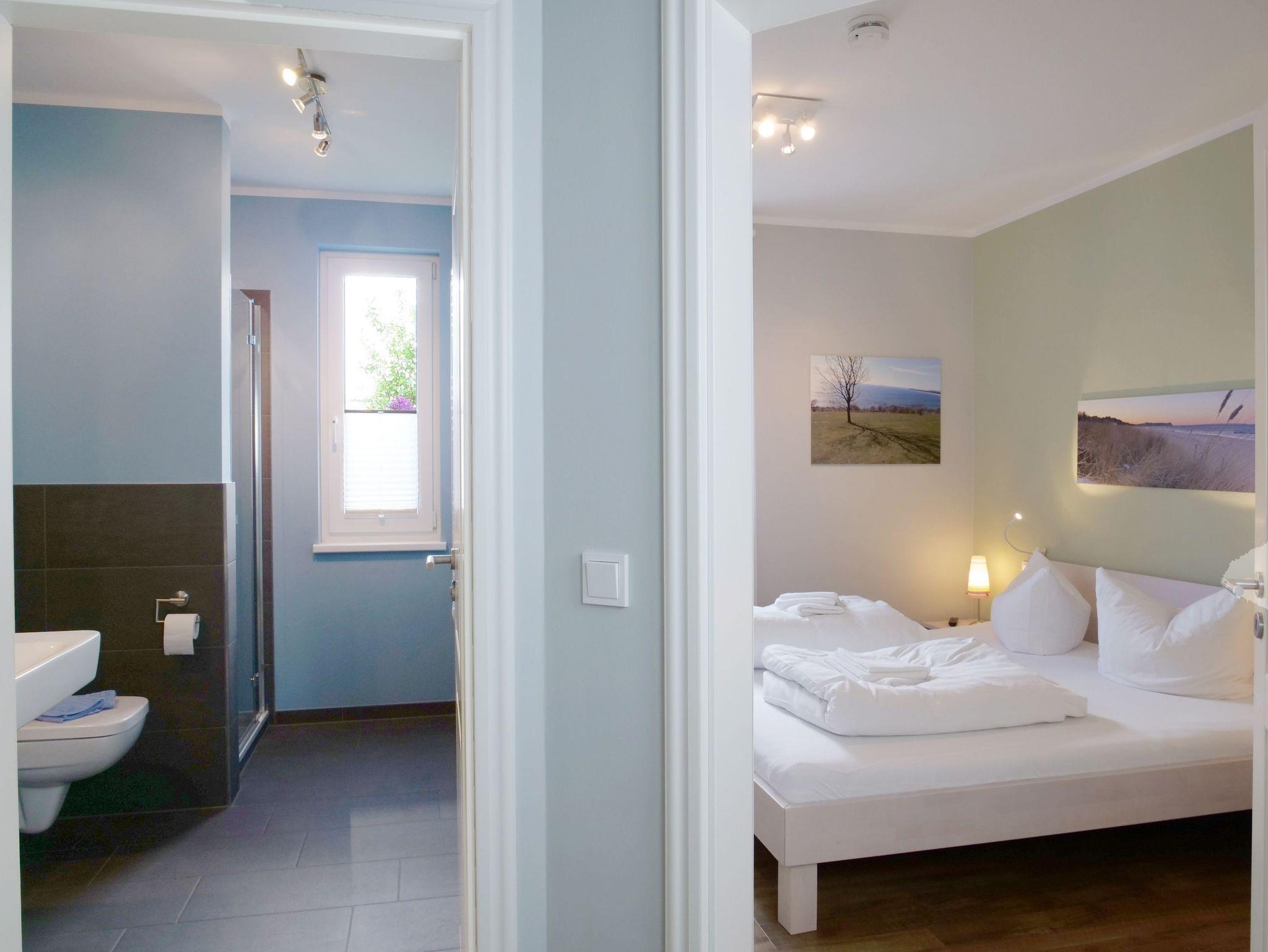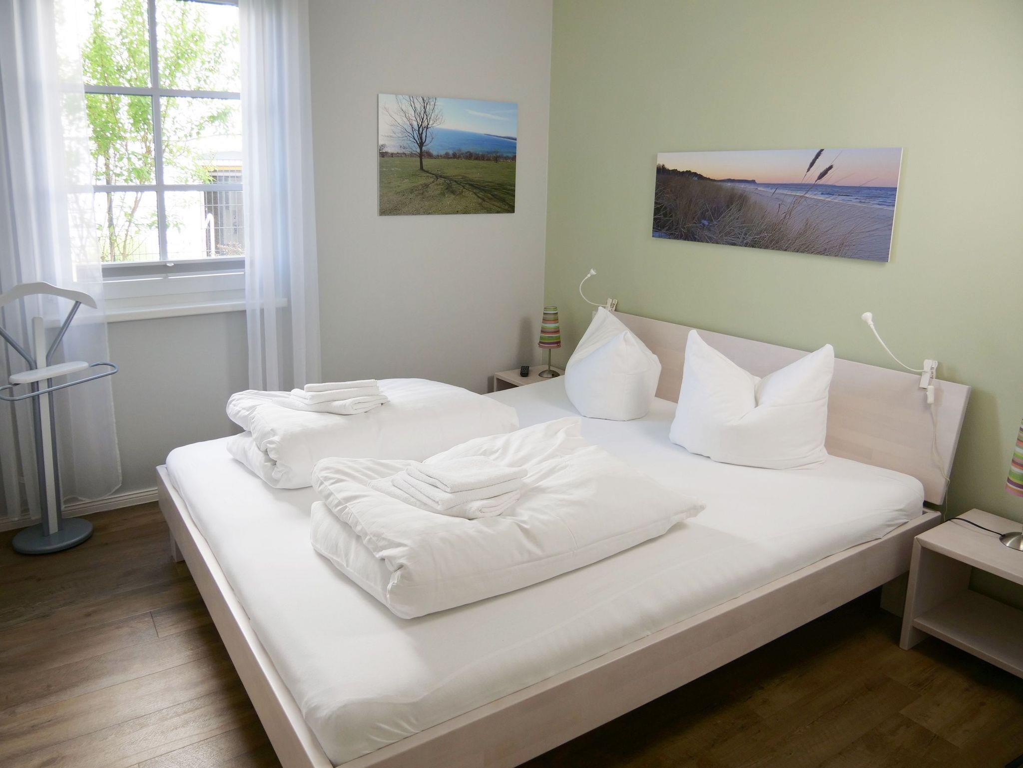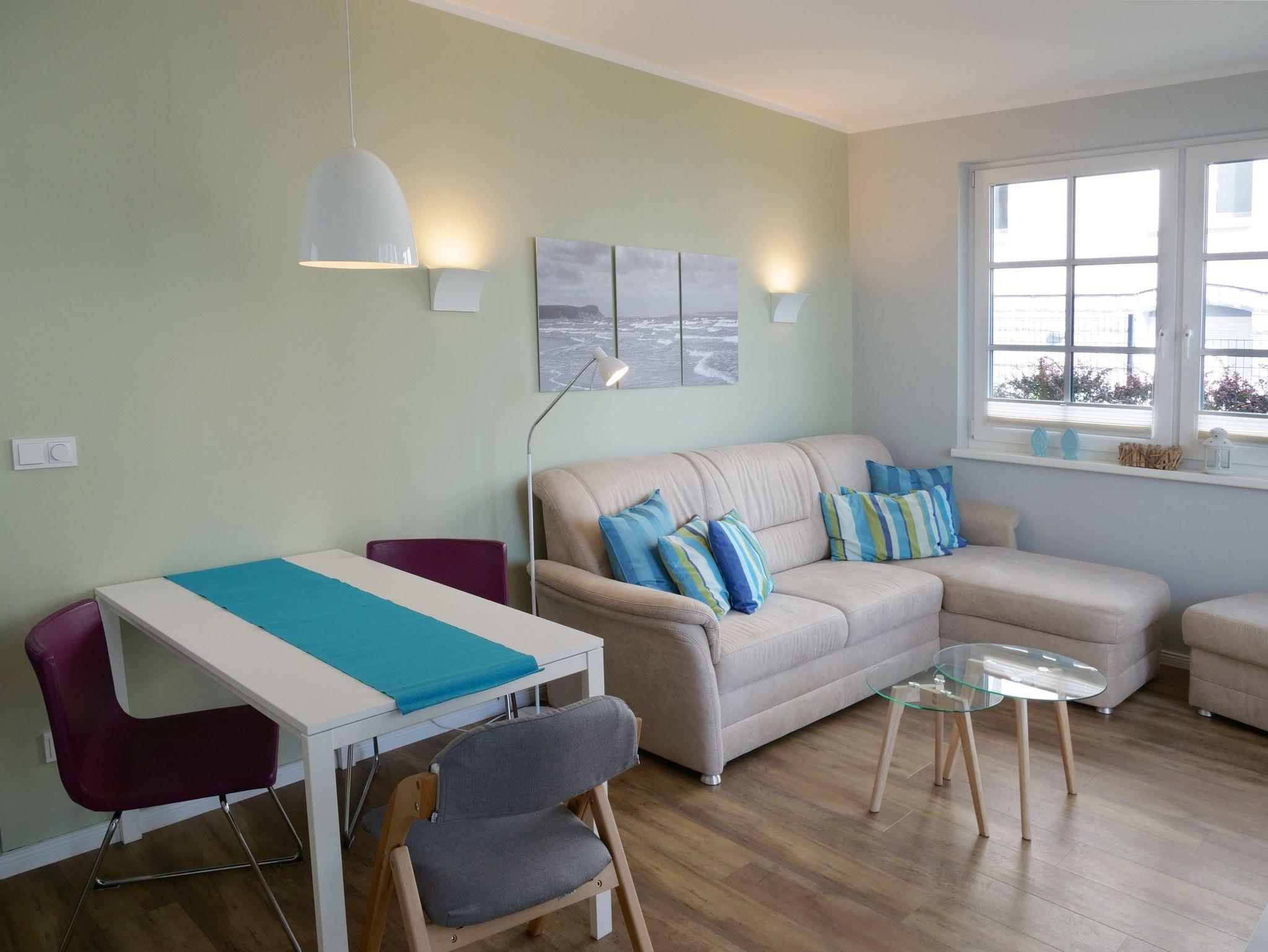 Diese sehr liebevoll und hochwertig eingerichtete 2-Raum-Ferienwohnung befindet sich im Erdgeschoss und verfügt über ca. 50 m² Wohnfläche. Die Nichtraucherwohnung ist ideal für max. 2 - 3 Personen geeignet. Auf der teilweise überdachten Terrasse (Ost) mit einem eigenen Strandkorb kann der Tag mit einem guten Frühstück in der Morgensonne beginnen. Die moderne und gemütliche Einrichtung wird unterstrichen durch eine geschmackvolle Farbgestaltung und erzeugt mit individuellen Rügen-Bildern ein sofortiges Urlaubsfeeling. Schöne Möbel kombiniert mit ansprechender Deko und auch die technische Ausstattung lassen keine Wünsche offen. Im Wohnzimmer sorgen eine gemütliche Couch (Aufbettung 3. Person/ 1,20m x 2,00m), eine Leselampe, der Esstisch und die in den Wohnbereich harmonisch integrierte Küchenzeile für eine angenehme Wohnatmosphäre. In der modern ausgestatteten Einbauküche erwarten Sie ein 4-Zonen-Cerankochfeld mit Backofen, ein Kühlschrank mit 3*-Gefrierfach, ein Toaster, ein Wasserkocher, eine Geschirrspülmaschine, eine Kaffeemaschine mit Thermoskanne sowie ein Delongi Kaffeevollautomat und diverse Küchenutensilien. Im Wohn- sowie im Schlafzimmer stehen Ihnen moderne Flachbildschirm-TV-Geräte zur Verfügung. Ein PEAQ-Micro-Audio-System mit Radio, CD-Player, Speicherkarten/USB-Wiedergabe sowie Bluetooth-Kopplung, ein DVD-Player sowie die kostenfreie Nutzung von WLAN runden das Angebot ab. Im ansprechenden Schlafzimmer sind ein Doppelbett (1,80m x 2,00m), 2 Nachttischkonsolen, Insektenschutzgitter und ein Kleiderschrank vorhanden. Eine Fußbodenheizung sorgt für angenehme Temperaturen bei jeder Jahreszeit. Ein modernes und komfortabel ausgestattetes Bad mit ebenerdiger Dusche, WC, Waschtisch und Fön steht zur Verfügung. Über einen Fahrstuhl ist der zur Wohnung gehörende Tiefgaragenstellplatz Nr. 5 (Einfahrtshöhe 2,00m) im Untergeschoss zu erreichen. Dort befinden sich auch ein gemeinschaftlich genutzter Fahrradabstellraum und ein Waschraum mit Münzwaschmaschine und Münztrockner. Zur Erkundung der Umgebung stehen Ihnen zusätzlich 2 Fahrräder (1 Damen E-Bike und 1 Herren Trekking) zur Verfügung, was kein Vertragsbestandteil ist. Ein Haustier ist gegen eine Gebühr ein gern gesehener Gast. Die Erstausstattung eines Wäschepaketes (komplette Bettwäsche, 1 Duschhandtuch, 2 kleine Handtücher, 2 Geschirrhandtücher) können Sie bis 14 Tage vor Anreise gegen einen Aufpreis dazu buchen oder durch eigene ergänzen.