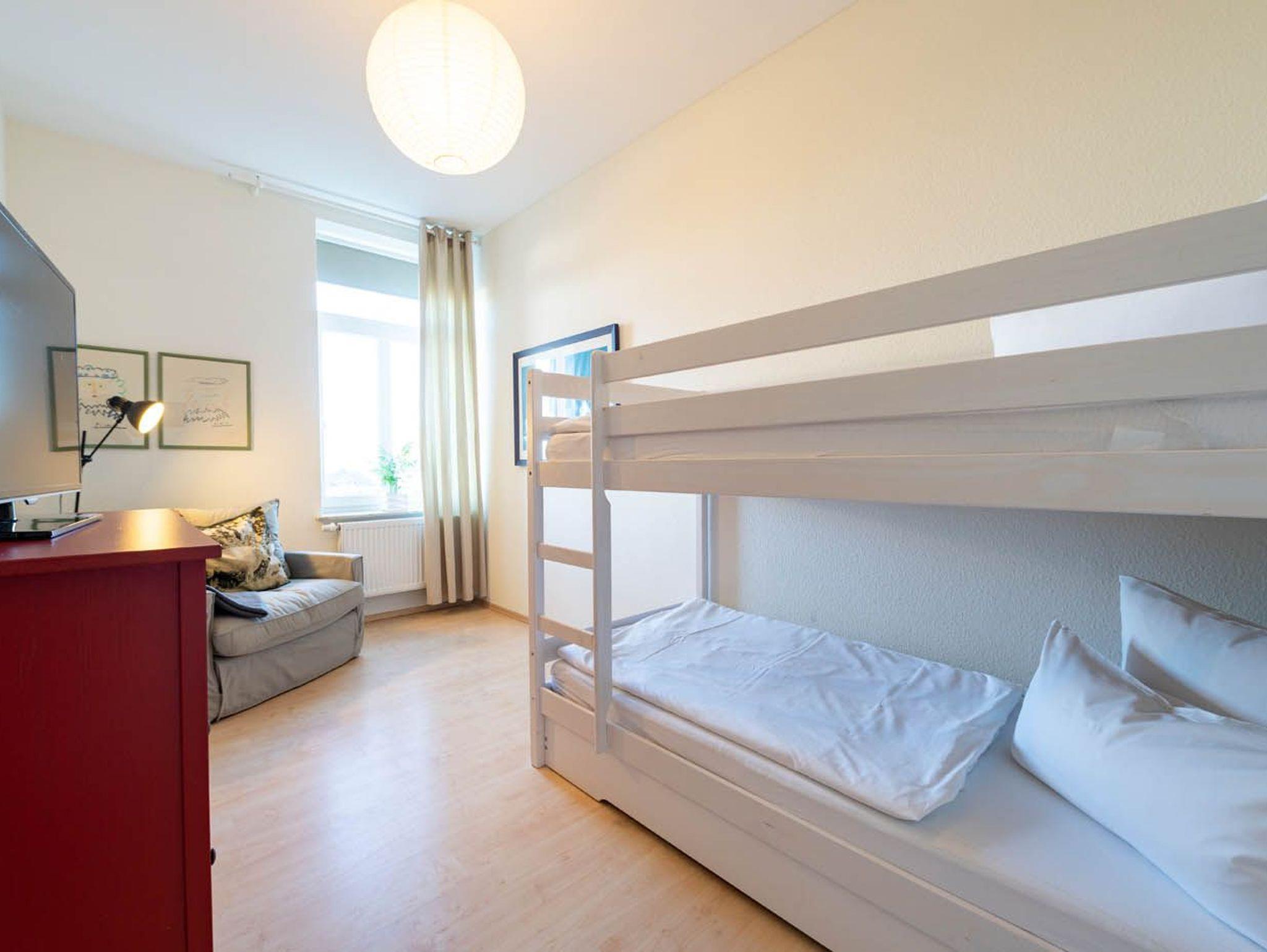 * Schlafzimmer mit Etagenbett (mit Meerblick), 1 Flat-TV, Kommode, Sessel, kleiner Tisch und 2 Stühle