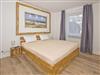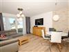 In der Ferienwohnung gibt es zwei Schlafzonen: zum einen das ausziehbare Schlafsofa im Wohnbereich und zum anderen das separate Schlafzimmer. Letzteres beherbergt ein 180 x 200 Zentimeter großes Doppelbett im charmanten Holzlook mit zwei dazu passenden kleinen Nachttischen. Über dem Bett erinnert Sie ein mächtig erwärmendes Bild an die pure Schönheit des Ortes, in dem Sie sich momentan aufhalten: Der Anblick des prächtigen Strandes vor dem weiten Meer geleitet Sie sicherlich in berauschende Träume. Des Weiteren finden Sie in der Räumlichkeit einen weißen Kleiderschrank und einen kleineren Flachbild-TV, der gegenüber des Schlafgemachs leicht erhöht angebracht ist.