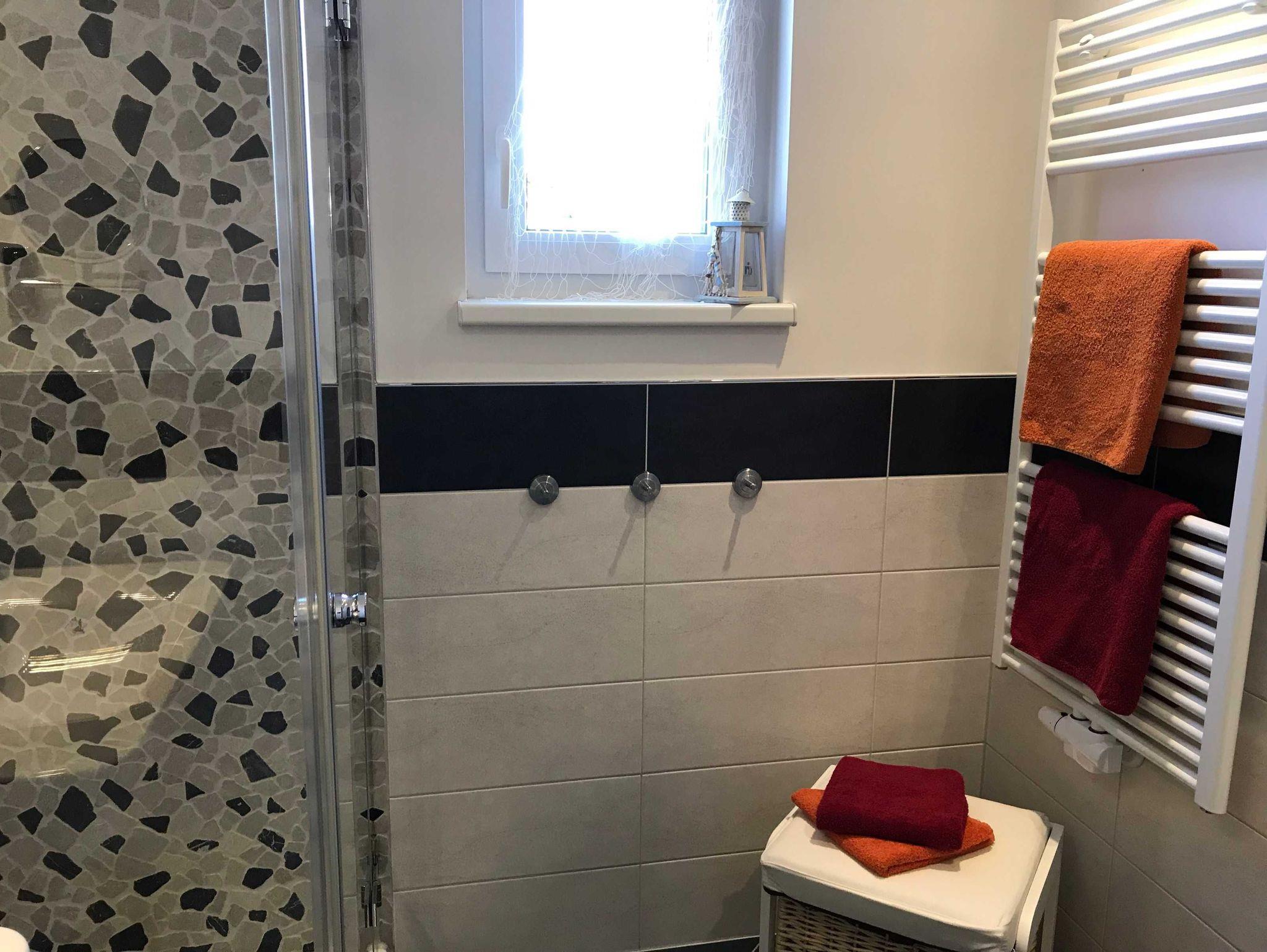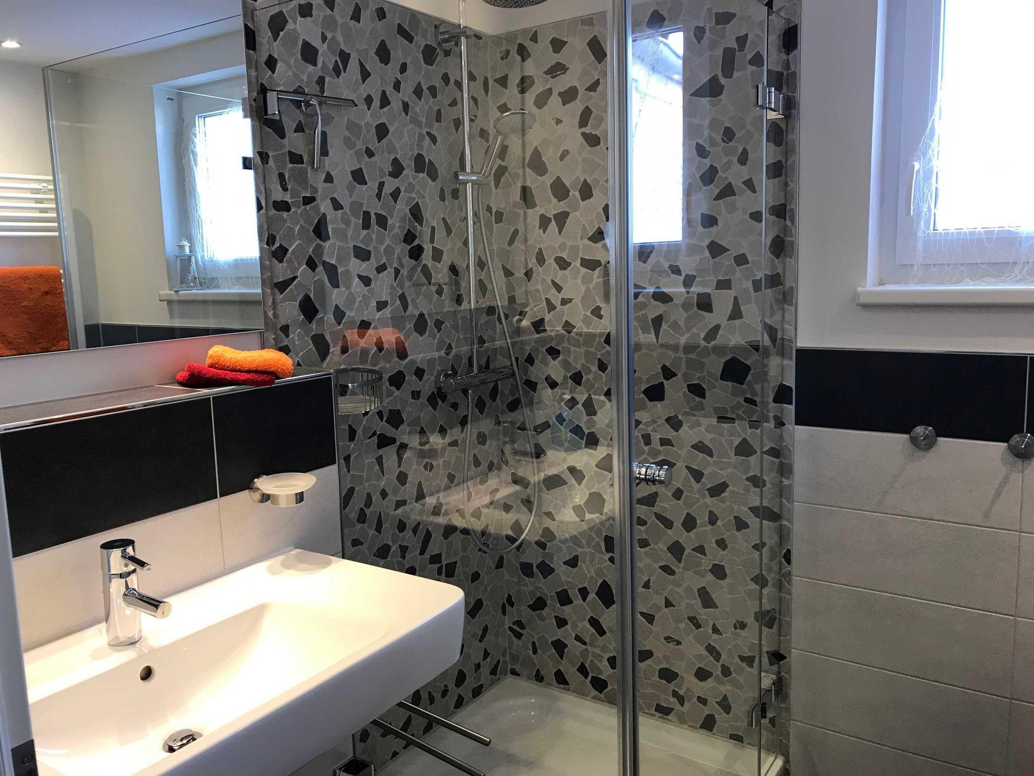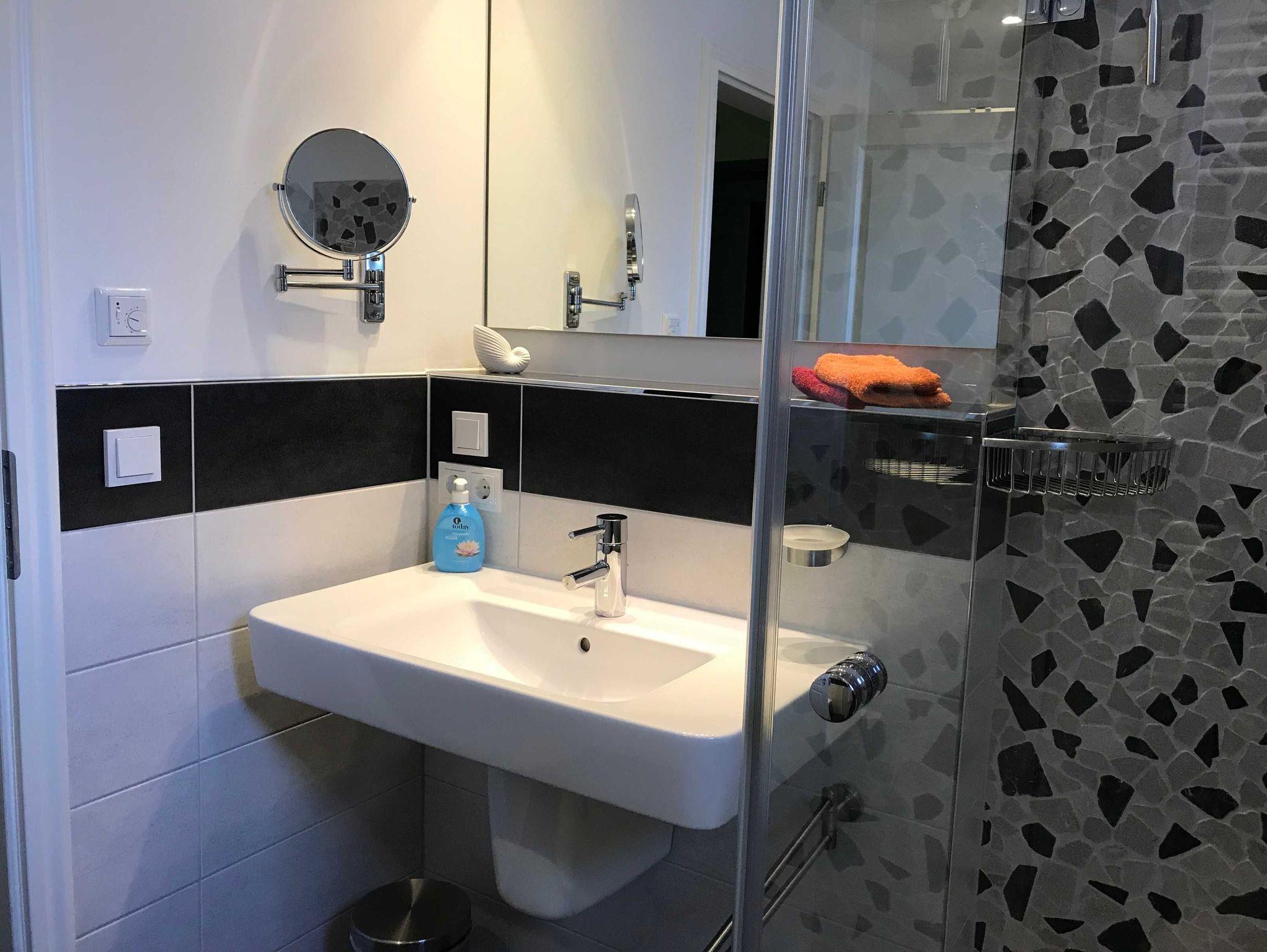 - hochwertiges Bad mit Dusche, großen Waschtisch, WC und Handtuchheizkörper
