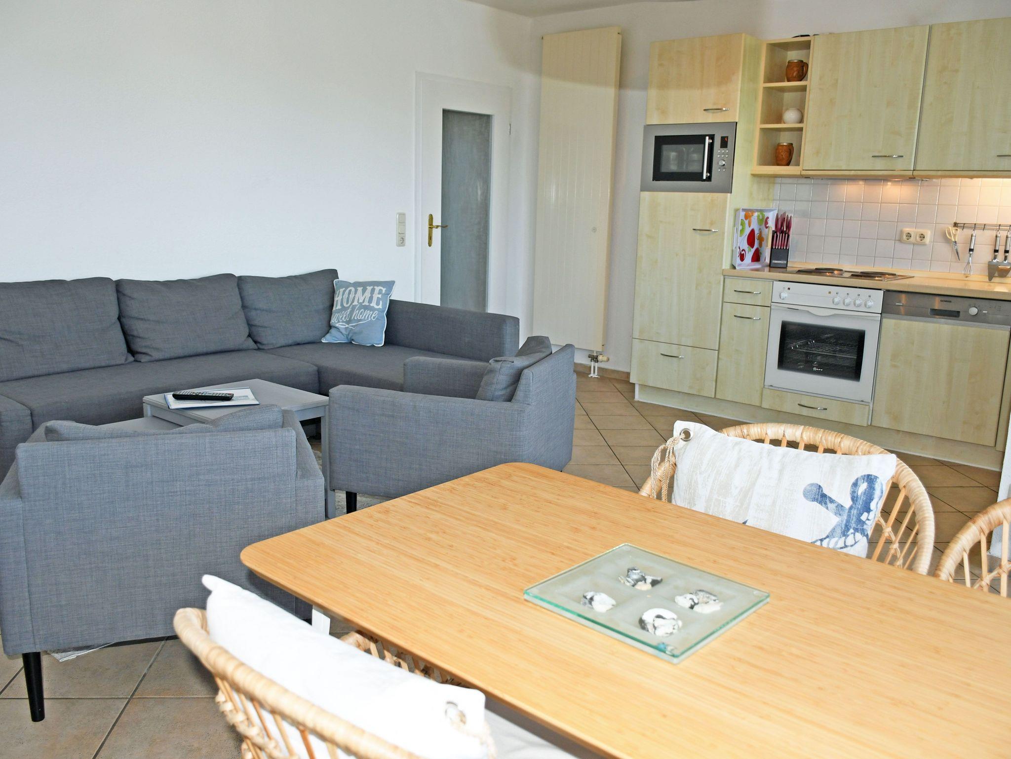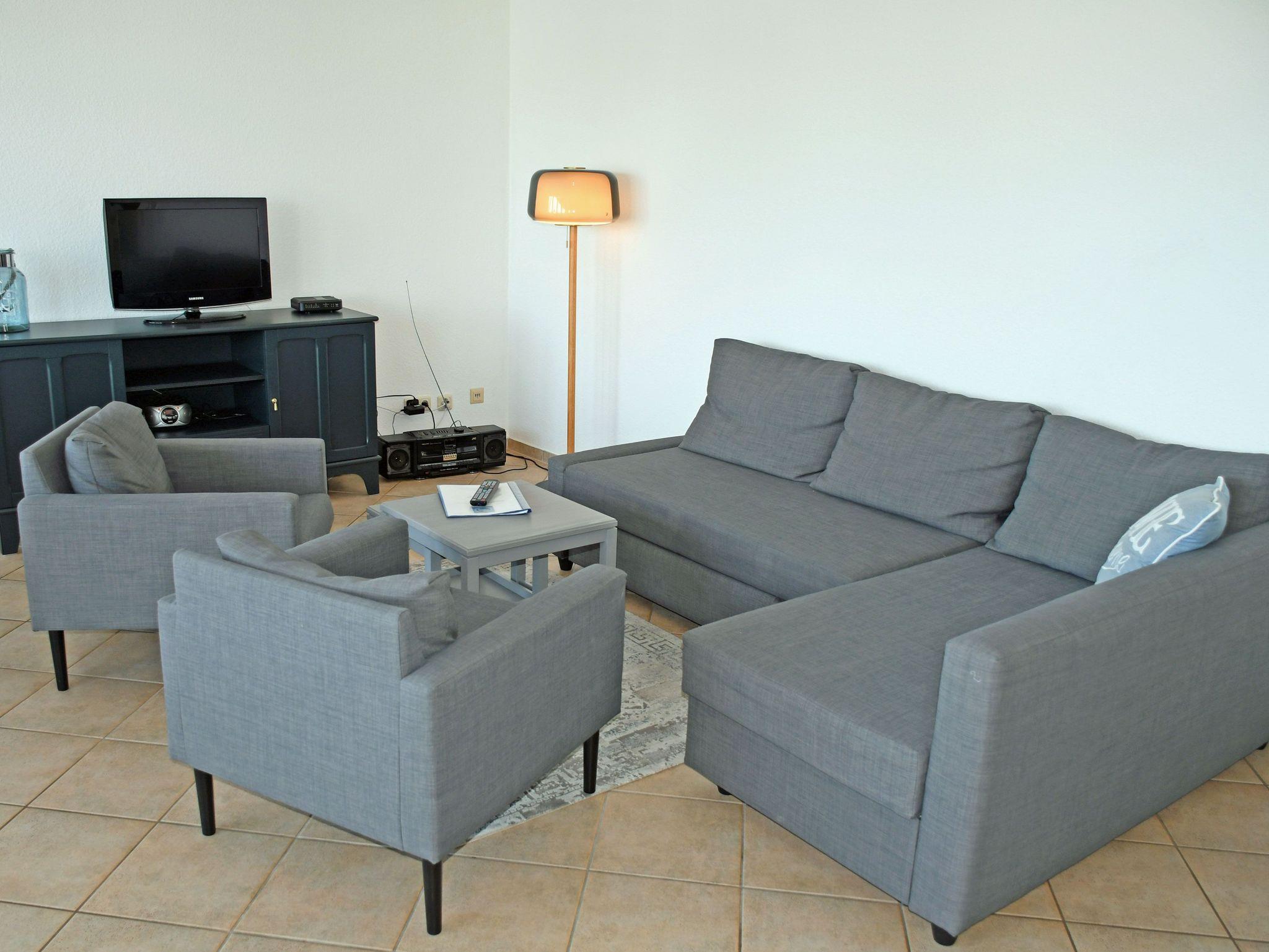 · Wohnbereich mit ausziehbarer, moderner Doppelbettschlafcouch (150 x 200 cm), 2 Sesseln, Couchtisch, Anrichte, Flat-TV, Radio und Esstisch mit 4Stühlen