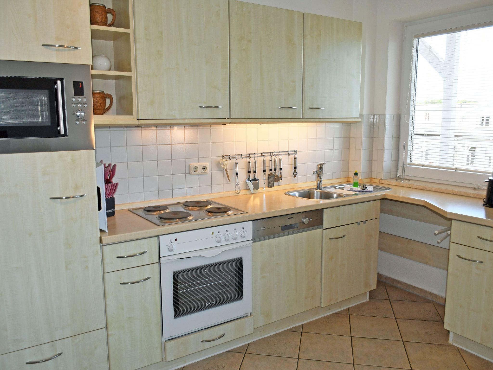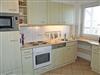 · Einbauküche im Wohnbereich integriert, ausgestattet mit: 4-Platten-Kochfeld, Backofen, Dunstabzugshaube, großer Kühlschrank mit Gefrierfach, Geschirrspüler, Mikrowelle, Toaster, Kaffeemaschine, Wasserkocher und Küchenutensilien