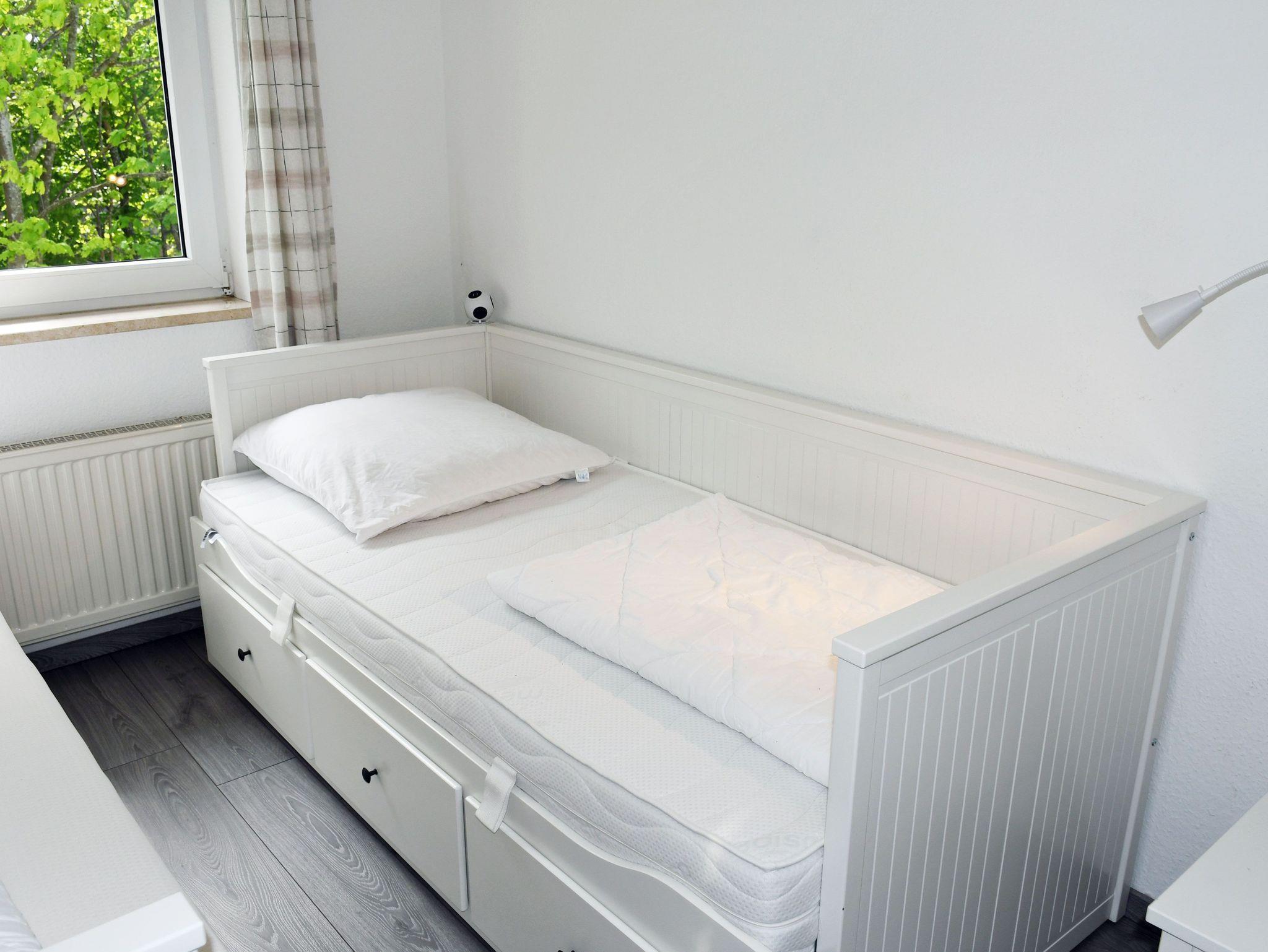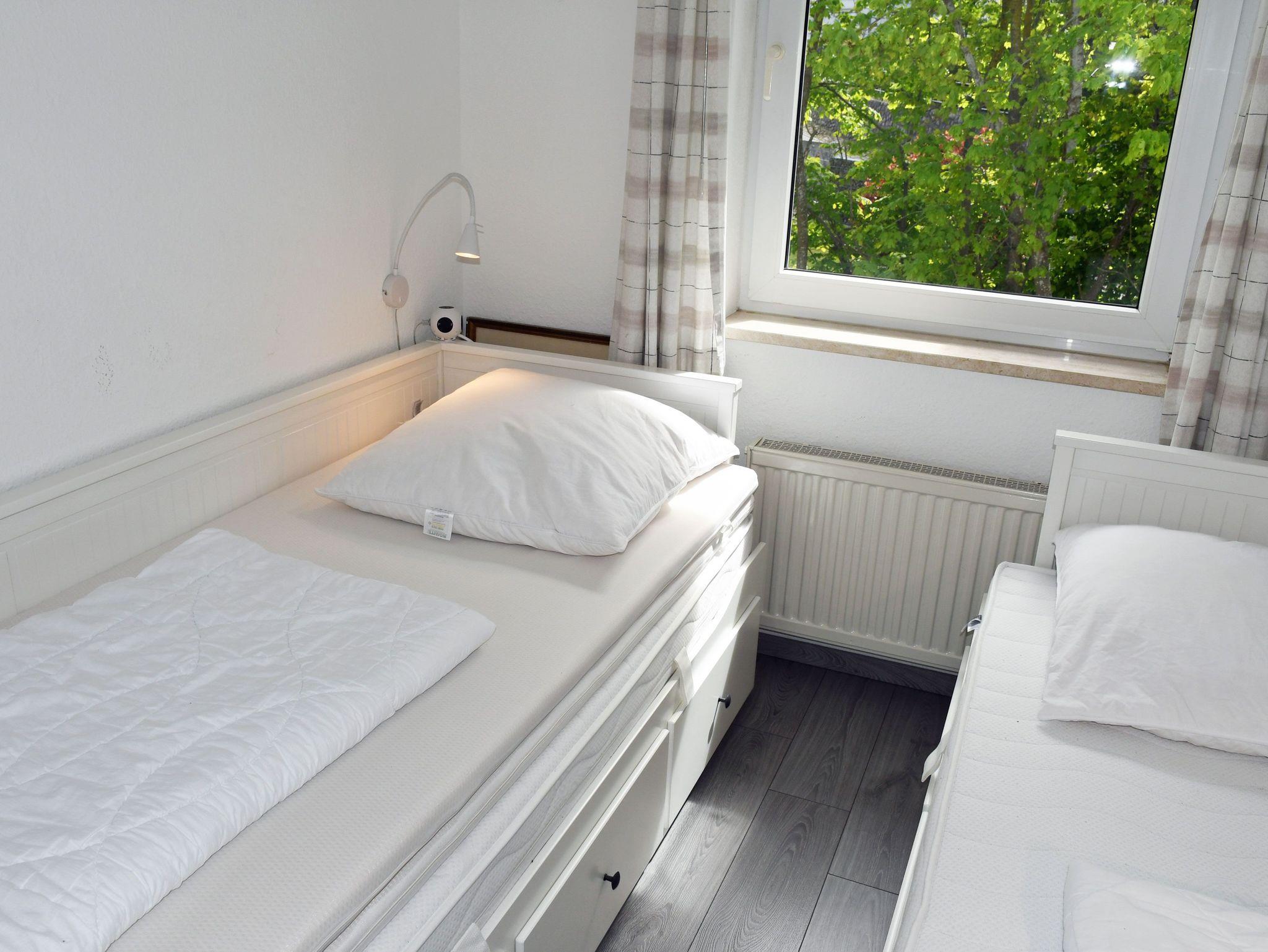 · Schlafzimmer mit 2 Einzelbetten (in der Fewo 18 Etagenbett) und kleinem Schreibtisch