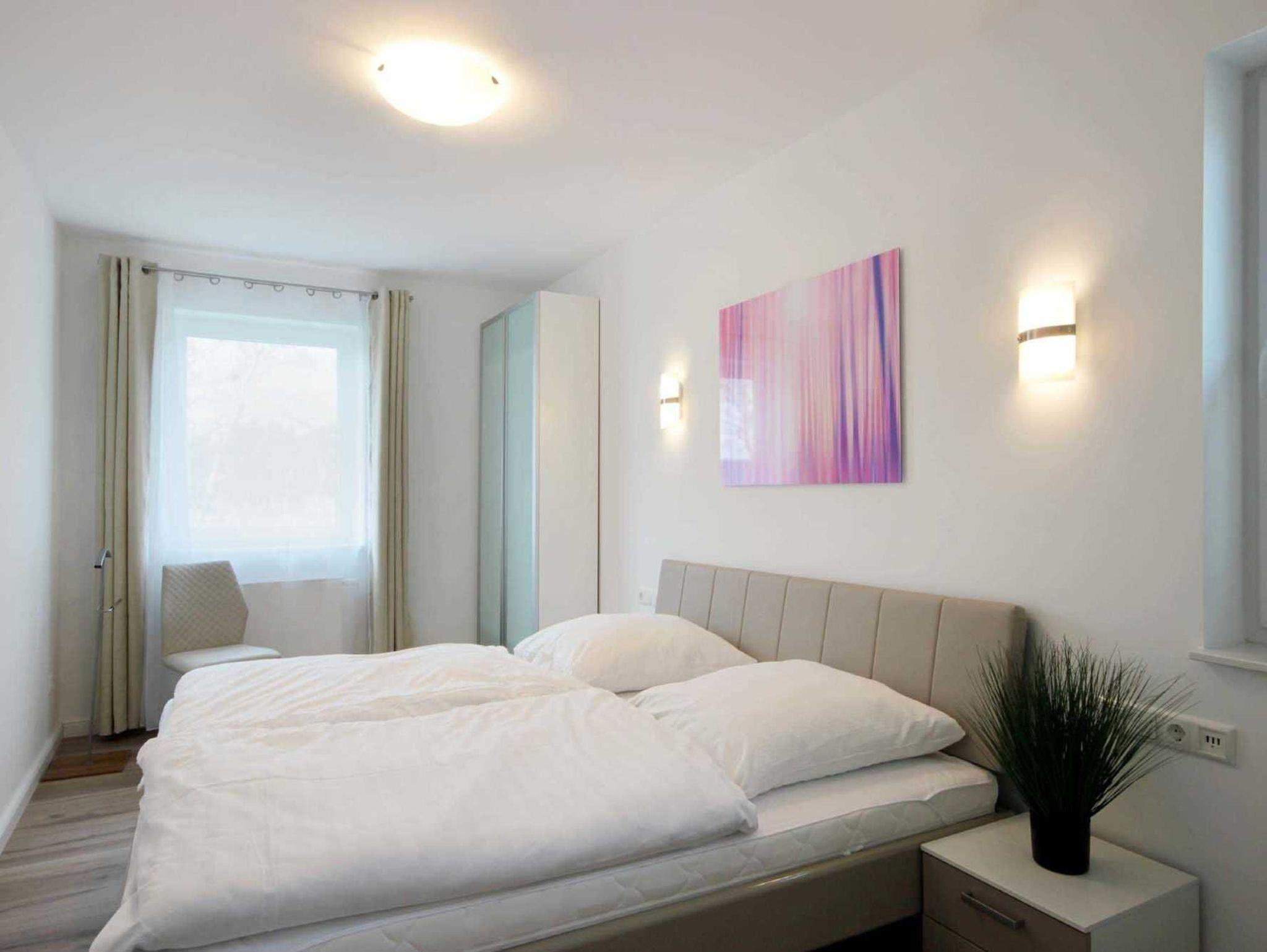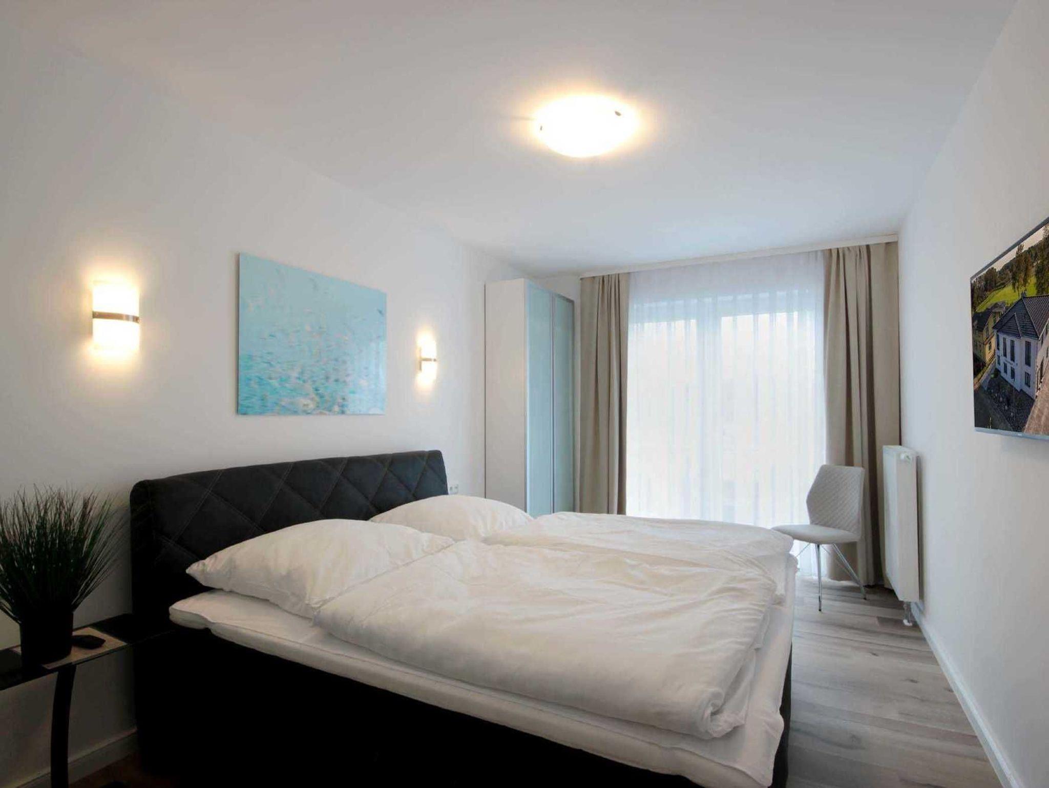 Über eine Treppe gelangen Sie in das Obergeschoss des Hauses mit 3 separaten Schlafzimmern. Hier erwarten Sie himmlische Träume in 2 gemütlichen Boxspringbetten und einem Standard-Doppelbett. In jedem Schlafraum befinden sich 1-2 Kleiderschränke. 2 Schlafräume haben einen weiteren Flachbildfernseher (43 Zoll). Ein Schlafzimmer verfügt über den direkten Zugang zum Balkon. Auf dieser Etage befindet sich nicht nur ein weiteres Tageslicht-Bad mit Dusche,Badewanne, Waschtisch und WC, sondern auch eine hauseigene Infrarotsauna (Münzbetrieb).