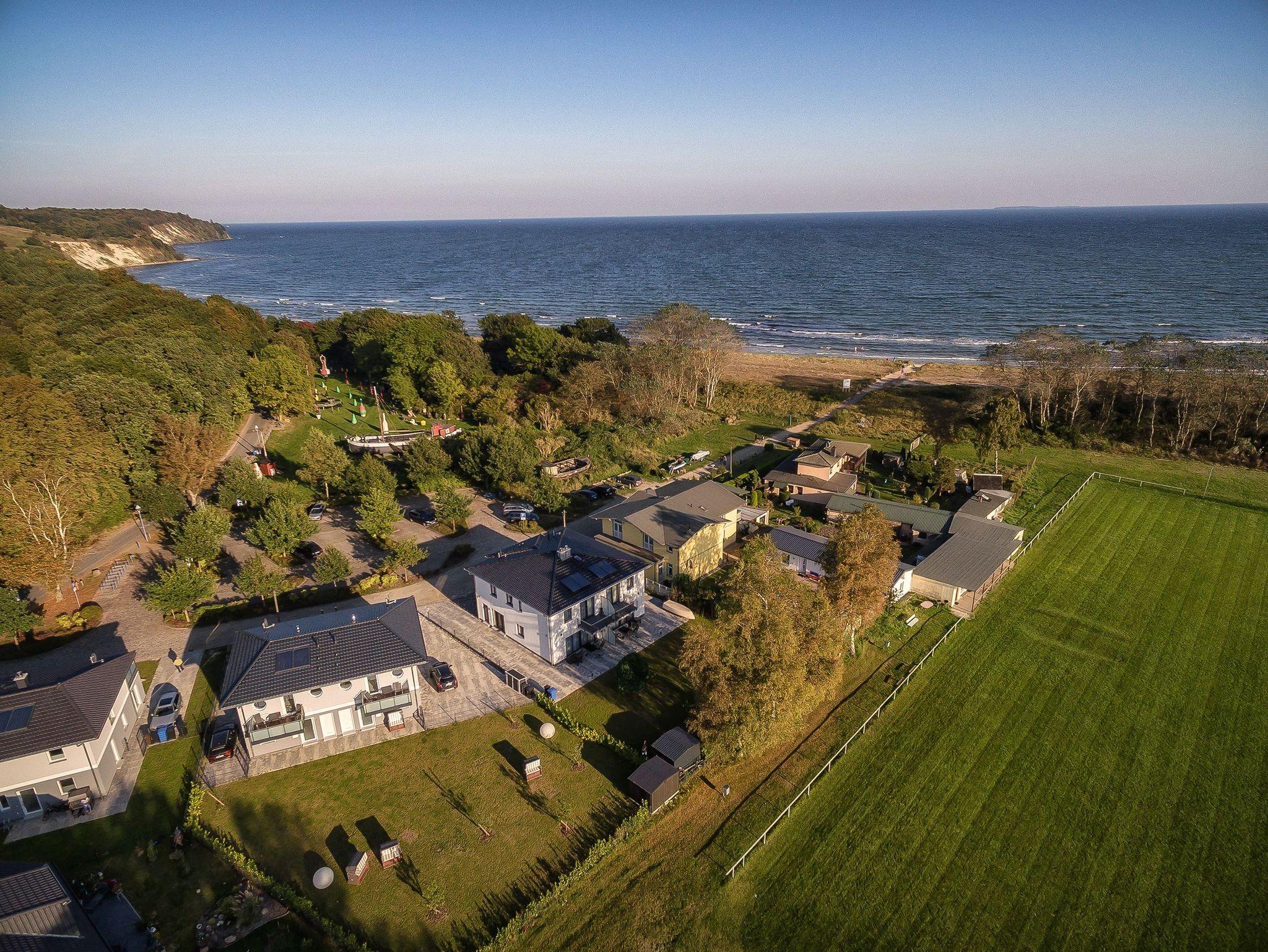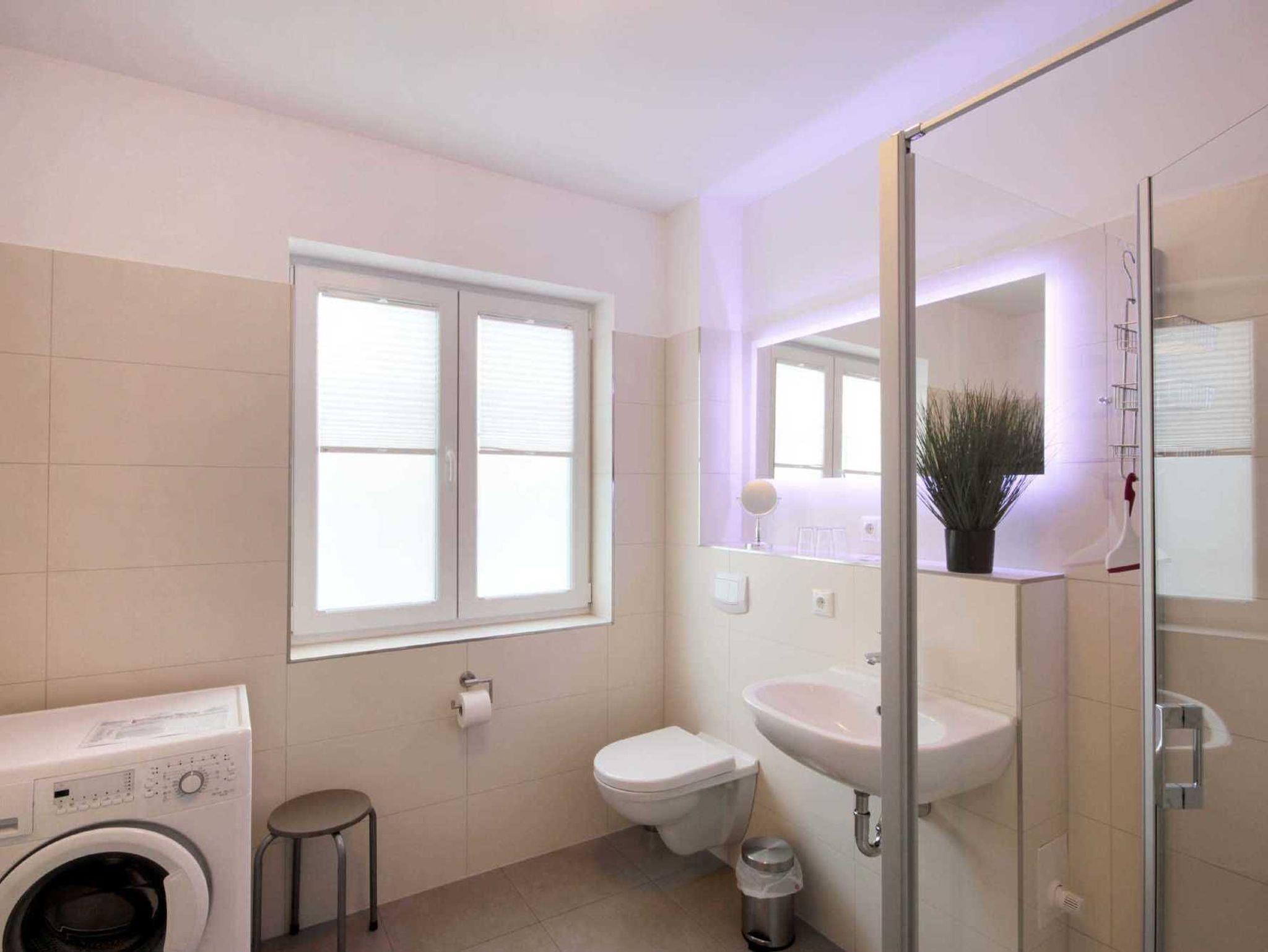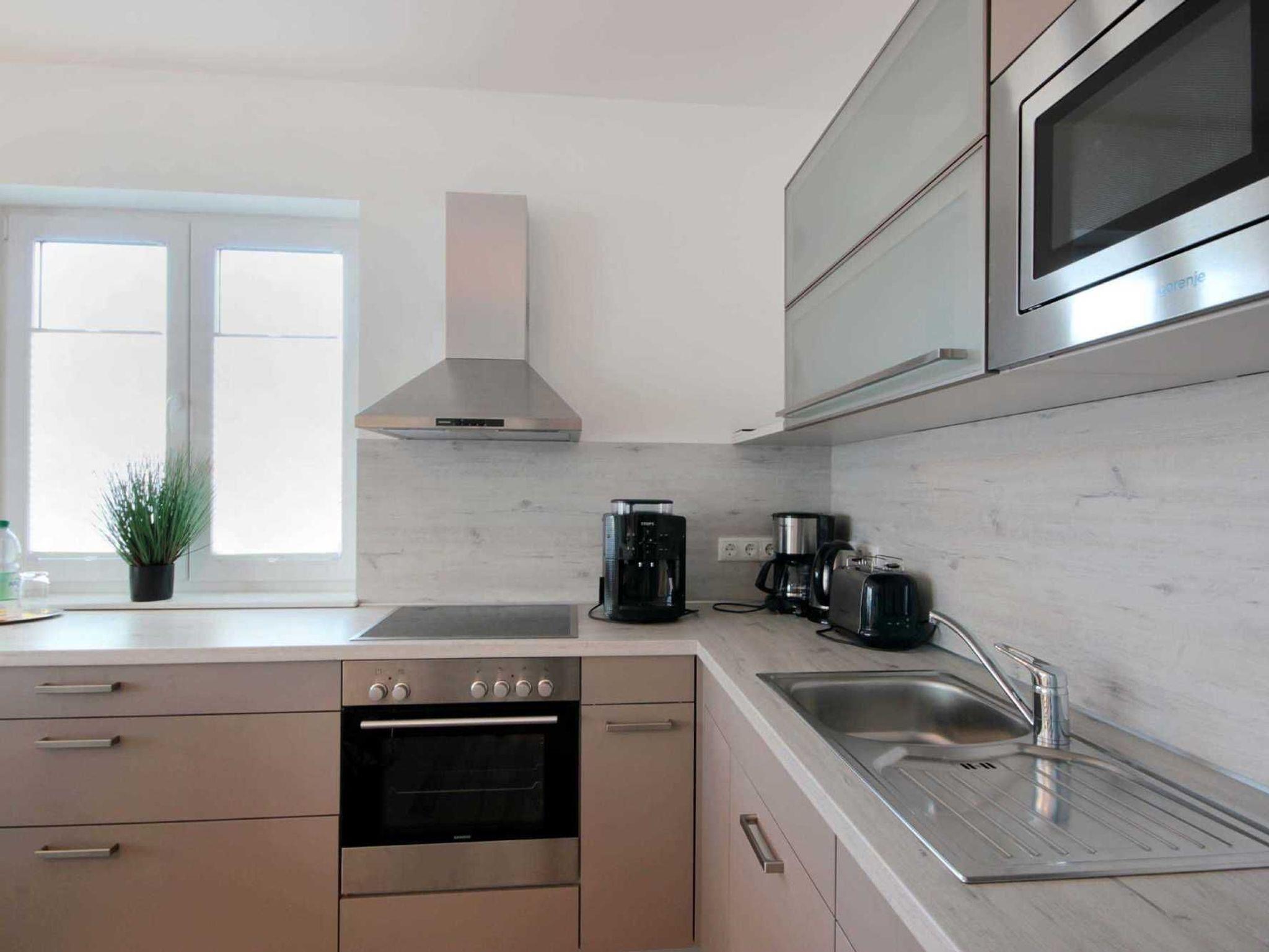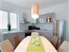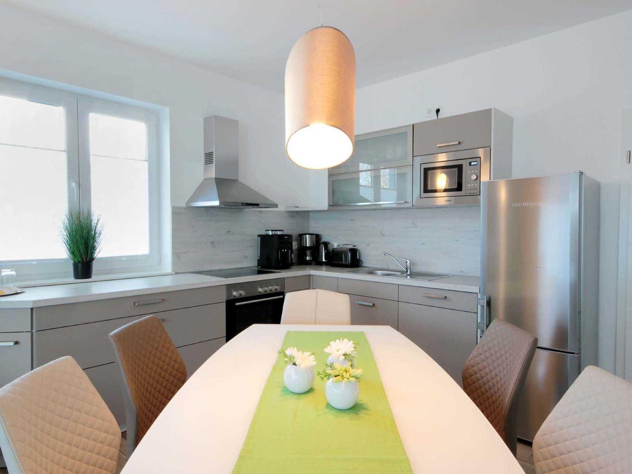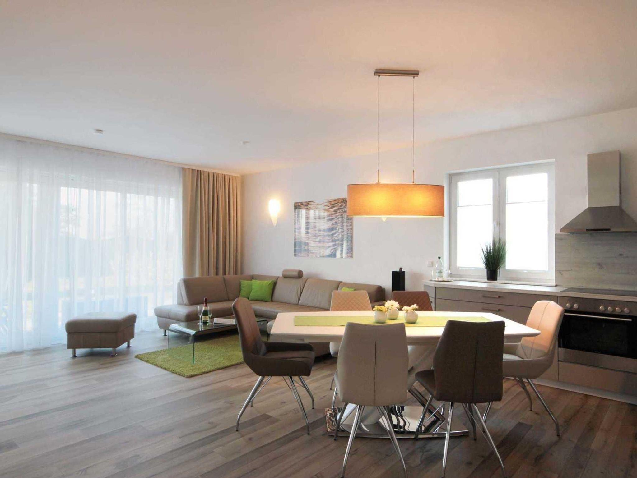 Im EG befindet sich der Wohnbereich mit einer großzügigen Sitzgruppe, Kamin sowie die moderne Küche und der Essbereich. Zur technischen Ausstattung im Wohnraum zählt ein Flachbildfernseher (65-Zoll) und der kostenfreie Internetzugang. Die Küche ist mit Backofen, Cerankochfeld, Mikrowelle, Geschirrspülmaschine, Kühl-/Gefrierkombination, Kaffeevollautomat, Wasserkocher, Toaster und diversen anderen Küchenhelfern komplett ausgestattet. Darüber hinaus gibt es Tageslicht-Duschbad mit Waschtisch, Waschmaschine und WC.