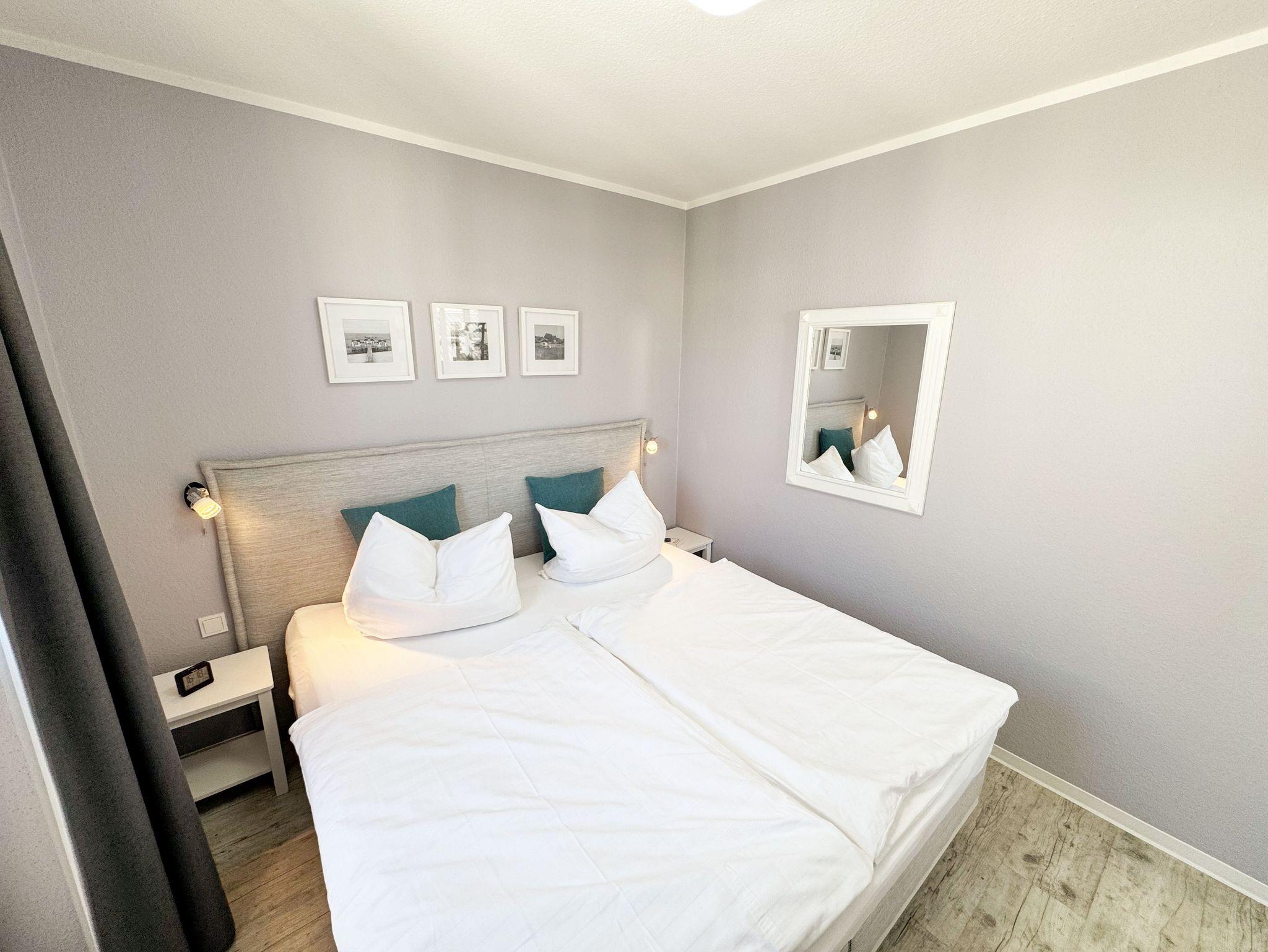 Die Nichtraucherwohnung 31 befindet sich im 2. Obergeschoss und ist ca. 40 m² groß. Sie ist in einem modernen Design hell und Allergiker freundlich gestaltet und komfortabel für max. 2 Personen + 1 Kleinkind bis 3 Jahre im Kinderreisebett eingerichtet. Der freundliche Eingangsbereich bietet einen deckenhohen Einbauschrank mit viel Platz für Ihre Kleidung und einem sehr großen Spiegel. Außerdem finden Sie hier eine Schuhablage mit Sitzbank. Im lichtdurchfluteten Wohnbereich lässt es sich nach einem erlebnisreichen Urlaubstag wunderbar relaxen, hier finden Sie eine hochwertige Couch, einen Couchtisch, eine Leselampe, einen Essbereich mit 2 bequemen Freischwingstühlen sowie einen Smart-TV mit Sky (Auswahl von Sport, Film, Dokumentation) und ein CD-Radio. Mit einem spannenden Buch (eine Auswahl von Büchern finden Sie in der Wohnung) oder einem guten Glas Wein können Sie den Tag ausklingen lassen. Auch im Urlaub brauchen Sie auf einen WLAN-Zugang (20 Mbit) nicht verzichten, denn dieser ist für Sie inklusive. Vom Wohnbereich gelangen Sie auf den ca. 12 m² großen und bestuhlten Balkon (Nordost), welcher Sie zum sonnigen Frühstück oder zur Entspannung auf den bequemen Sonnenliegen einlädt. Die offene und moderne Küchenzeile ist mit allem Komfort und hochwertigen Elektrogeräten ausgestattet. Dazu gehören Mikrowelle, Backofen, Induktionskochfeld, Geschirrspüler, Kühlschrank mit Gefrierfach, Toaster, Wasserkocher, Dolce Gusto Maschine, Kaffeemaschine und diverse Küchenutensilien. In dem geschmackvoll eingerichteten Schlafzimmer können Sie in dem Boxspringbett (1,80m x 2,00m) mit komfortablen Topper und Nachttischablagen wunderbar neue Energie tanken. Für einen erholsamen Schlaf sorgt hier ein Verdunkelungsvorhang. Das innenliegende Bad, welches durch die Beleuchtung sehr hell erscheint, ist komplett eingerichtet. Es beinhaltet neben Waschbecken mit Unterschrank, eine Dusche mit sehr niedrigem Einstieg, ein WC, einen separaten Badschrank, ein eingebautes Radio, einen Föhn, einen Kosmetikspiegel, einen Handtuchheizkörper sowie große Ablageflächen. Alle Fenster sind mit Plissees versehen worden. Die Wohnung verfügt über einen PKW-Stellplatz in der Schulstrasse, ca. 4 Gehminuten entfernt. Zusätzlich haben Sie einen Waschmaschinen/Trocknerraum im Haus den Sie exklusive nutzen können. Haustiere sind in der Wohnung nicht erlaubt. Die Erstausstattung eines Wäschepaketes (komplette Bettwäsche, 1 Duschhandtuch, 2 kleine Handtücher, 2 Geschirrhandtücher) können Sie bis 14 Tage vor Anreise gegen einen Aufpreis dazu buchen oder durch eigene ergänzen.