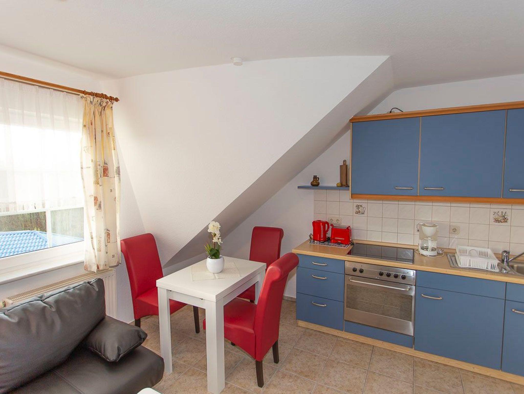 Die Zweiraumwohnung bestehend aus einem Wohnzimmer mit einer offenen Küchenzeile (Wasserkocher, Toaster, Ceranfeld, Backofen, Eierkocher), einem Schlafzimmer mit einem Doppelbett und einem Bad mit Dusche/WC. Ein Parkplatz, sowie Fahrradabstellmöglichkeiten befinden sich direkt am Haus.