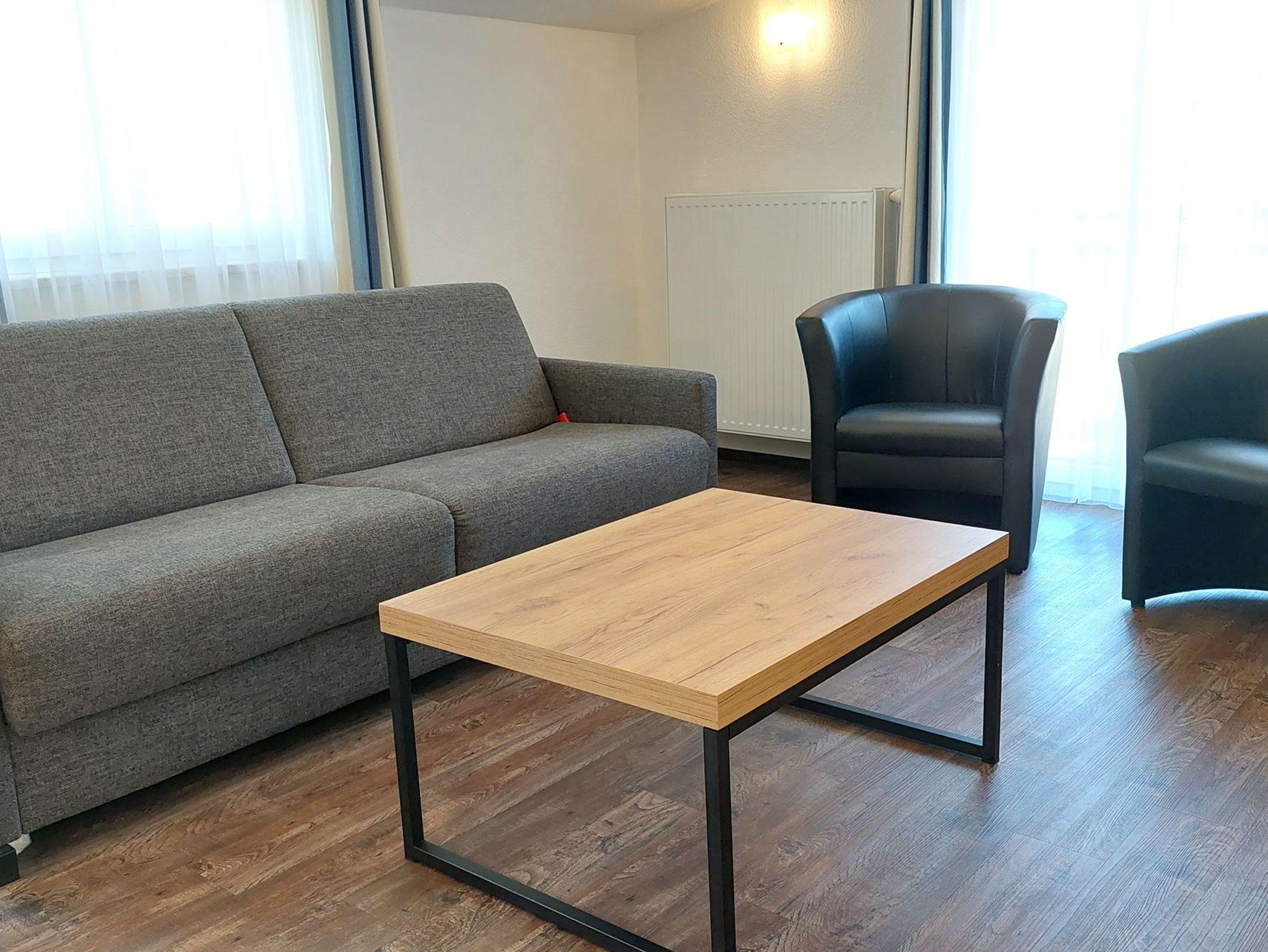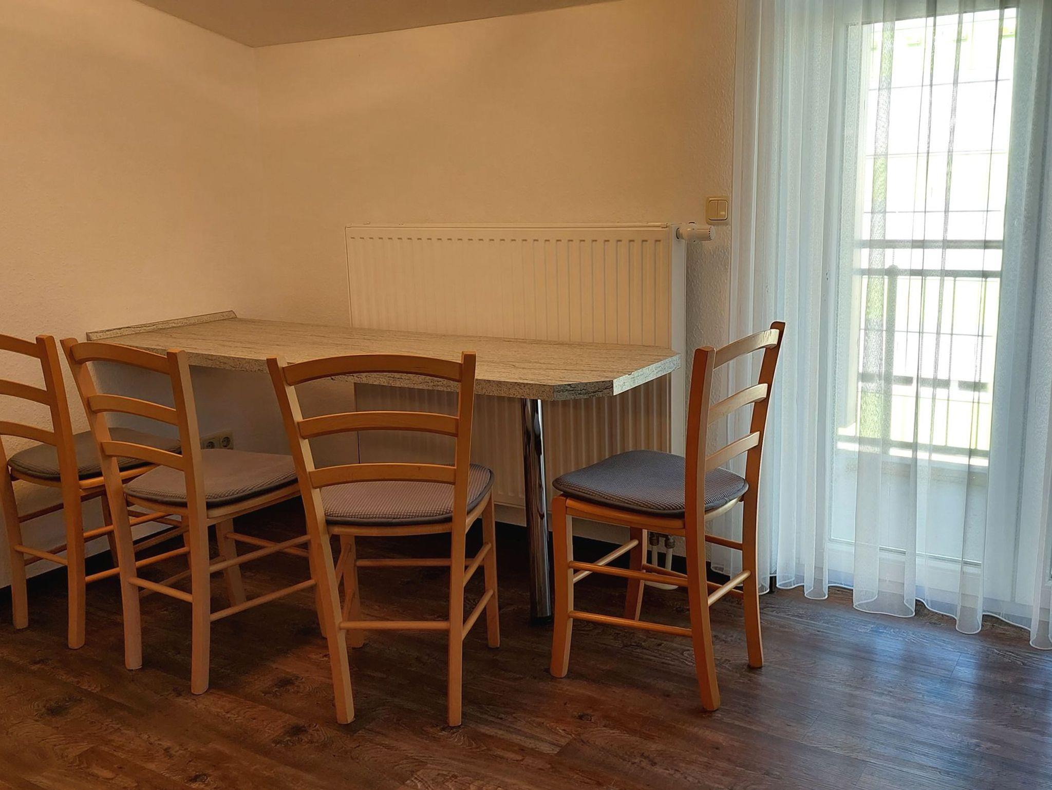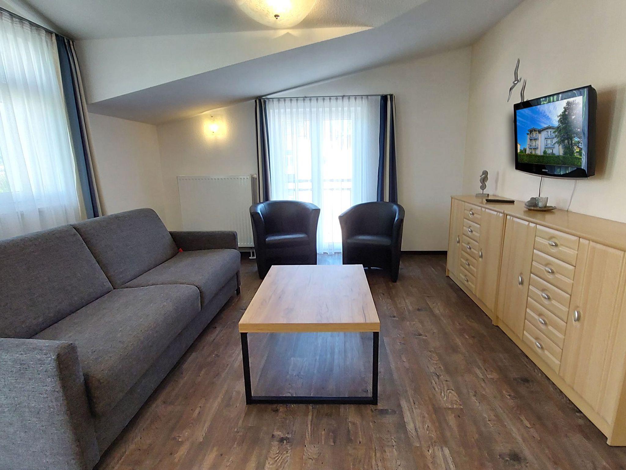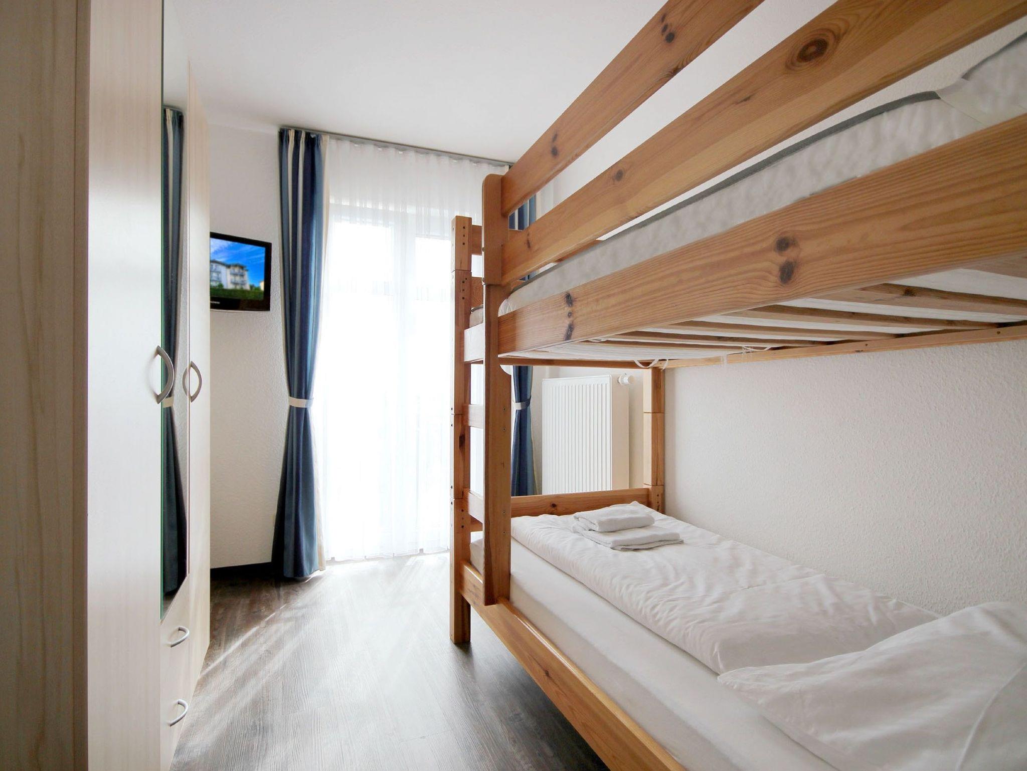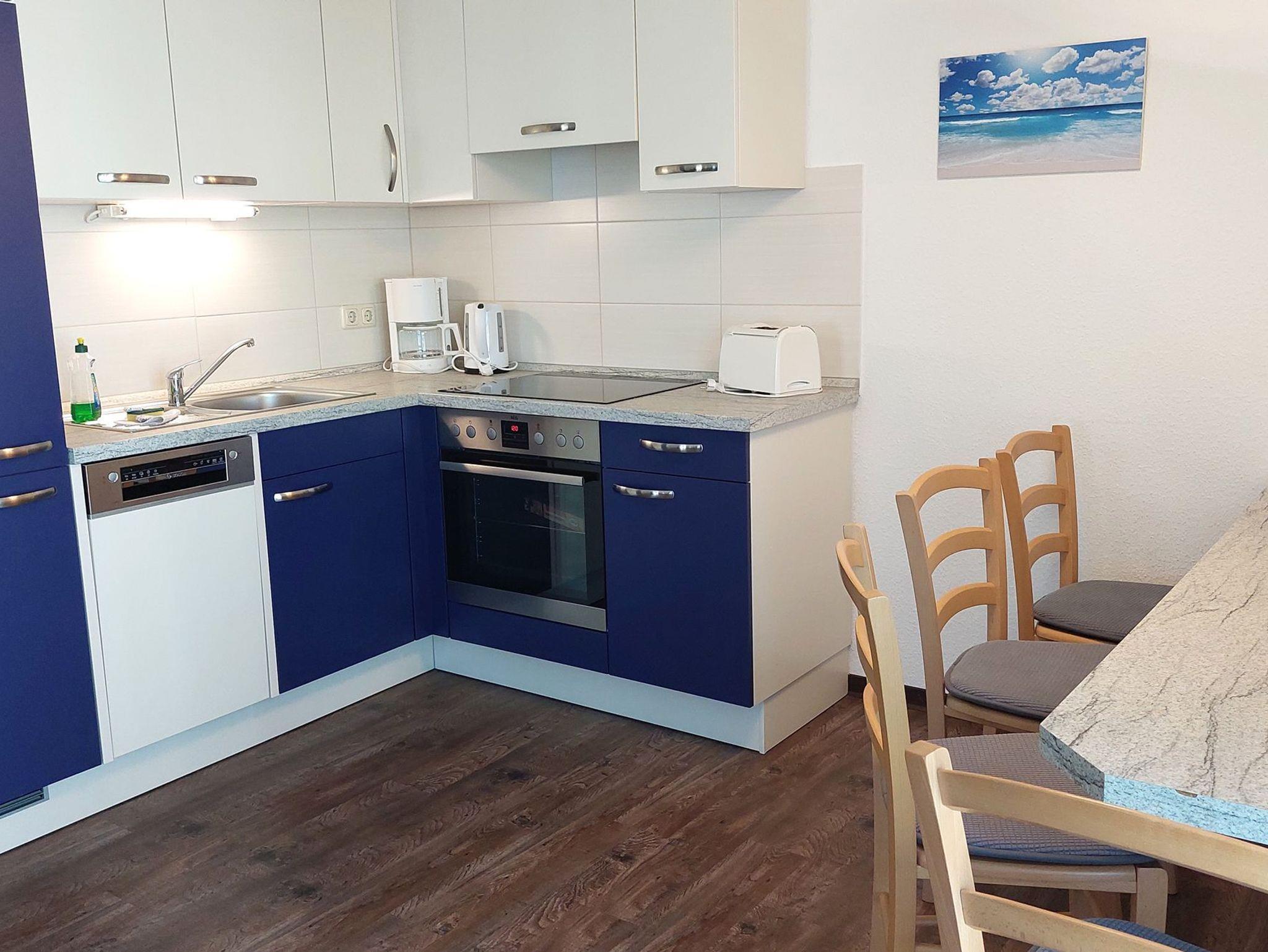 Diese freundliche Wohnung ist aufgeteilt in einen Wohnraum mit Balkon und integrierter Küchenzeile, zwei Schlafzimmer und ein Bad mit Dusche, Waschtisch und WC. Das Wohnzimmer begrüßt Sie mit einem Schlafsofa und Sessel sowie Flachbild-TV. Das Hauptschlafzimmer verfügt über ein Doppelbett (1,80m x 2m) sowie einen Kleiderschrank. Der zweite Schlafraum ebenso mit Balkon begrüßt Sie mit einem Etagenbett, Kleiderschrank und TV. Die Küchenzeile ist mit Backofen, Geschirrspüler, Cerankochfeld, Kühlschrank mit kleinem Gefrierfach, Cerankochfeld, Mikrowelle, Kaffeemaschine, Wasserkocher und Toaster ausgestattet. Highlights: Kostenfreies WLAN sowie ein frei wählbarer PKW-Stellplatz direkt am Haus.