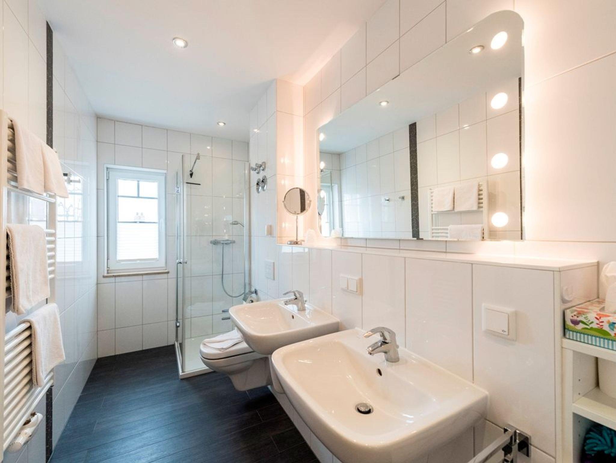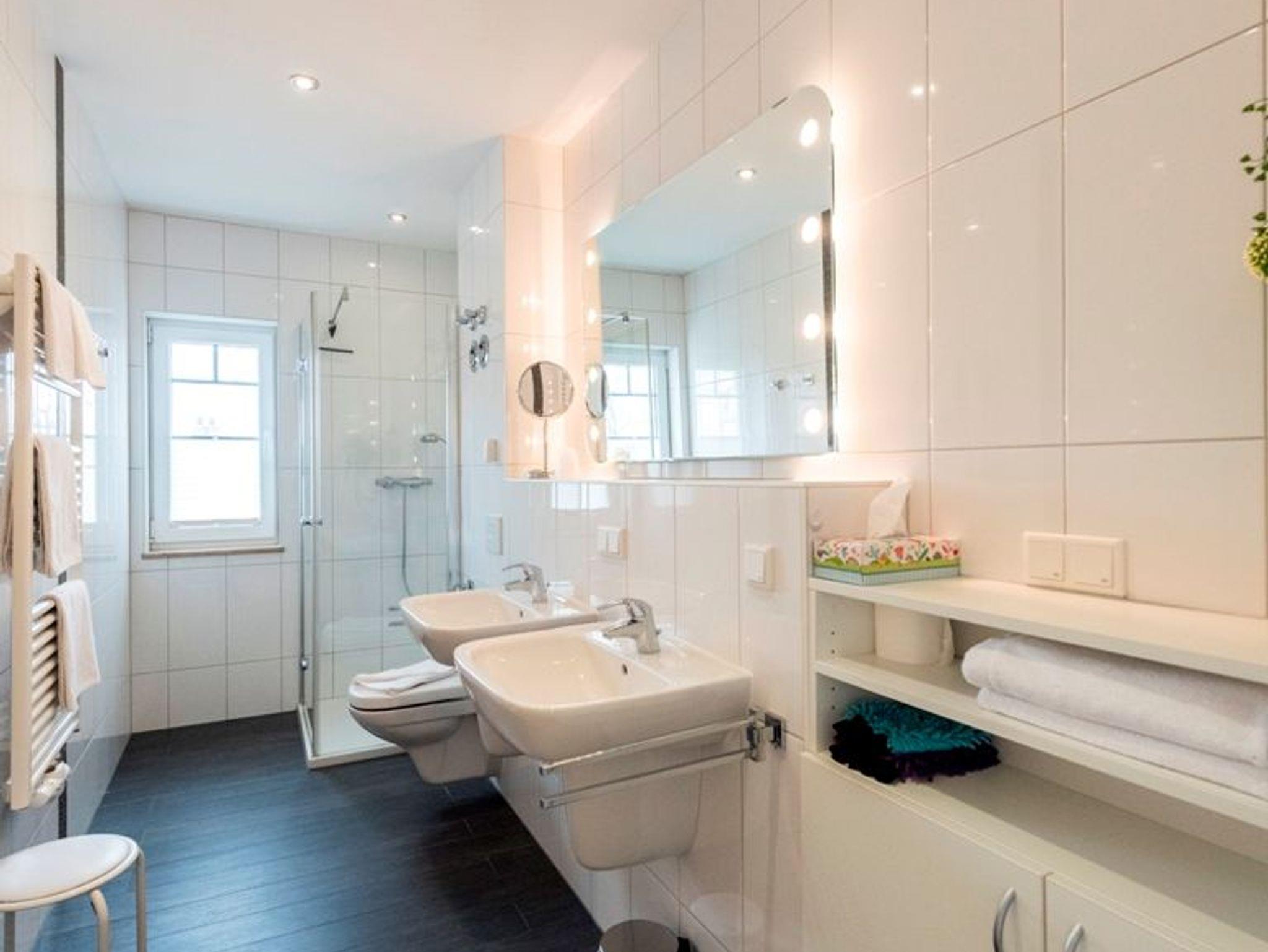 * Bad mit großer ebenerdiger Dusche, WC und Föhn