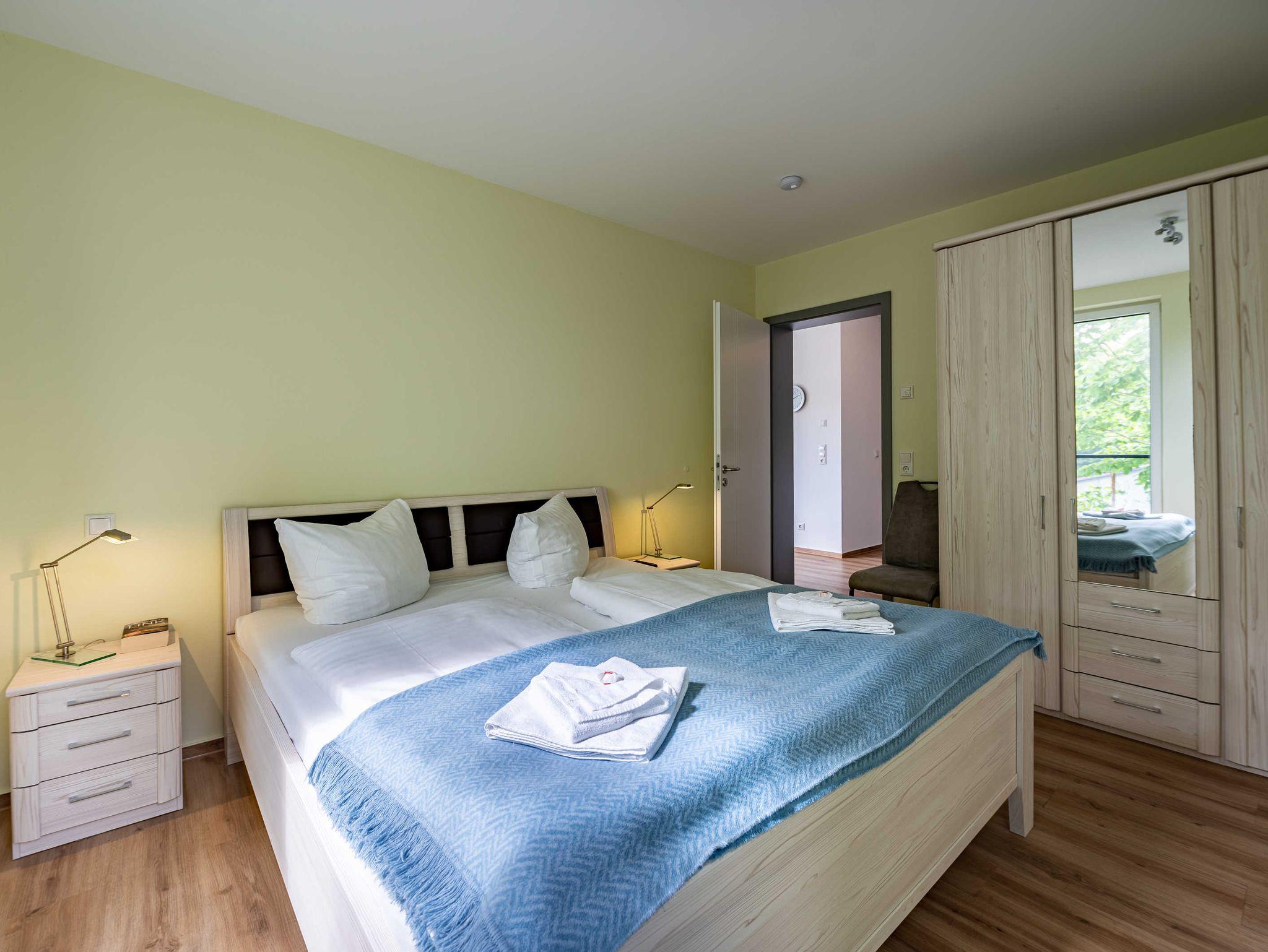 Schlafen 1: Doppelbett mit Komforthöhe, verstellbar, Fernseher, Verdunkelungsmöglichkeit, Insektenschutz