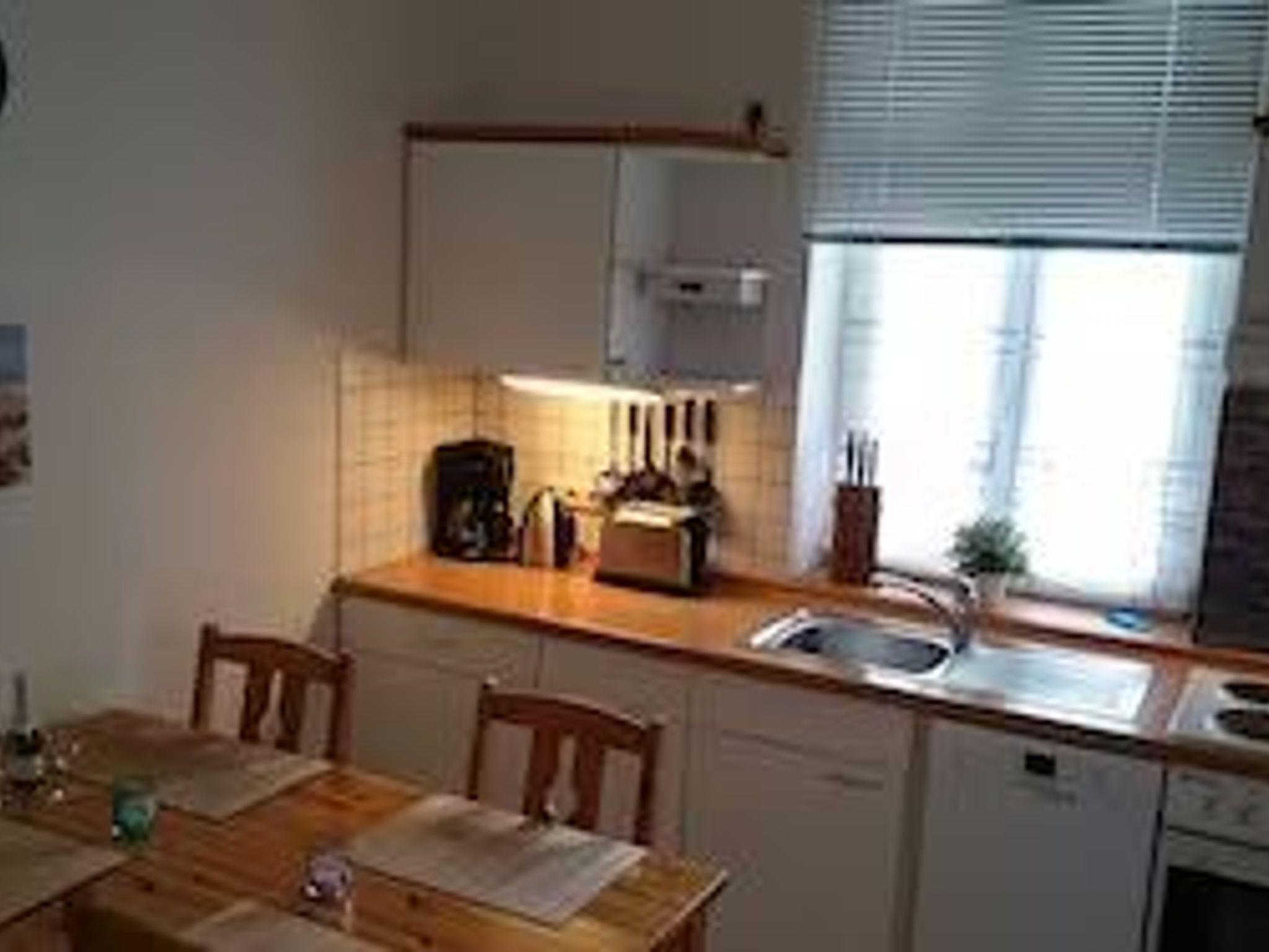 Über eine Treppe gelangt man hinunter ins Erdgeschoss mit Wohnküche und Bad. Die Einbauküche im Erdgeschoss ist komplett ausgestattet mit Kühlschrank, Elektroherd mit Backofen, Kaffeemaschine, Toaster, Wasserkocher, Geschirrspülmaschine sowie umfangreichem Geschirr. Der Esstisch bietet ausreichend Platz, um die kulinarischen Highlights der Insel 4 Personen servieren zu können. Ein Kinderhochstuhl findet zusätzlich Platz und steht ohne Aufpreis griffbereit zur Seite.