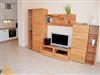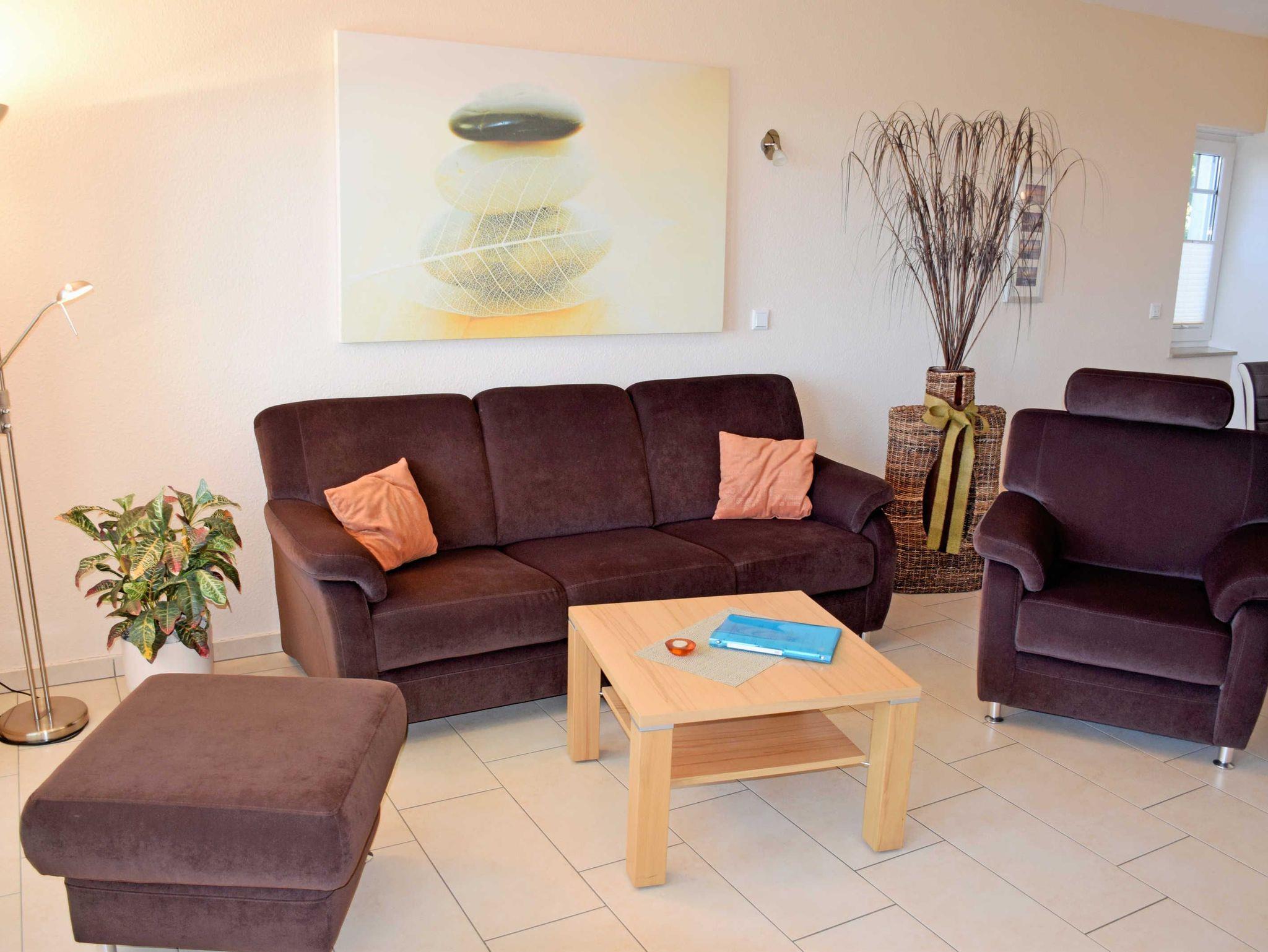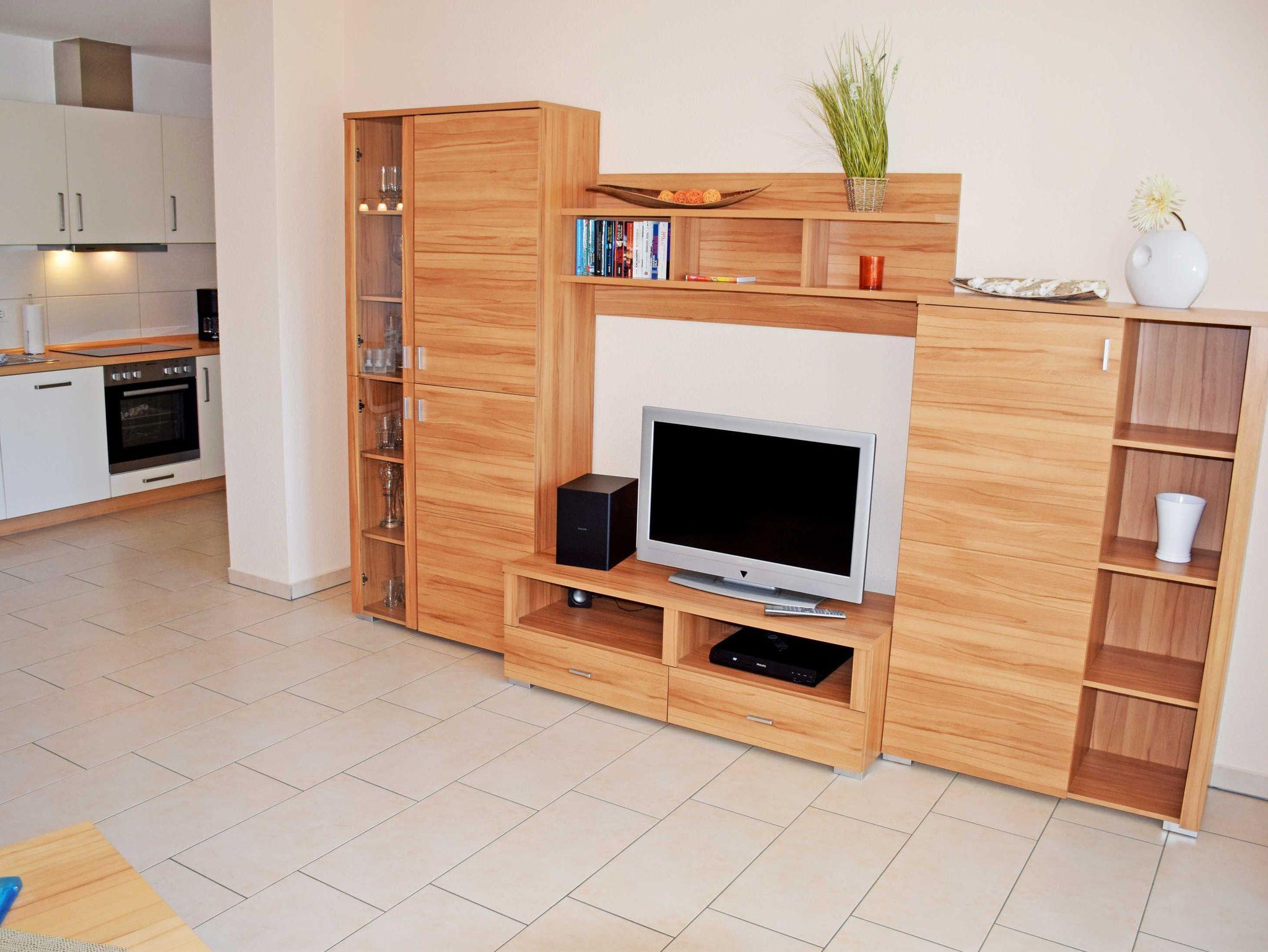 - Wohnbereich mit Couch, Sessel mit Hocker, Couchtisch, Wohnwand mit LED-TV, Mini-Stereoanlage und DVD-Player,