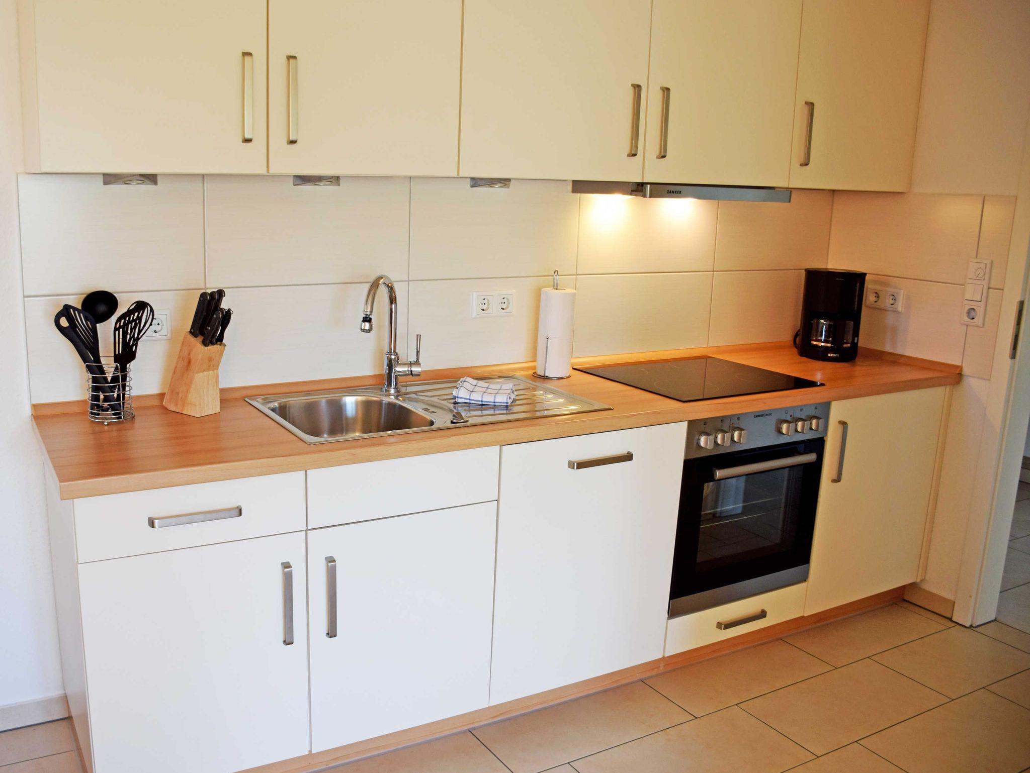 - Küchenzeile mit Geschirrspüler, Ceranfeld, Backofen, Kühlschrank mit Gefrierfach, Kaffeemaschine, Wasserkocher, Eierkocher, Toaster und div. Küchenutensilien