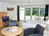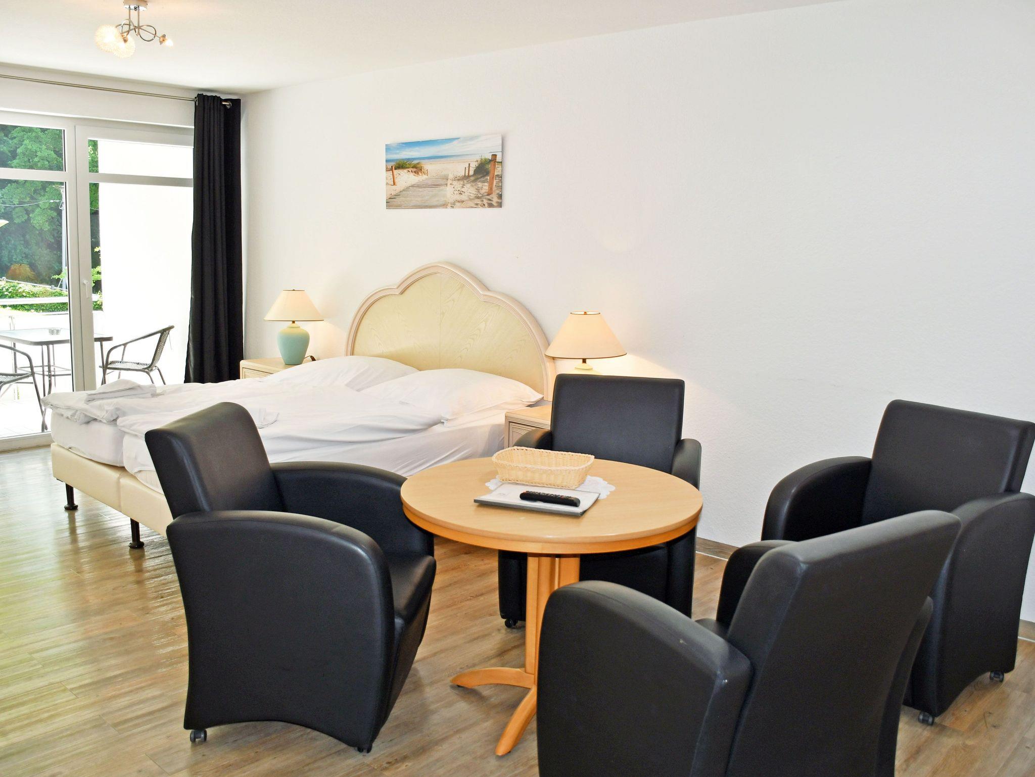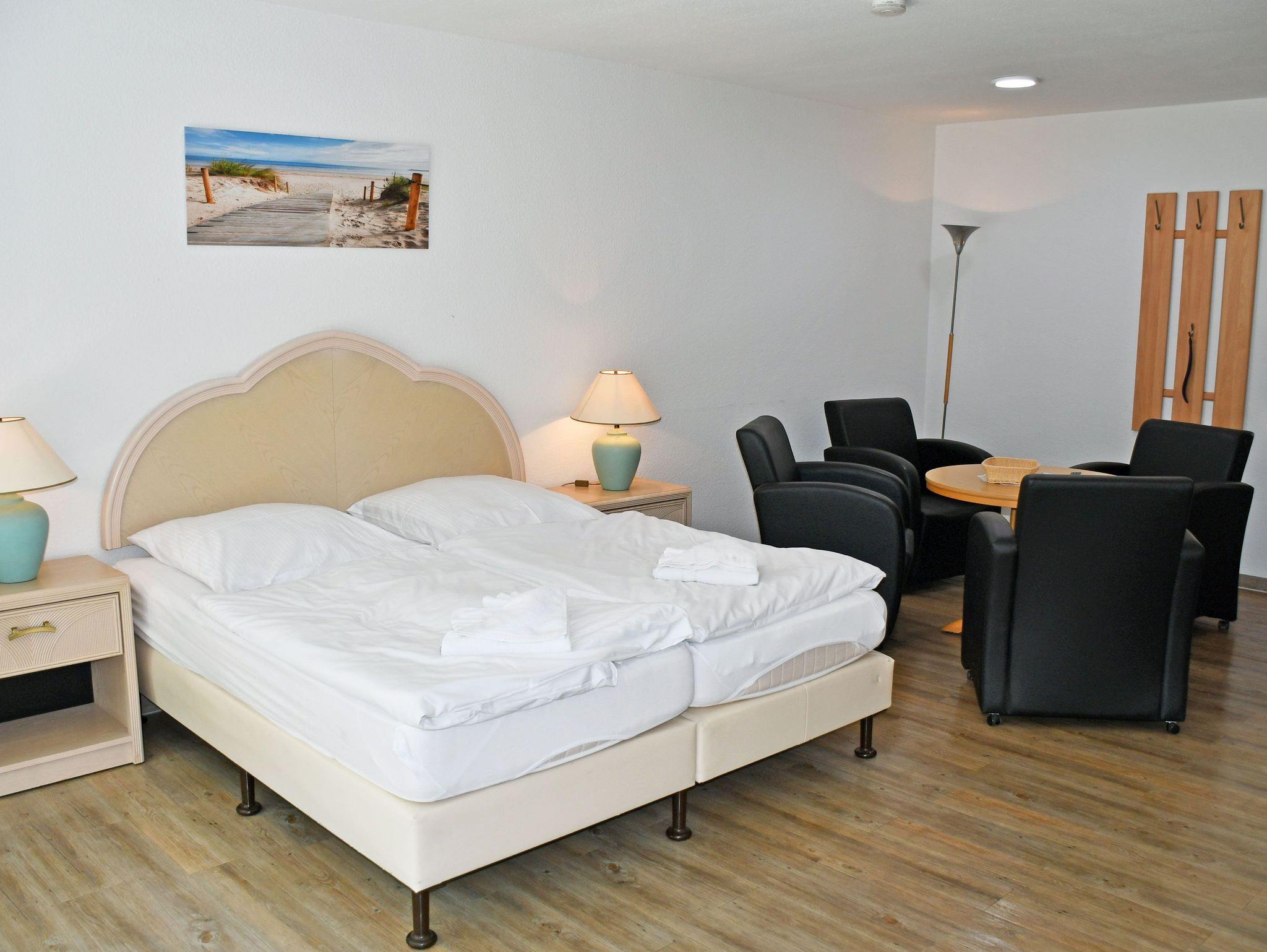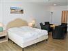 kombinierter Wohn-/Schlafraum mit Doppelbett (180 x 200 cm), Nachttischen, großem Kleiderschrank, Tisch mit 2 Ledersesseln, Anrichte mit TV, Kofferablage