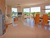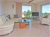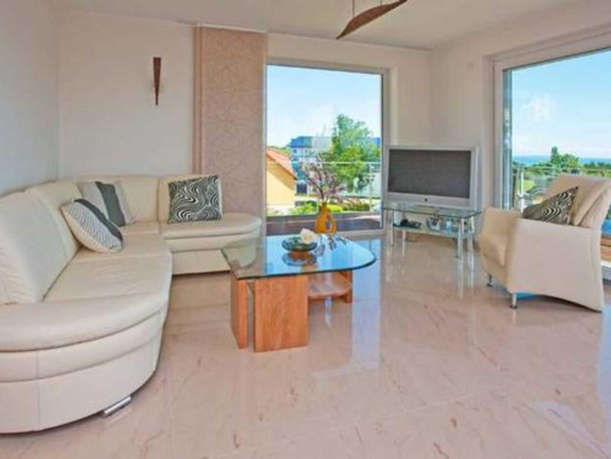 Eine Sitzgruppe in weißem Leder ist mit Blick auf die Ostsee ausgerichtet.