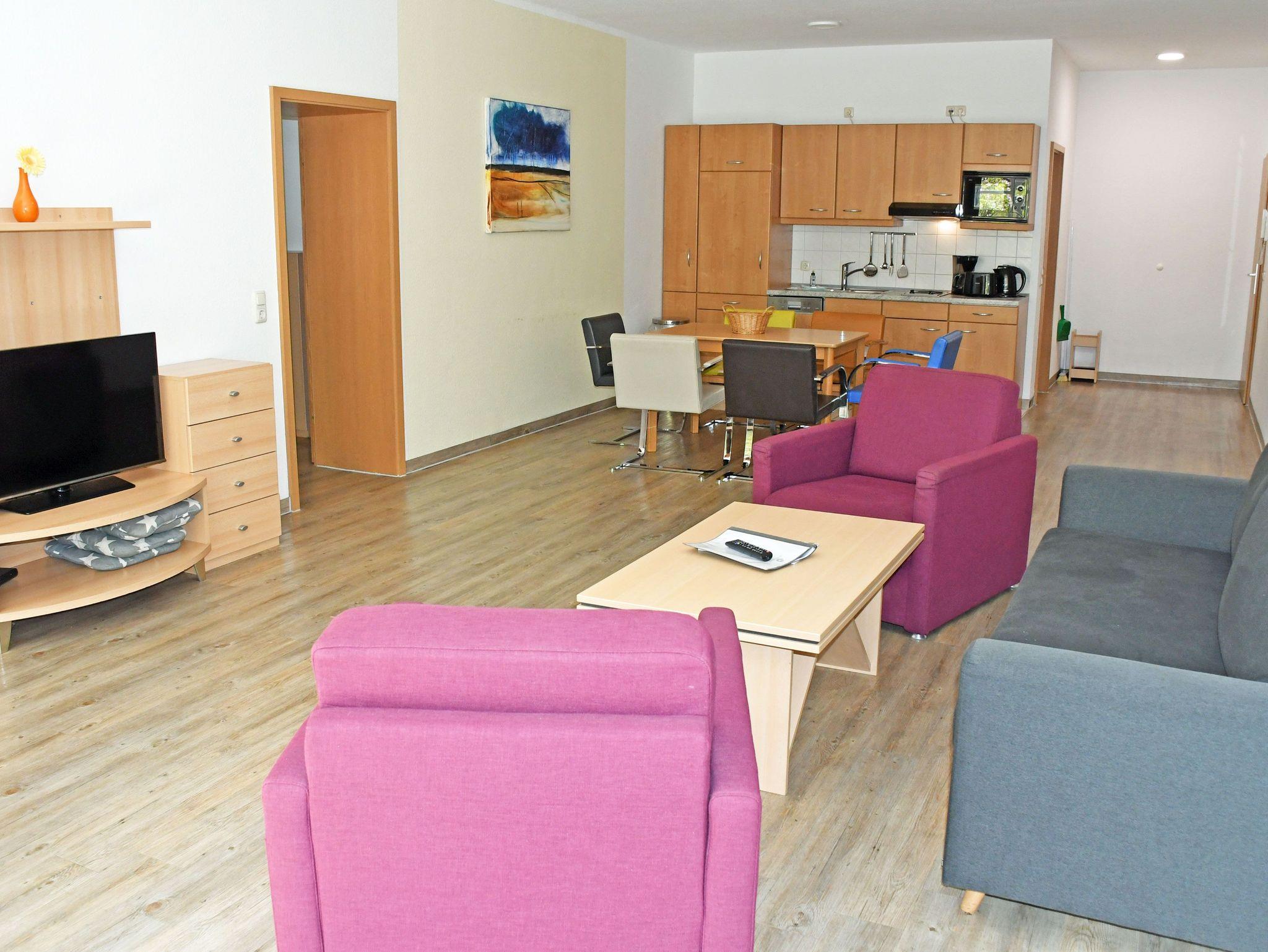Wohnbereich mit ausziehbarer, moderner Doppelbettschlafcouch (168 x 200 cm), 2 Sesseln, Couchtisch, Anrichte mit Flat-TV (integr. Radiofunktion) und Esstisch mit 4 Stühlen
